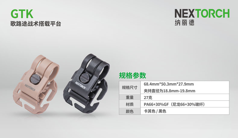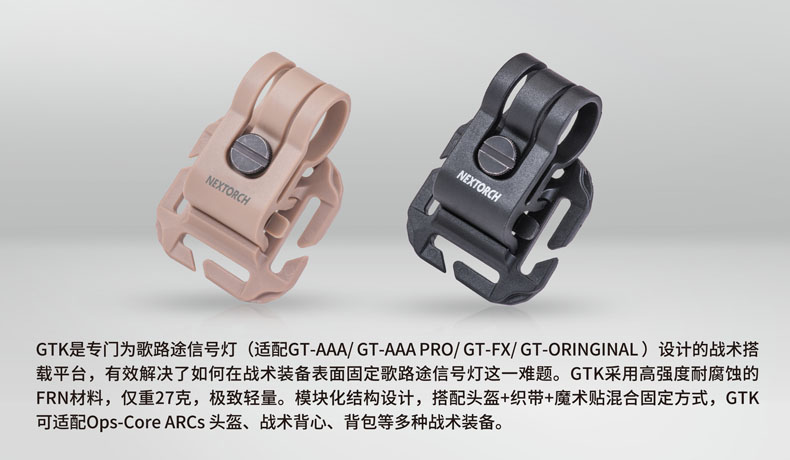GTK是专门为歌路途信号灯(适配GT-AAA/ GT-AAA PRO/ GT-FX/ GT-ORINGINAL )设计的战术搭载平台,有效解决了如何在战术装备表面固定歌路途信号灯这一难题。GTK采用高强度耐腐蚀的FRN材料,仅重27克,轻量简便。模块化结构设计,搭配头盔+织带+魔术贴混合固定方式,GTK可适配Ops-Core ARCs 头盔、战术背心、背包等多种战术装备。