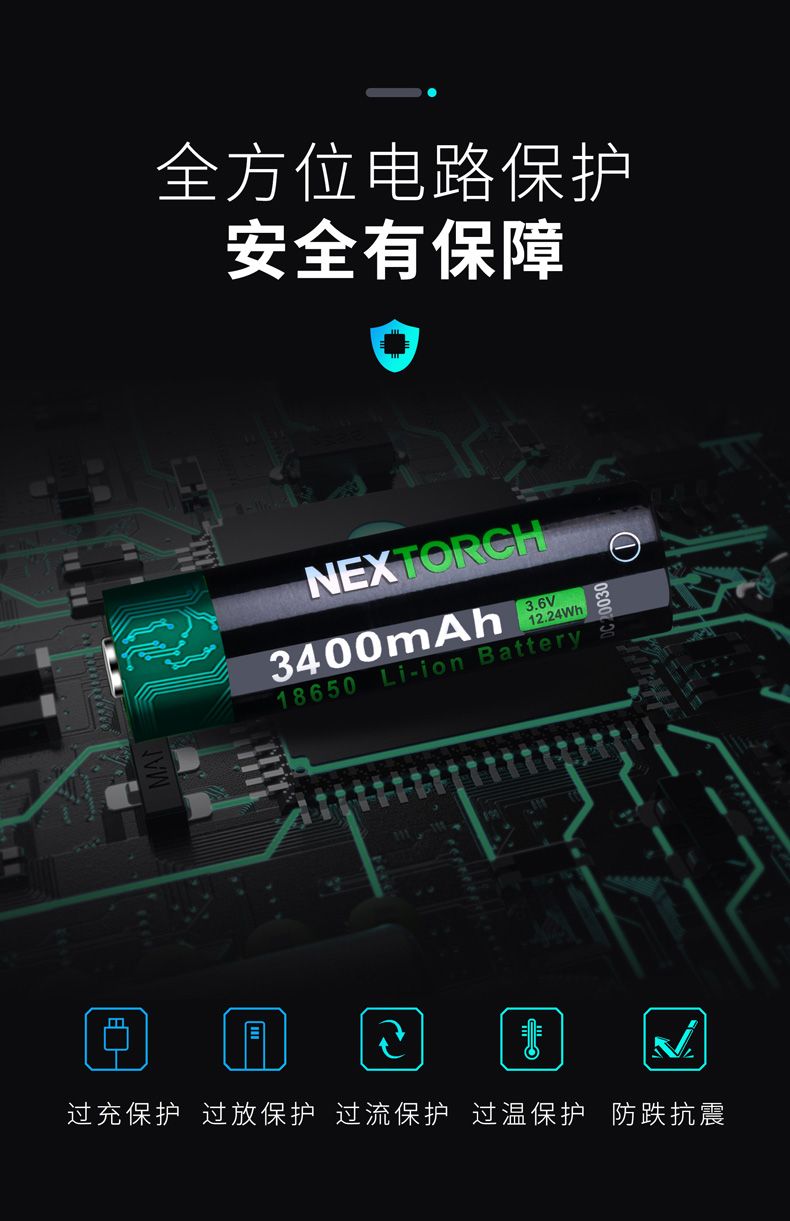 NEXTORCH 3400mAh大容量USB直充18650电池,改变了传统电池的充电方式,一根USB线即可连接电脑、座充、车充、移动电池包等设备为其充电,同时兼容18650充电器充电;具备防过充、防过放、防过热三重电路保护,使用更安全可靠;采用紧凑型结构设计,可适配市面绝大多数18650电筒。 *纳丽德电池仅供手电产品专用