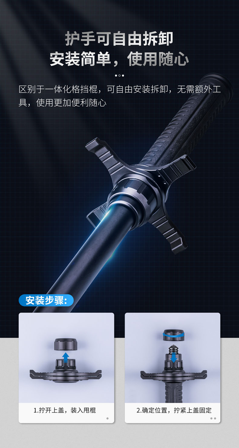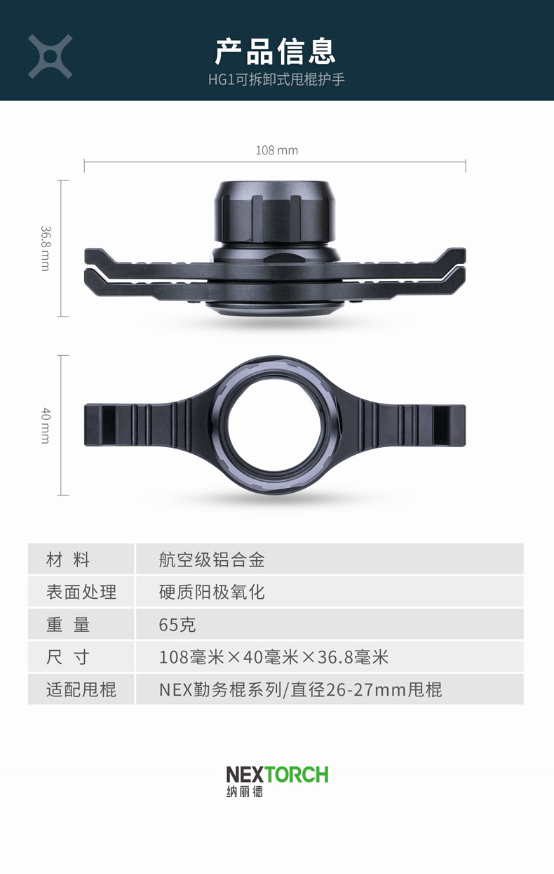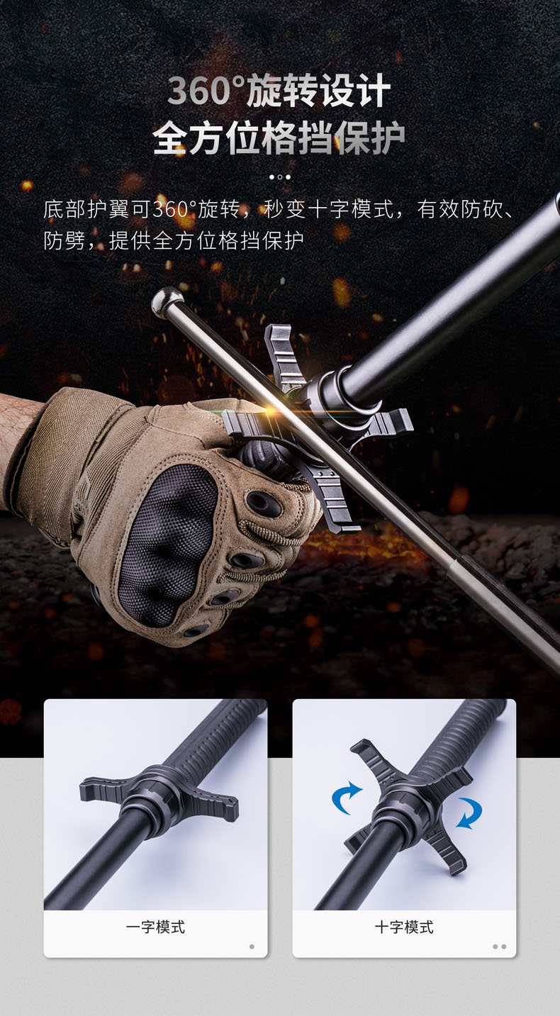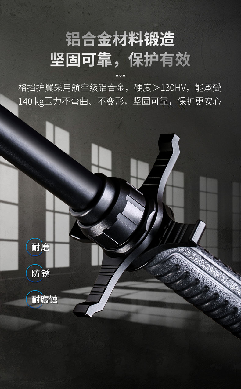 可拆卸式甩棍护手,挡刀、防砍、防脱,为拓展勤务棍用途而来;区别于一体化挡刀护手,HG1可自由安装拆卸,无需额外工具,使用便利;底部护翼360°旋转设计,轻轻一推秒变十字模式,有效防砍、防劈,提供全方位格挡保护;挡刀护翼采用铝合金锻造而成,硬度>130HV,能承受140 kg压力不弯曲、不变形,坚固可靠;适配NEX勤务棍全系列或直径26-27毫米的甩棍。