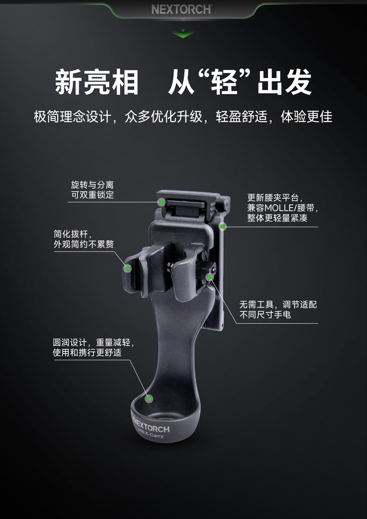 纳丽德X-Carry系列模块化战术套具V55/55L,专为手电的随身携行而来,极简轻量减负设计,拥有全新模块化闪切换系统和带锁快拔功能。