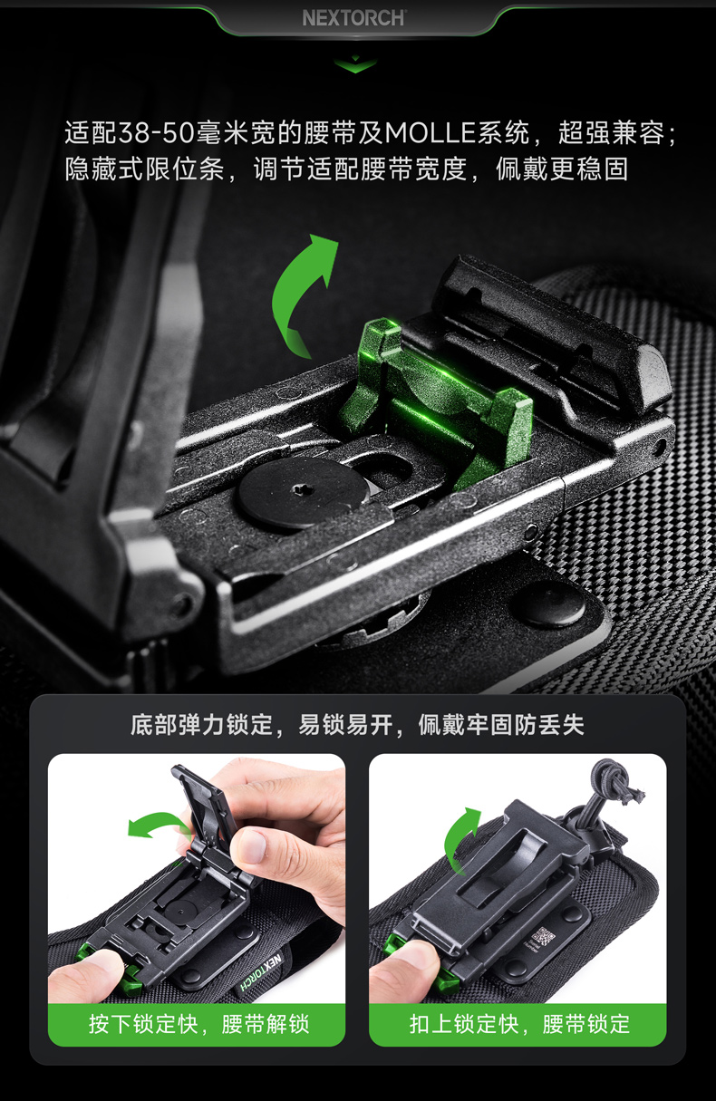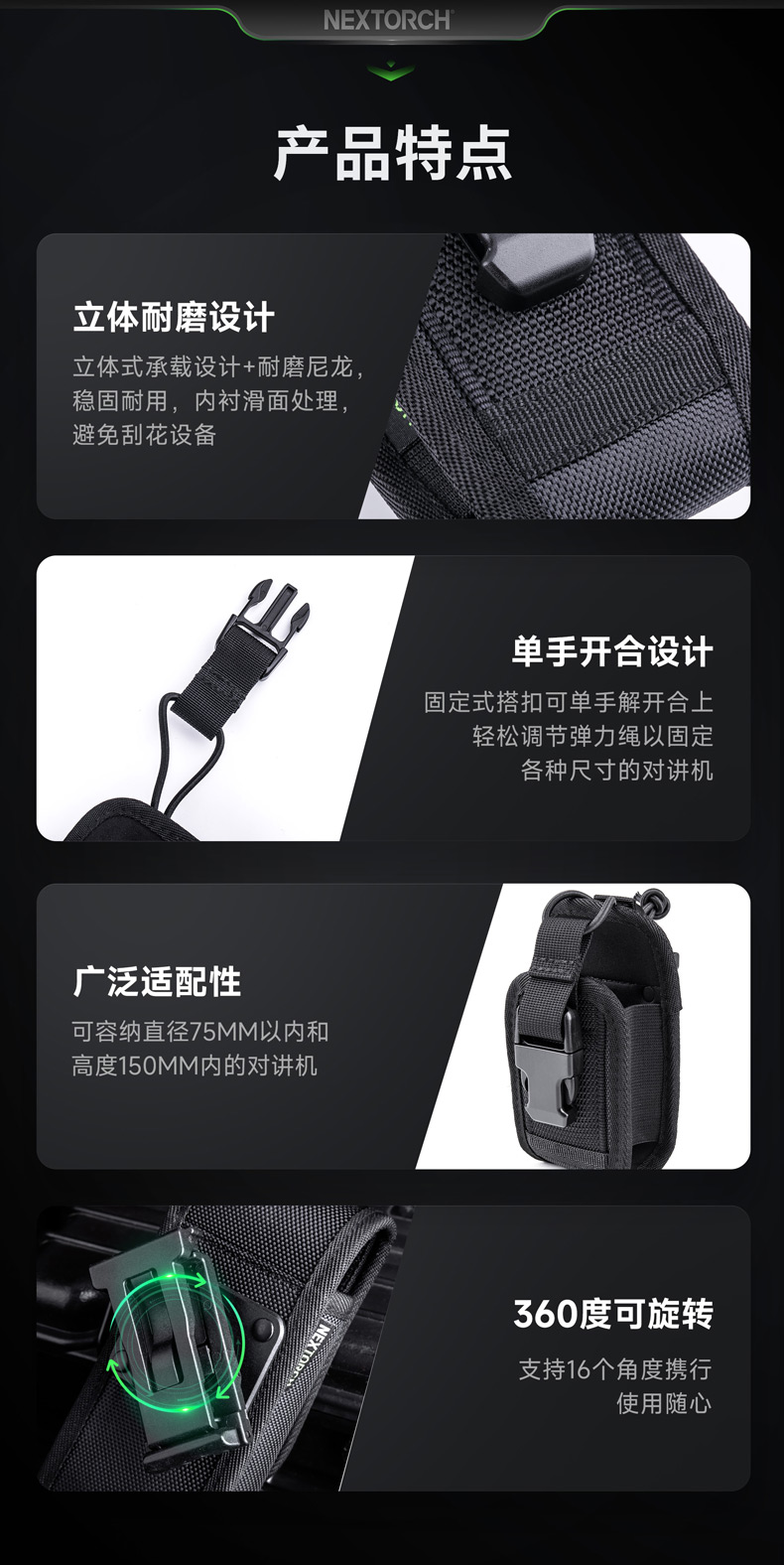 纳丽德X-Carry系列模块化战术套具V24对讲机套,适合直径75毫米、长度150毫米以内的对讲机使用,极简轻量减负设计,拥有全新模块化快切系统。主体采用优质尼龙面料,耐磨防撕裂,轻便耐用;高弹力橡筋+可调松紧扣可根据大小紧紧加固;操作简单,单手开合;兼容宽度38-50毫米的战术腰带及MOLLE系统,360度旋转设计,角度随心调节。