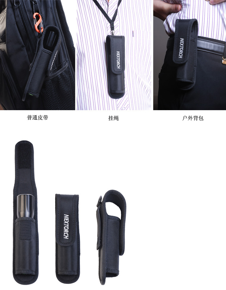 • 纳丽德电筒套 • 适合各种普通腰带 • 适用于各种户外背包携带 • V1适用于以下手电:TA30, TA15, TA5, PA5, P5双光源手电系列, TA40, myTorch 18650, myTorch 3AAA, myTorch RC 18650, myTorch RC 3AAA, myTorch XL, TA3, T6A, T6A LED, GT6A系列 • V2适用于以下手电: myTorch AA, myTorch 2AA, myTorch RC AA, myTorch RC 2AA, NEW STAR, K2