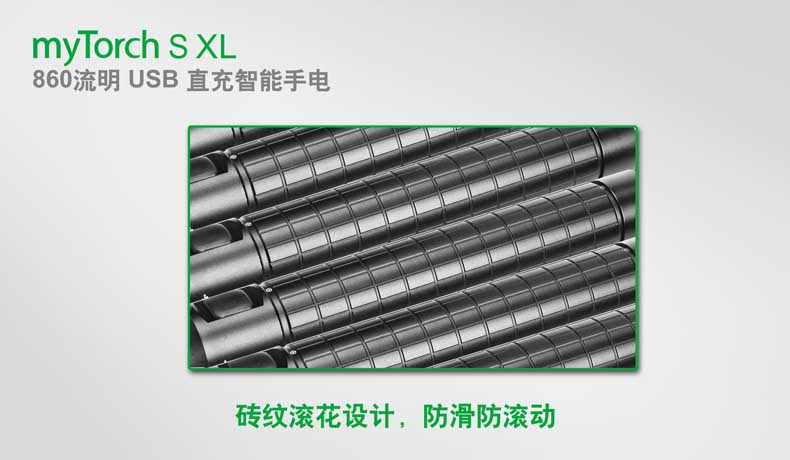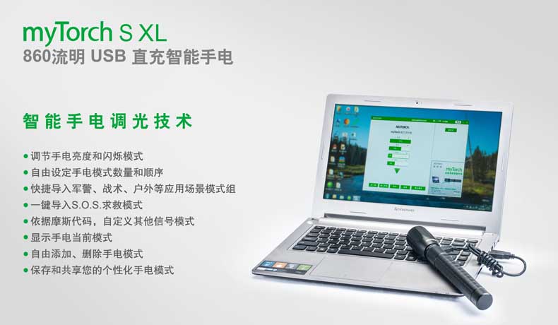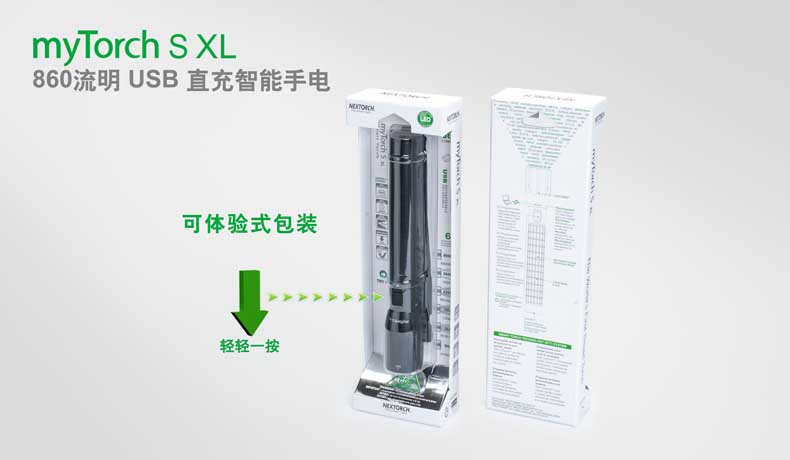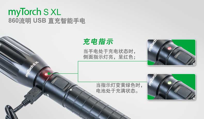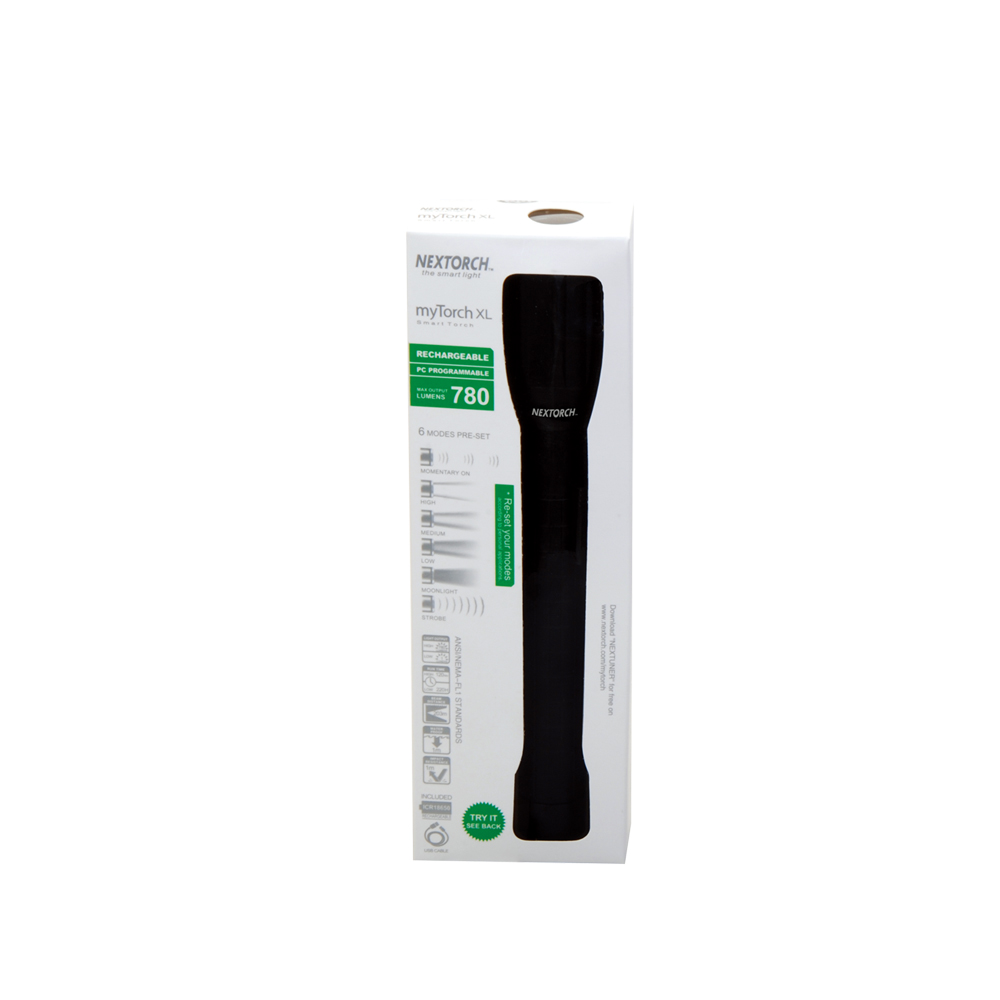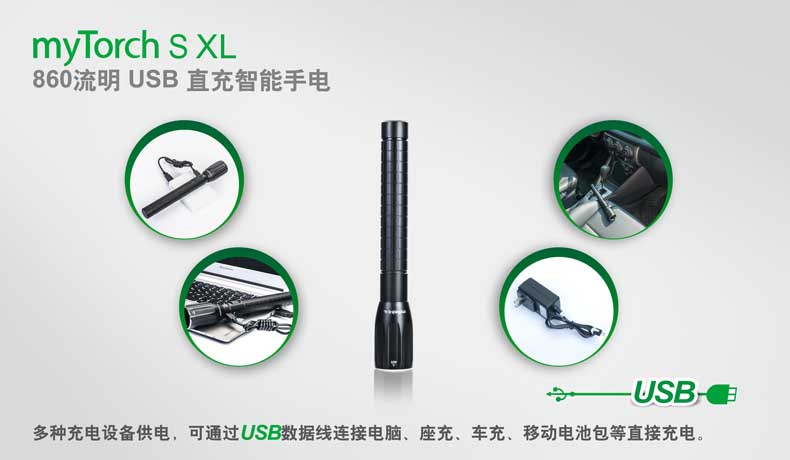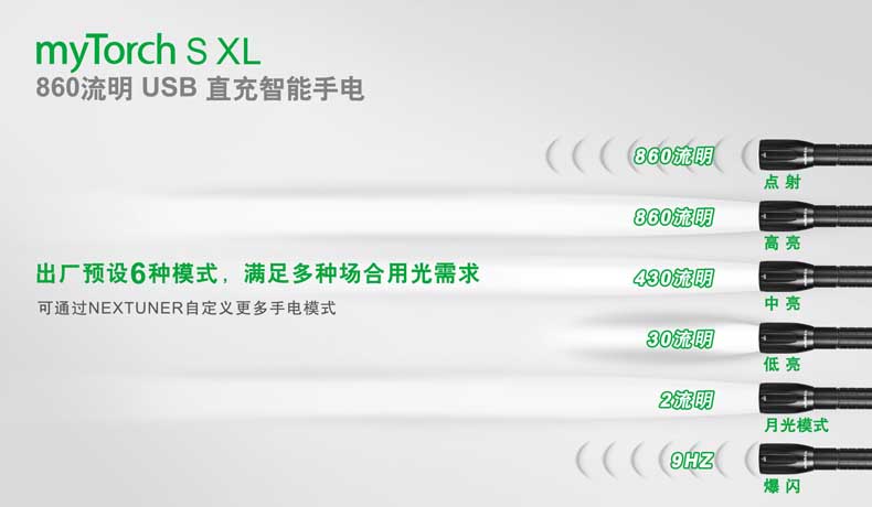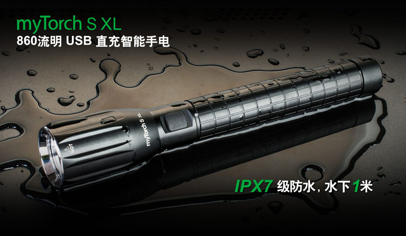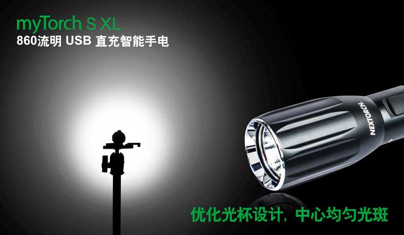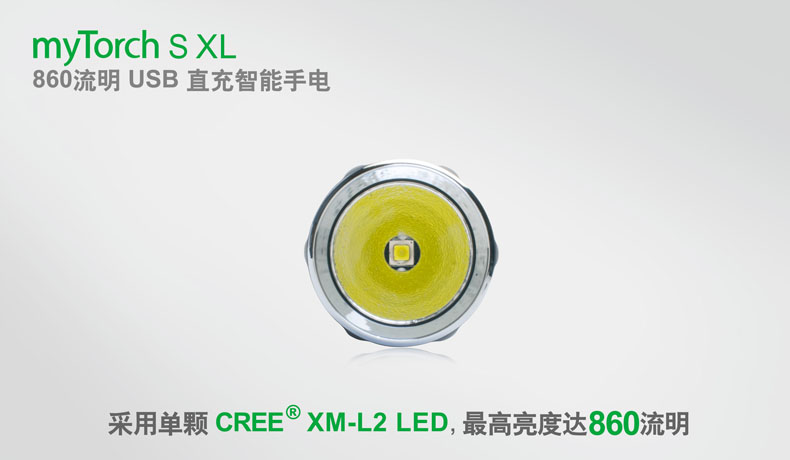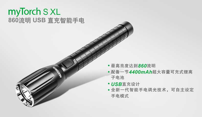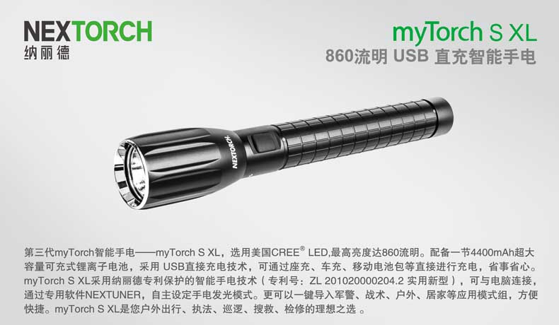 第三代myTorch智能手电——myTorch S XL,选用美国CREE® LED,最高亮度达860流明。配备一节4400mAh超大容量可充式锂离子电池,采用 USB直接充电技术,可通过座充、车充、移动电池包等直接进行充电,省事省心。myTorch S XL采用纳丽德专利保护的智能手电技术(专利号:ZL 201020000204.2 实用新型),可与电脑连接,通过专用软件NEXTUNER,自主设定手电发光模式。更可以一键导入军警、战术、户外、居家等应用模式组,方便快捷。myTorch S XL是您户外出行、执法、巡逻、搜救、检修的理想之选 。