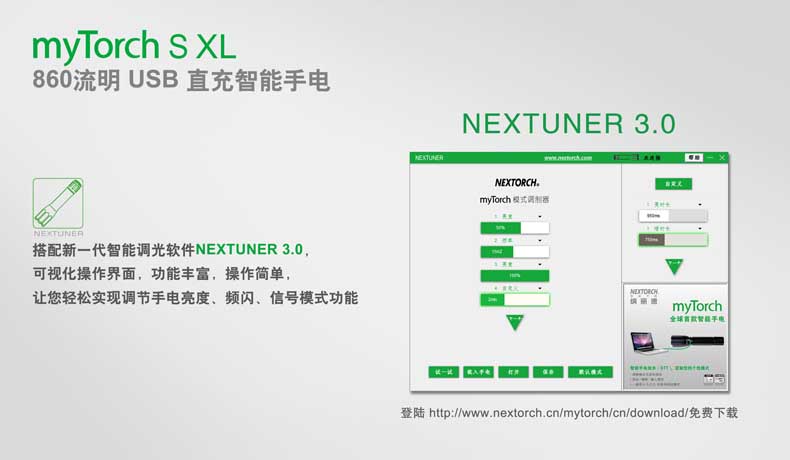NEXTUNER是纳丽德独创革命性"STT"智能手电技术的专用软件,用数据线把手电连接到电脑上,通过下载到电脑上的NEXTUNER,你可以自由调节手电的发光模式,设置个性化的闪烁模式。NEXTUNER使手电实现几乎无限的发光模式,给你带来无穷乐趣,创造光随心动的手电新"视"界。