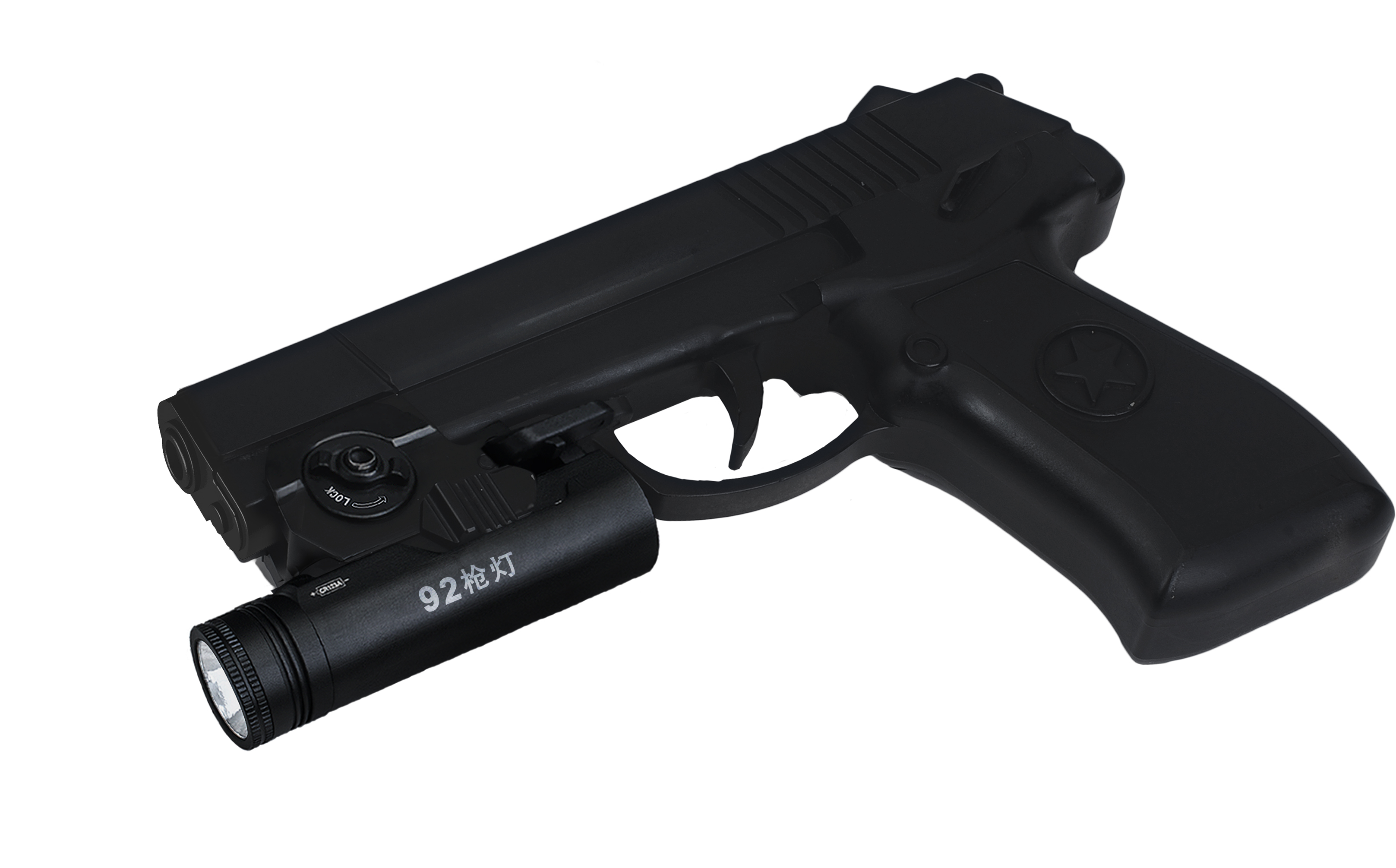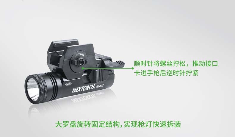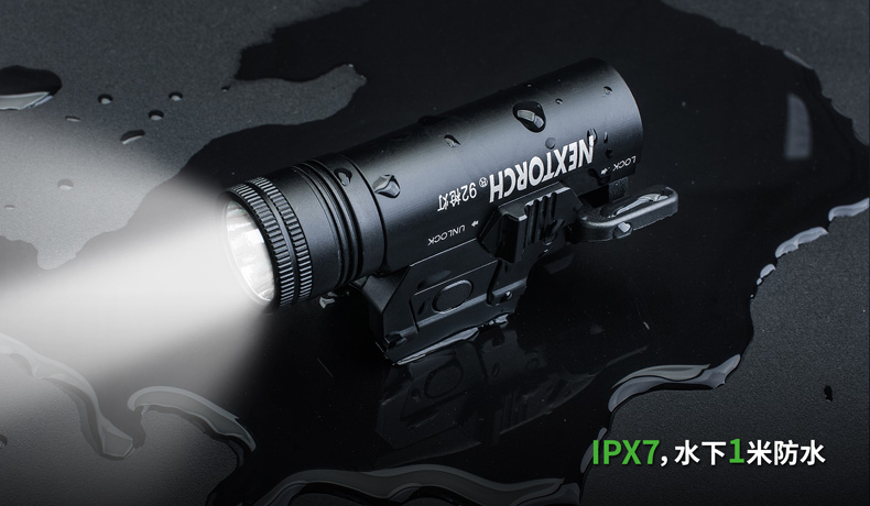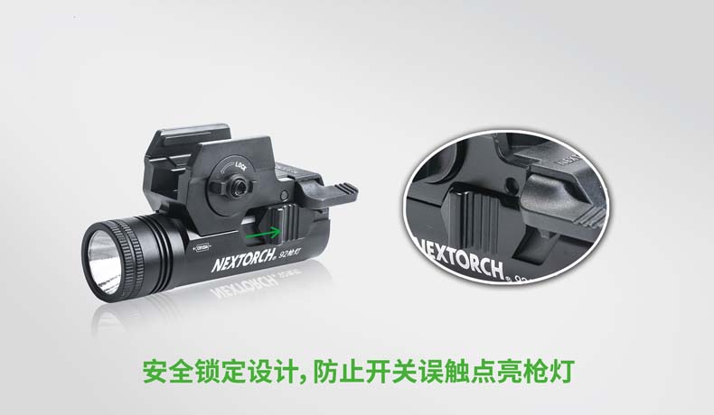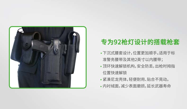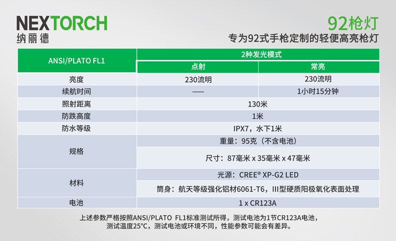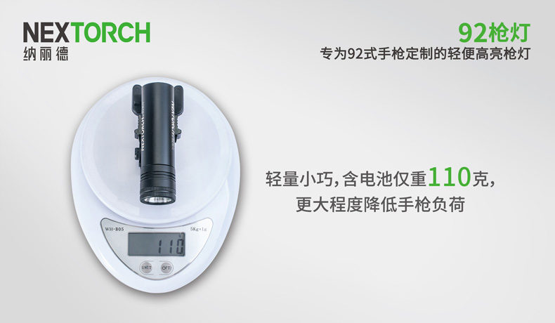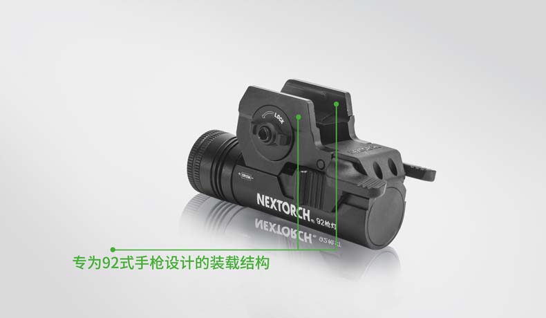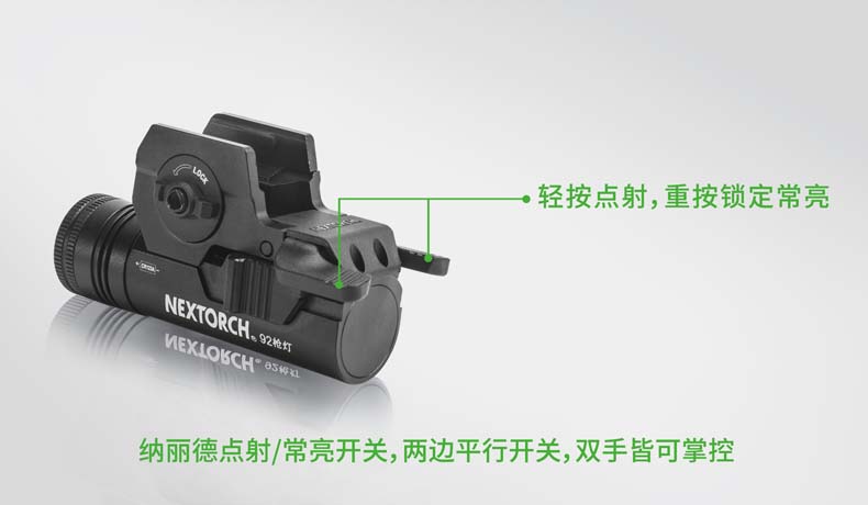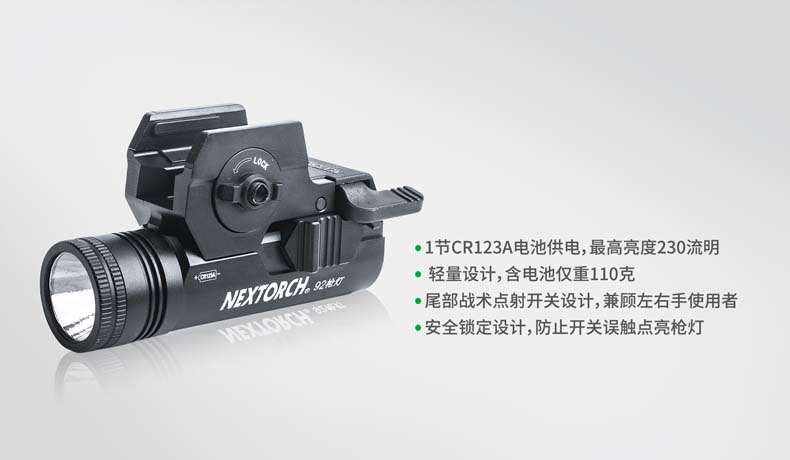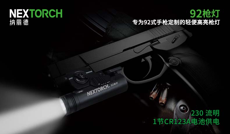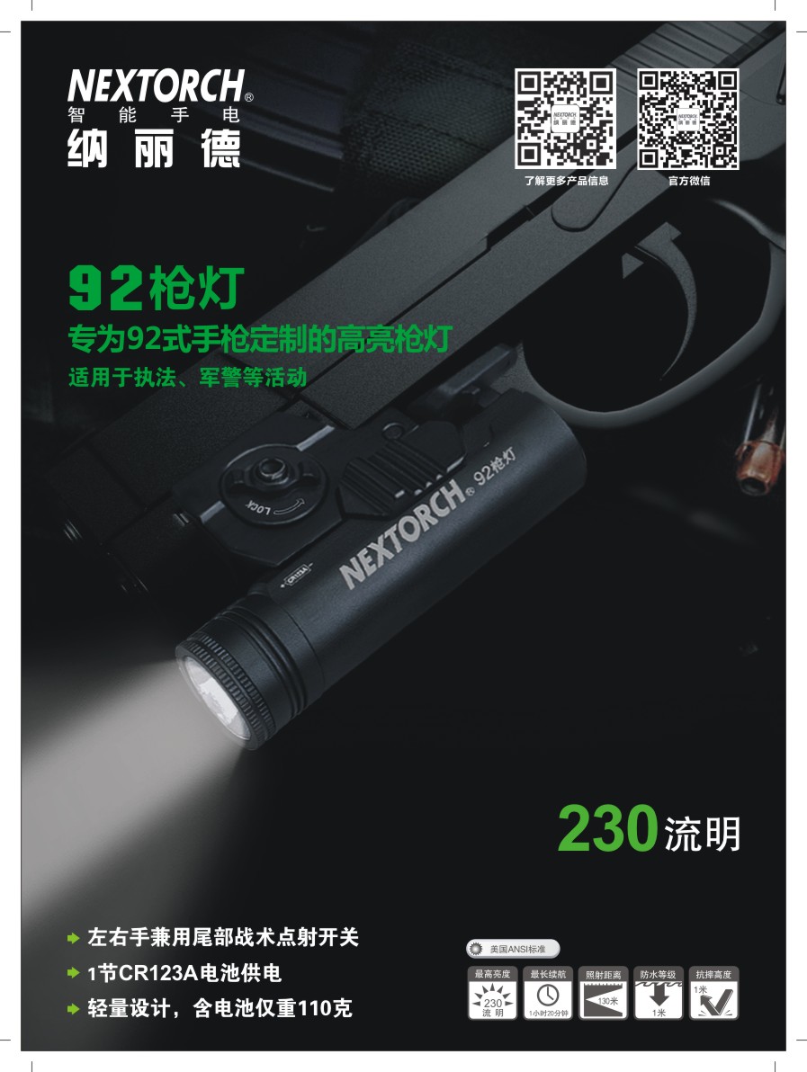 纳丽德92枪灯是一款专为92式手枪设计的轻便高亮枪灯。采用CREE® XP-G2 R5 LED,单节CR123A 电池供电,最高亮度230流明; 轻量设计,含电池仅重110克,提高使用舒适度;尾部点射/ 常亮开关设计,两边平行开关,左右手皆可轻松掌控; 大罗盘旋转固定结构,可实现枪灯快速拆装;安全 锁定设计,防止开关误触点亮枪灯; 纳丽德92枪灯是您执法巡逻、战术突击等活动的理想选择。