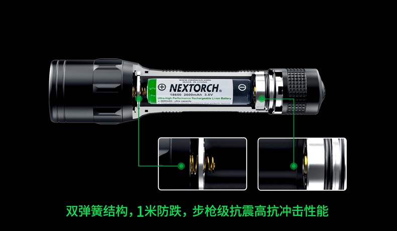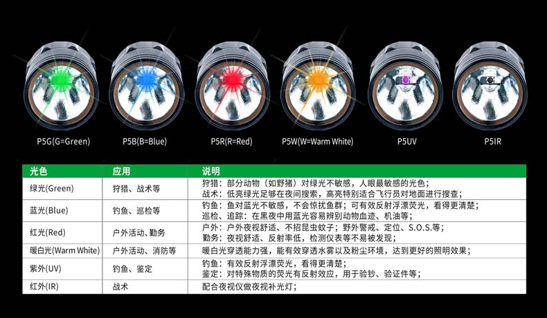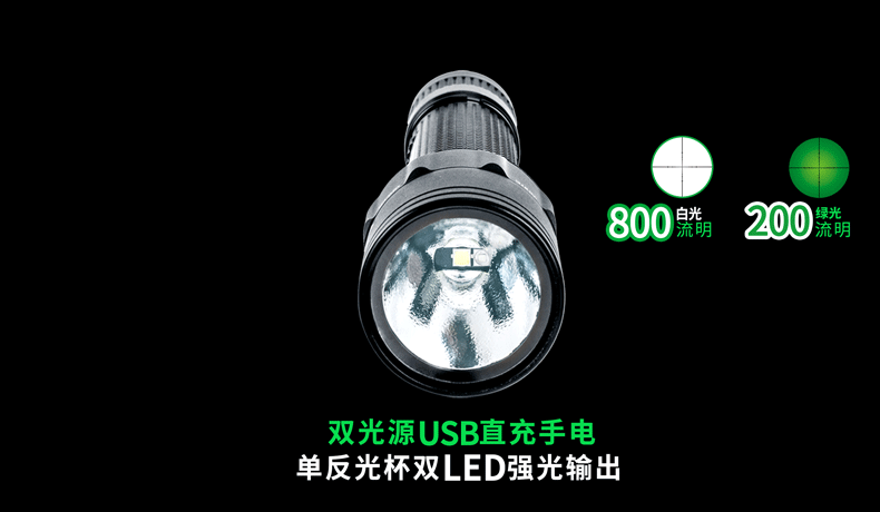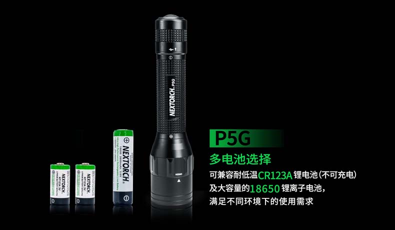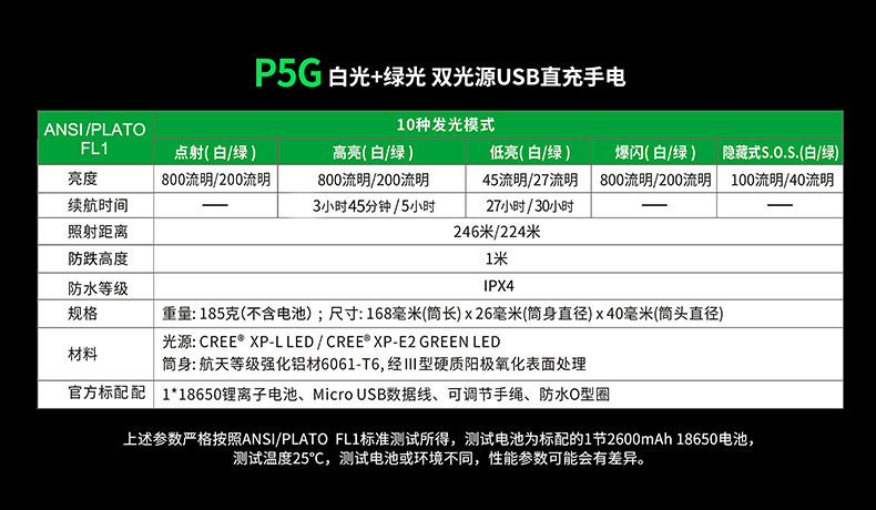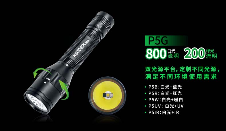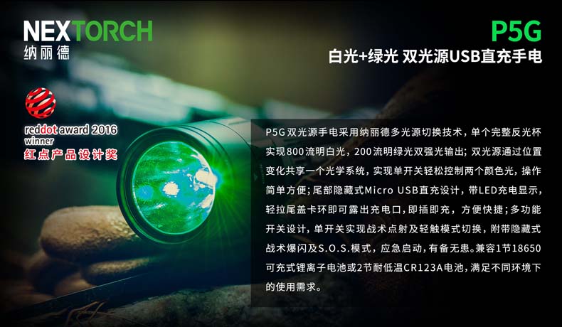 P5G双光源手电采用纳丽德多光源切换技术,单个完整反光杯实现800流明白光,200流明绿光双强光输出; 双光源通过位置变化共享一个光学系统,实现单开关轻松控制两个颜色光,操作简单方便;尾部隐藏式Micro USB直充设计,带LED充电显示,轻拉尾盖卡环即可露出充电口,即插即充,方便快捷;多功能开关设计, 单开关实现战术点射及轻触模式切换,附带隐藏式战术爆闪及S.O.S.模式,应急启动,有备无患。兼容1节 18650可充式锂离子电池或2节耐低温CR123A电池,满足不同环境下的使用需求。