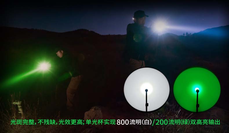 • • 亮度:(白|绿)点射/800流明|200流明/45流明|27流明/爆闪/S.O.S