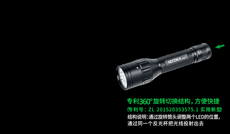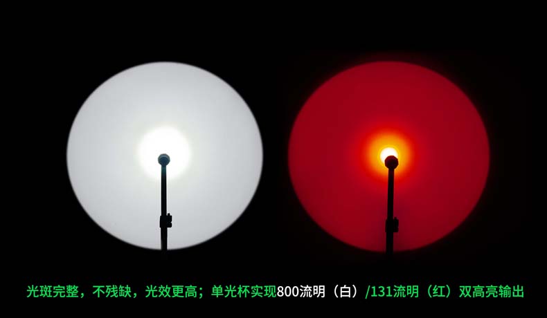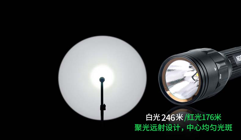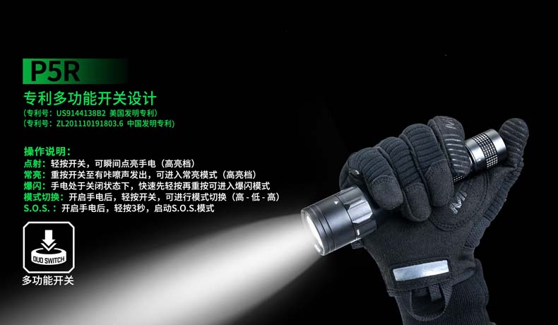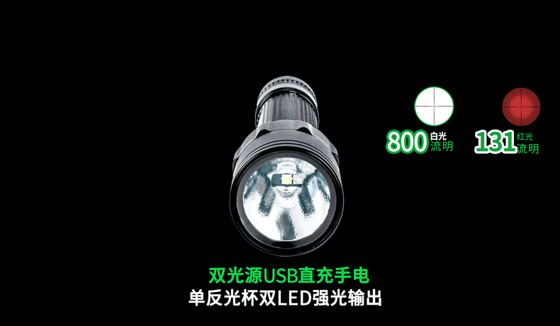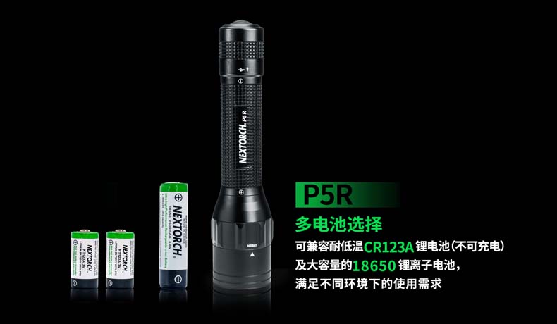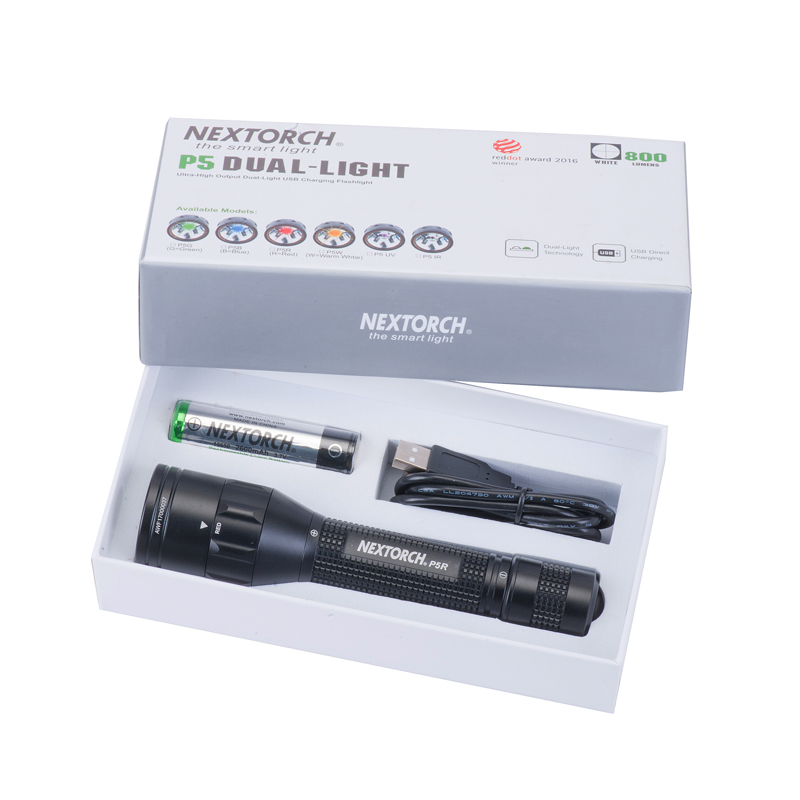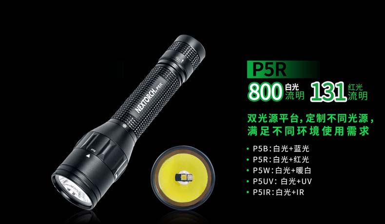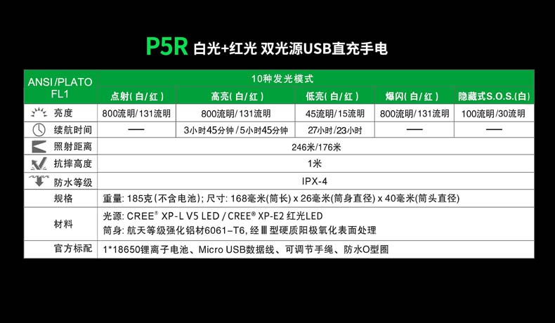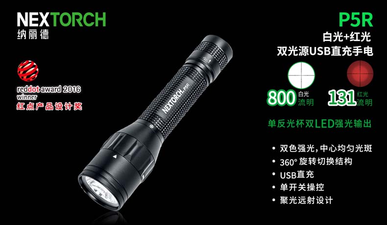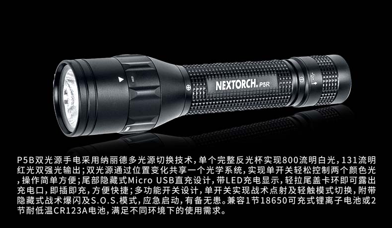 P5R双光源手电采用纳丽德多光源切换技术,单个完整反光杯实现800流明白光,131流明红光双强光输出; 双光源通过位置变化共享一个光学系统,实现单开关轻松控制两个颜色光,操作简单方便;尾部隐藏式Micro USB直充设计,带LED充电显示,轻拉尾盖卡环即可露出充电口,即插即充,方便快捷;多功能开关设计, 单开关实现战术点射及轻触模式切换,附带隐藏式战术爆闪及S.O.S.模式,应急启动,有备无患。兼容1节 18650可充式锂离子电池或2节耐低温CR123A电池,满足不同环境下的使用需求。