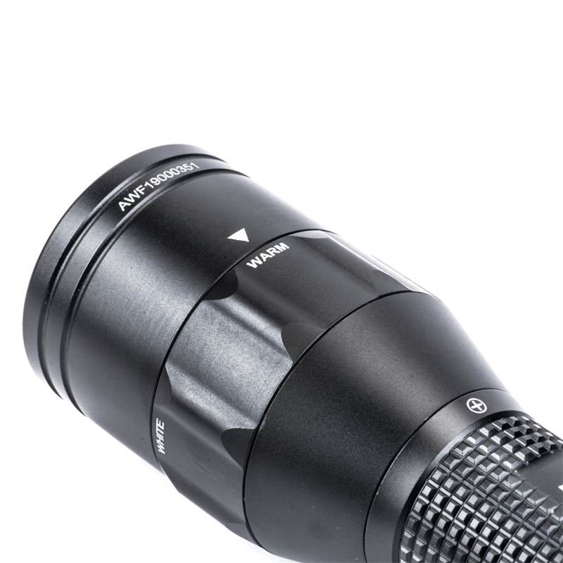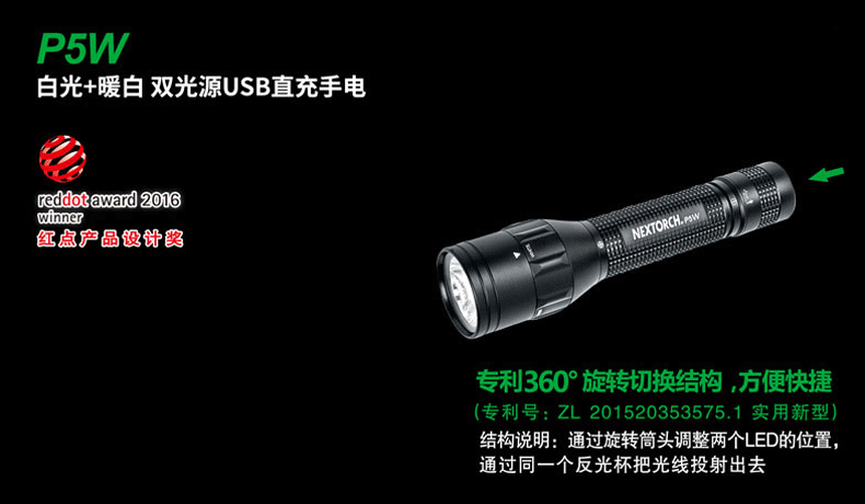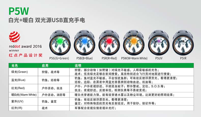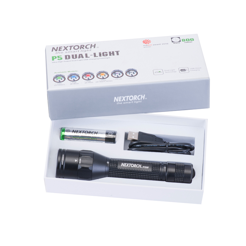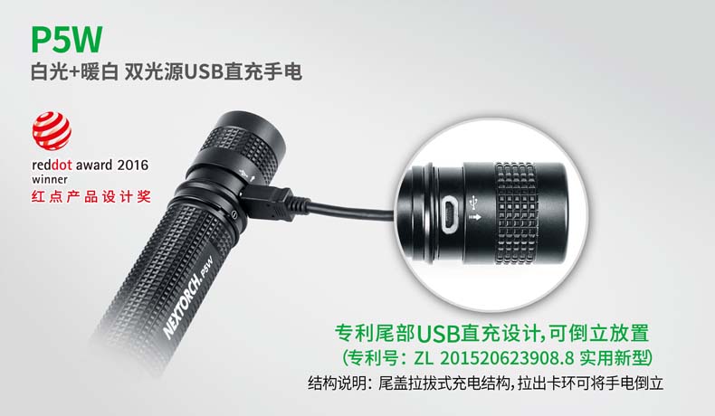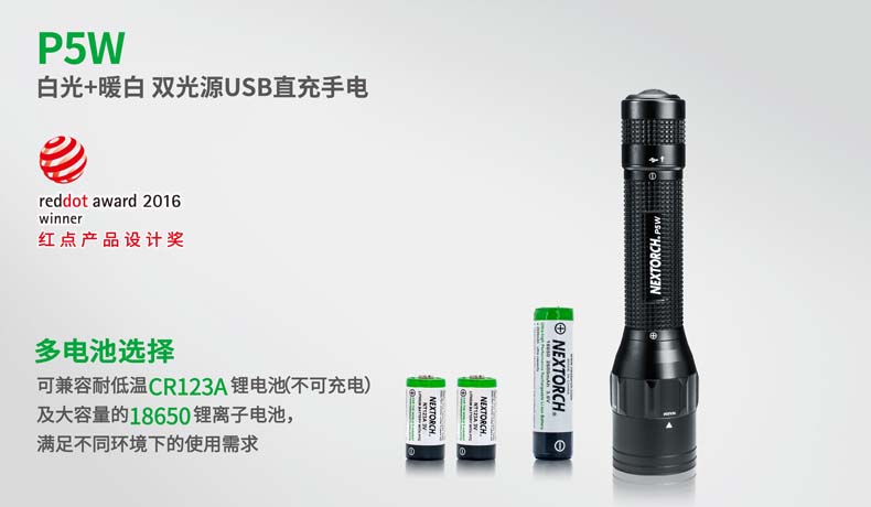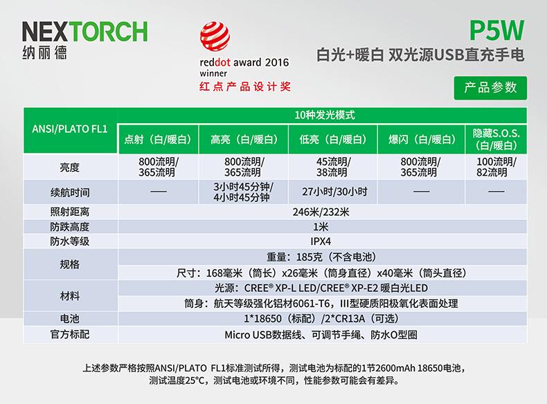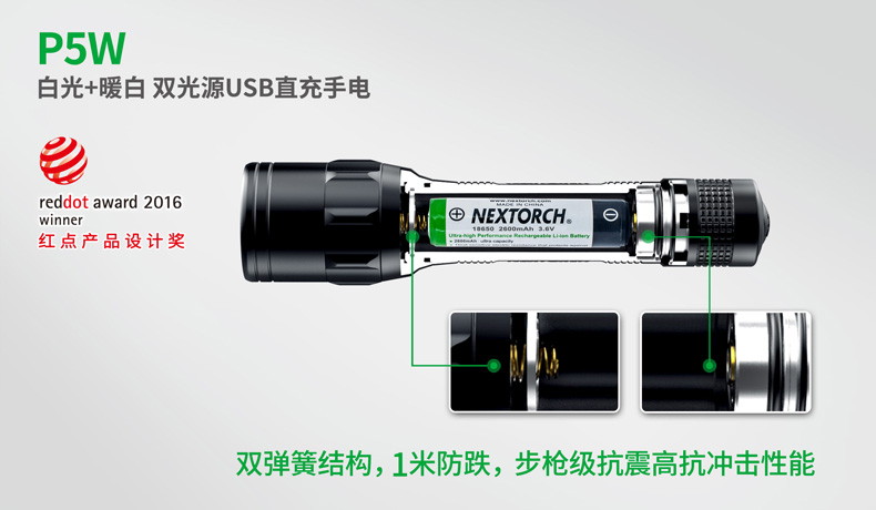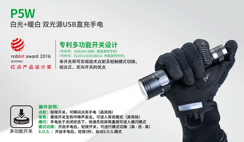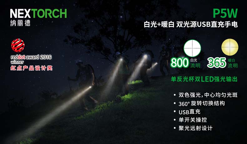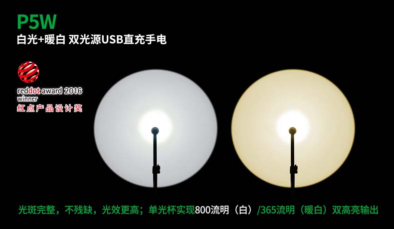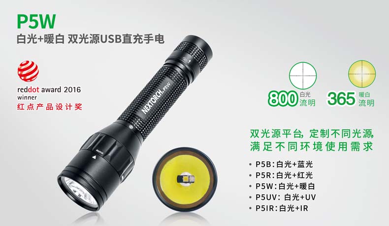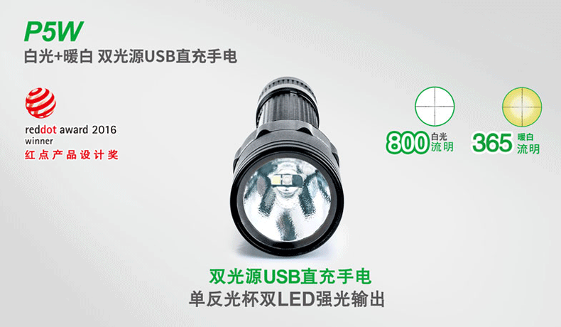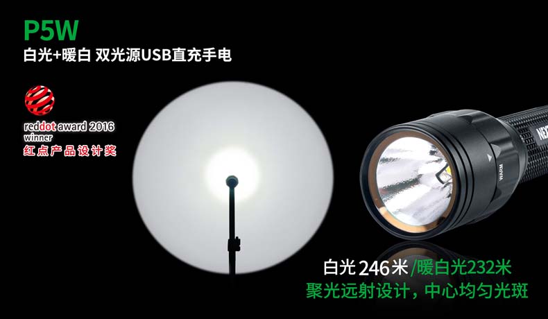 P5W双光源手电采用纳丽德多光源切换技术,单个完整反光杯实现800流明白光,365流明暖白光双强光输出; 双光源通过位置变化共享一个光学系统,实现单开关轻松控制两个颜色光,操作简单方便;尾部隐藏式Micro USB直充设计,带LED充电显示,轻拉尾盖卡环即可露出充电口,即插即充,方便快捷;多功能开关设计, 单开关实现战术点射及轻触模式切换,附带隐藏式战术爆闪及S.O.S.模式,应急启动,有备无患。兼容1节 18650可充式锂离子电池或2节耐低温CR123A电池,满足不同环境下的使用需求。