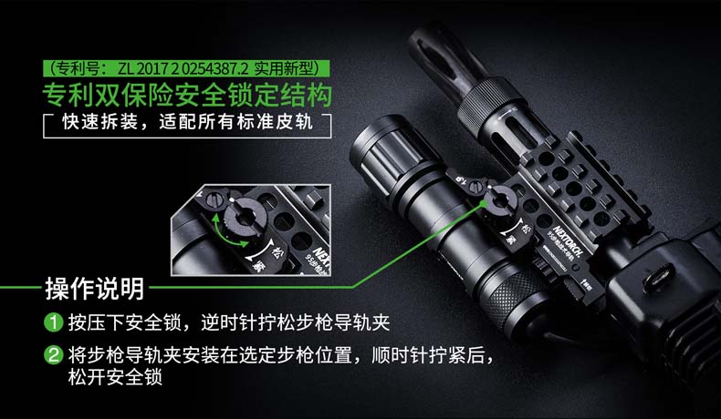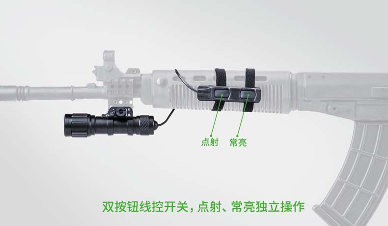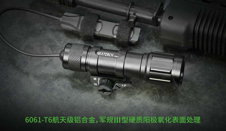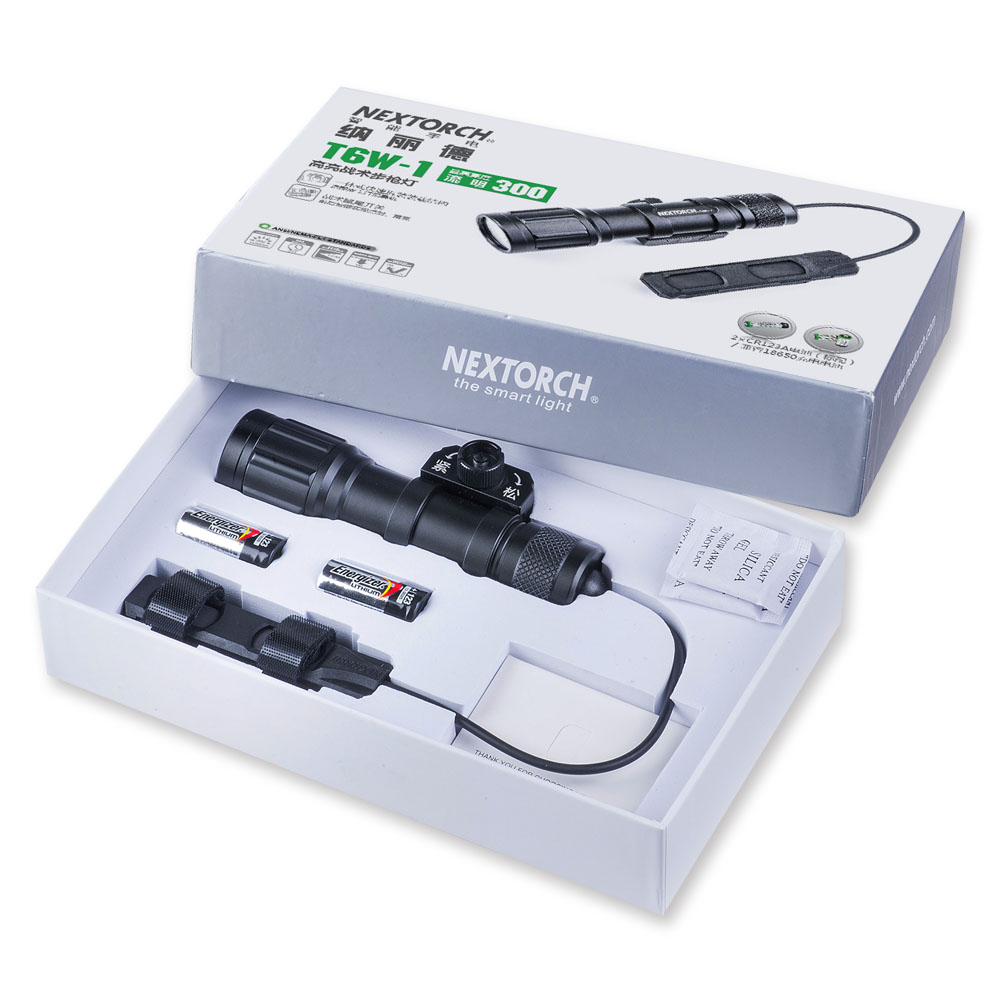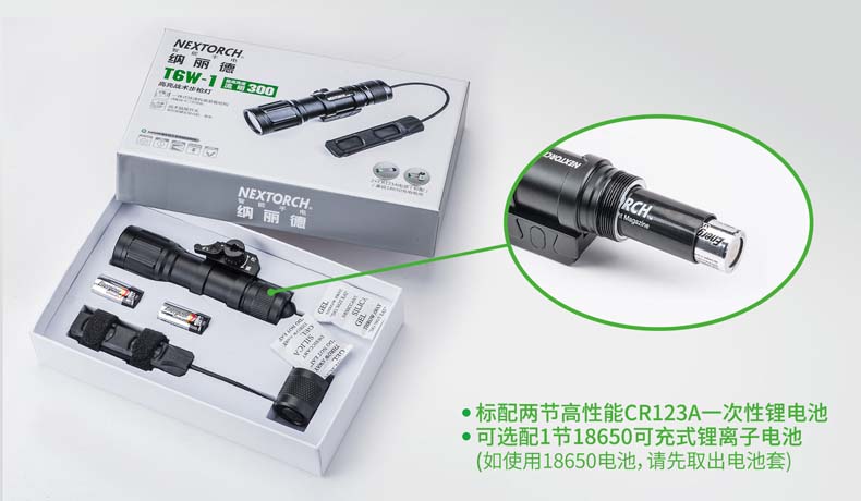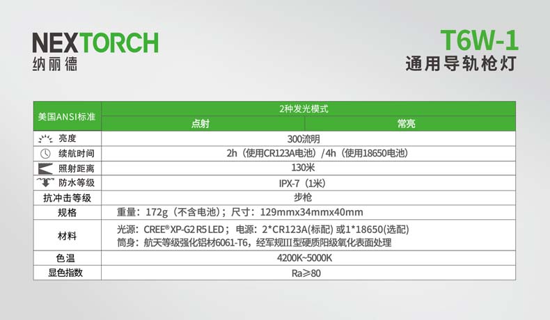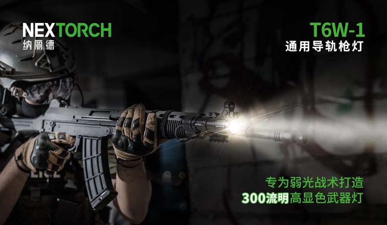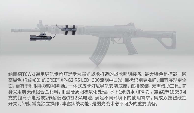 纳丽德T6W-1通用导轨步枪灯是专为弱光战术打造的战术照明装备。最大特色是搭载一颗高显色(Ra≥80)的 CREE® XP-G2 LED,300流明中白光,目标识别更准确,细节展现更全面,更有于利射手观察和判断。一体式皮卡 汀尼导轨安装底座,直接安装,无需借助工具。筒身采用航天级铝合金材料,Ⅲ型硬质阳极氧化处理,水下1米防水(IPX7) 。 兼容1节18650可充式锂离子电池或2节耐低温CR123A电池,满足不同环境下的使用需求。集成双按钮线控开关,点射、 常亮独立操作,丰富实战功能,是弱光战术必不可少的重要装备。