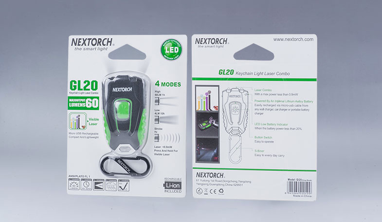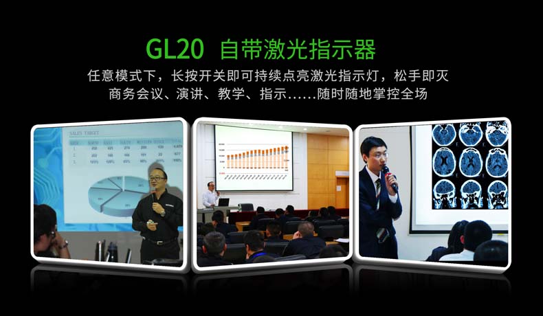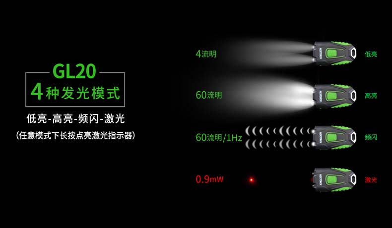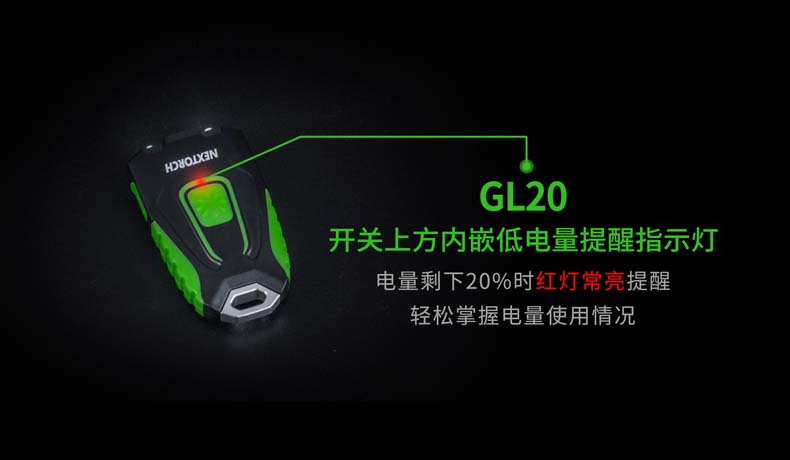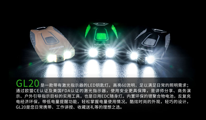 GL20是一款带有激光指示器的LED钥匙灯。高亮60流明,足以满足日常的照明需求;通过欧盟CE认证及美国FDA认证的激光指示器,使用安全更具保障,是讲师分享、商务演示、户外引导指示目标的实用工具,也是日用EDC随身灯。内置环保的锂聚合物电池,反复充电经济环保,带低电量提醒功能,轻松掌握电量使用情况。酷炫时尚的外观,轻巧的设计,GL20是您日常携带、工作讲授、收藏送礼等的理想之选。