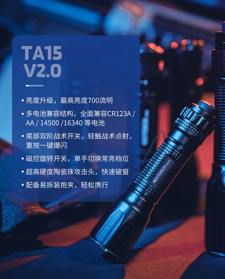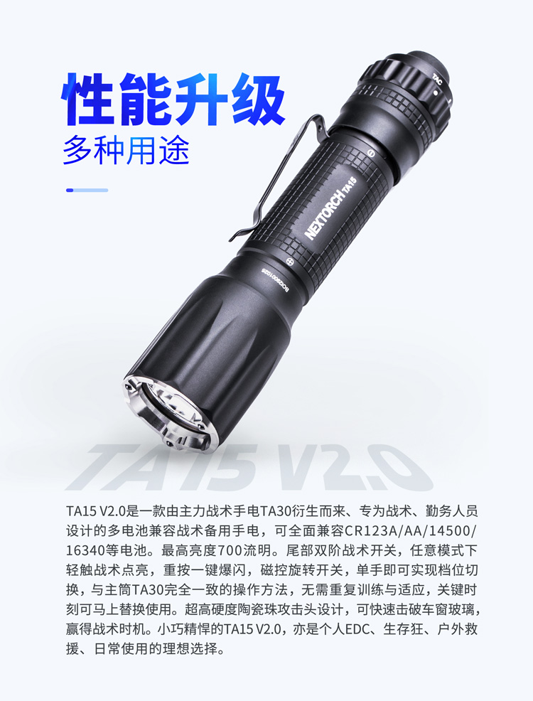 TA15 V2.0是一款由主力战术手电TA30衍生而来,专为战术、勤务人员设计的多电池兼容战术手电,可全面兼容AA/ CR123A/ 14500/ 16340等电池,最高亮度700流明。尾部双阶战术开关,任意模式下轻触战术点亮,重按一键爆闪,磁控旋转开关,单手即可实现档位切换,与主筒TA30完全一致的操作方法,无需重复训练与适应,关键时刻可马上替换使用。超高硬度陶瓷珠攻击头设计,可快速击破车窗玻璃,赢得战术时机。小巧精悍的TA15 V2.0,亦是个人EDC、生存狂、户外救援、日常使用的理想选择。