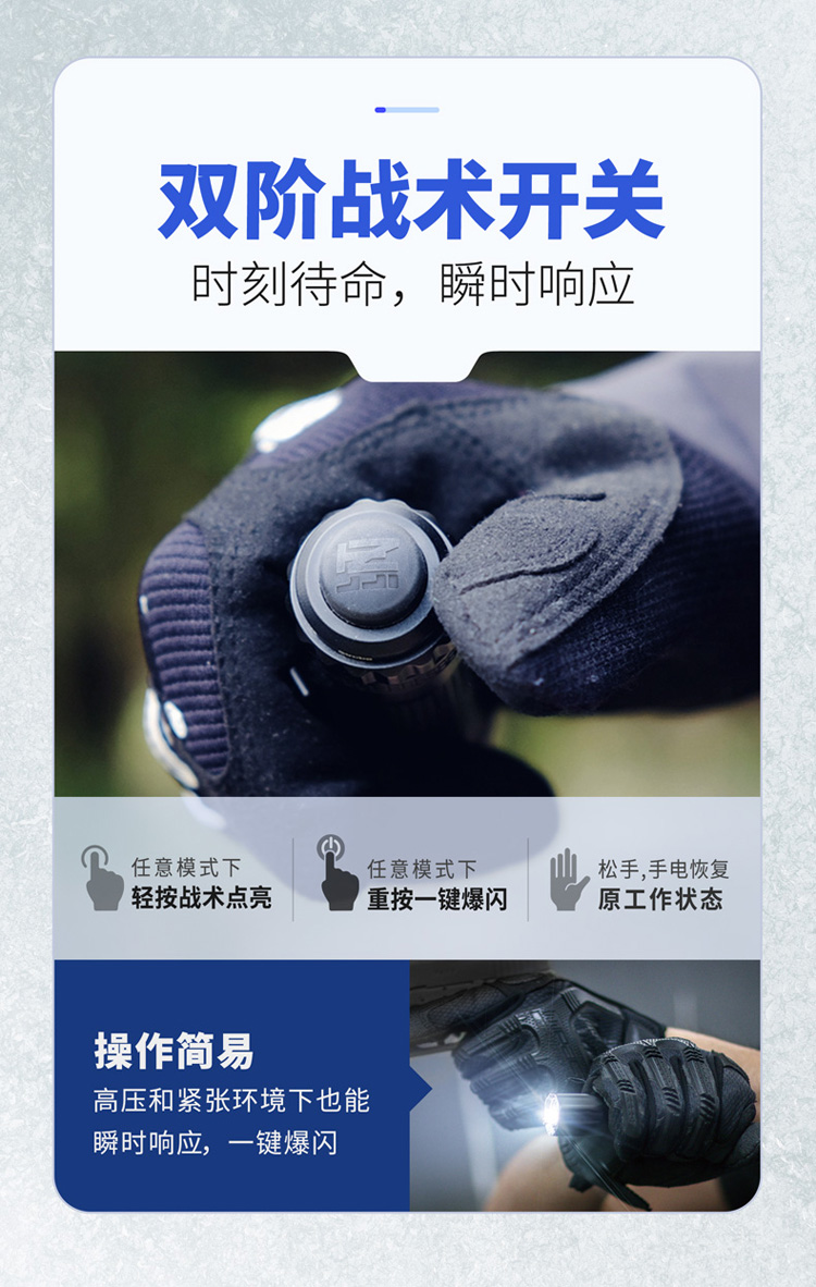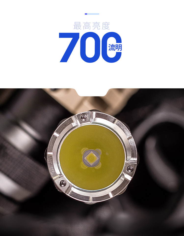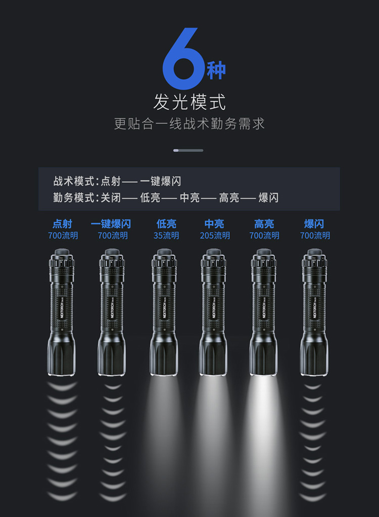 • • 亮度:35流明/205流明/700流明/点射/一键爆闪