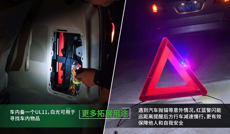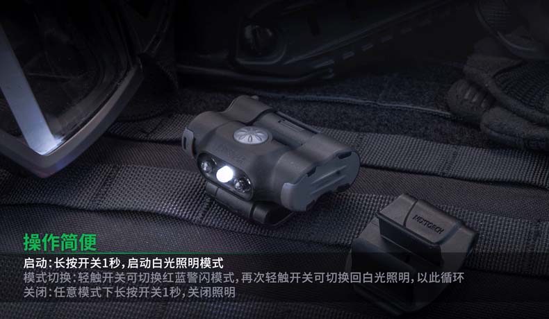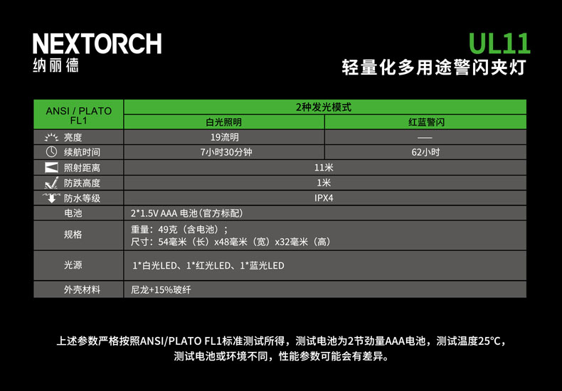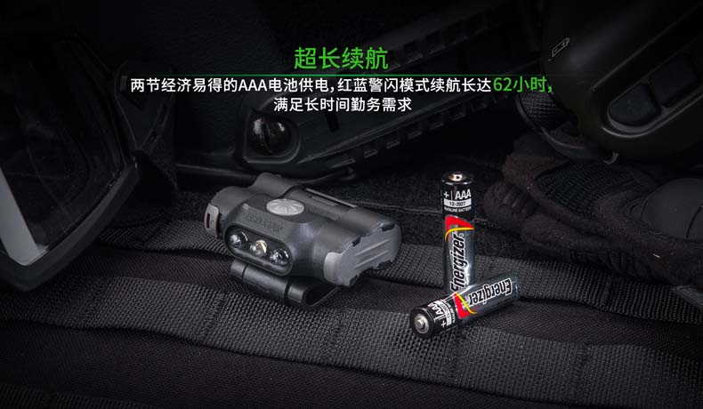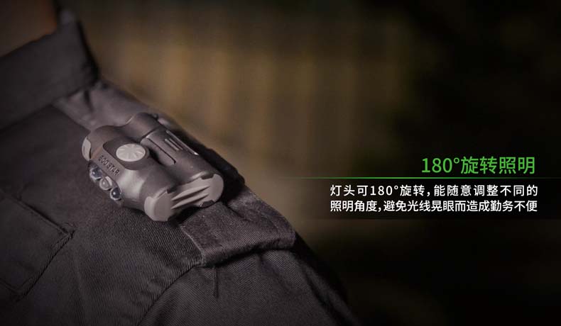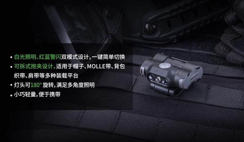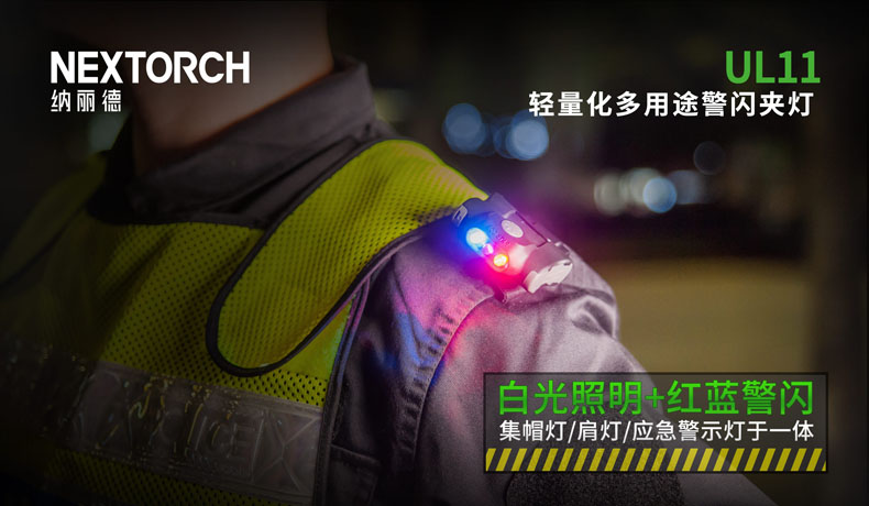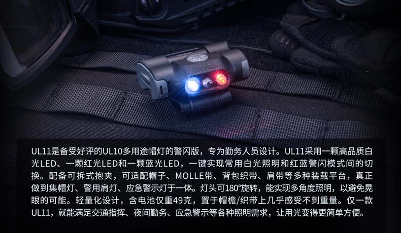 UL11是备受好评的UL10多用途帽灯的警闪版,专为勤务人员设计。UL11采用一颗高品质白光LED、一颗红光LED和一颗蓝光LED,一键实现常用白光照明和红蓝警闪模式间的切换。配备可拆式抱夹,可适配帽子、MOLLE带、背包织带、肩带等多种装载平台,真正做到集帽灯、警用肩灯、应急警示灯于一体。灯头可180°旋转,能实现多角度照明,以避免晃眼的可能。轻量化设计,含电池仅重49克,置于帽檐/织带上几乎感受不到重量。仅一款UL11,就能满足交通指挥、夜间勤务、应急警示等各种照明需求,让用光变得简单方便。