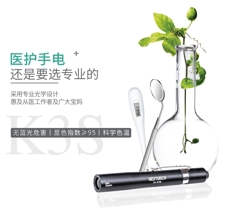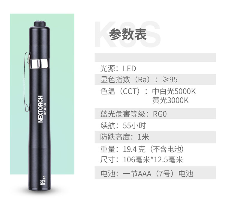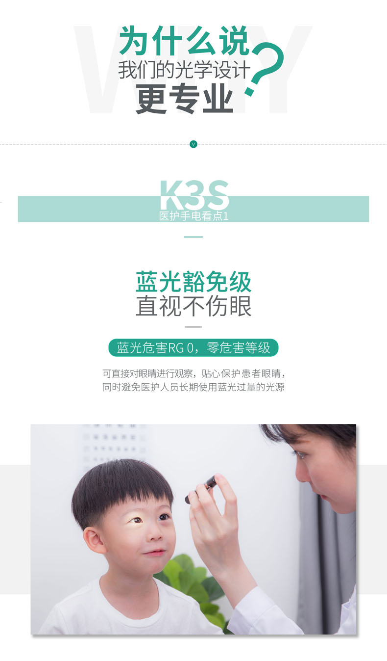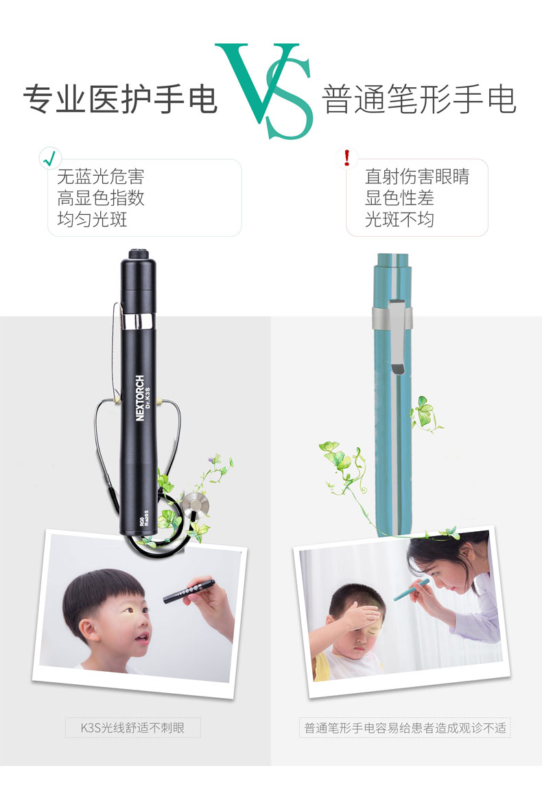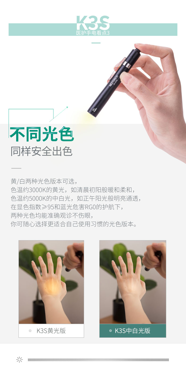 大多数医护人员都深知一支手电在医疗工作中的重要性,却还是常常选错手电。普通的笔形手电,光学参数无法达到医用标准,会造成观诊效果差,乃至对病人眼睛造成损害等问题。而专业医用手电K3S,具备显色指数(RA)≥95、色温(CCT)约5000K、蓝光危害RG0三大核心指标,可以给你接近太阳光下的观看效果,色彩还原度高达90%以上,观诊更准确,同时零蓝光危害等级,亦可以安心用于儿童的眼睛检查。医用手电,还是要选专业的,笔形外观的K3S,精致轻量,方便你随身悬挂在衣物口袋上,随时取用,轻松应对耳鼻咽喉检查、剥刺、拆线、眼科泪道冲洗、耳道清洗等工作,给你更好的观诊体验。