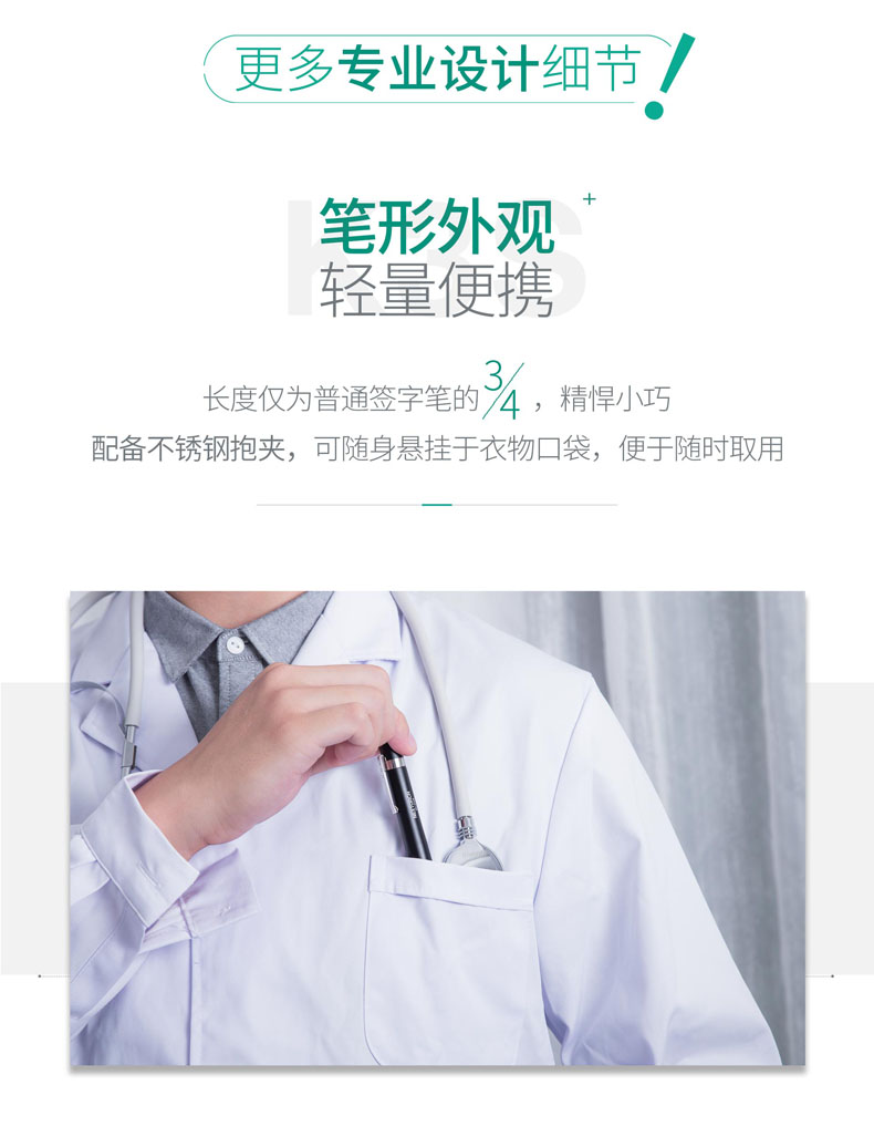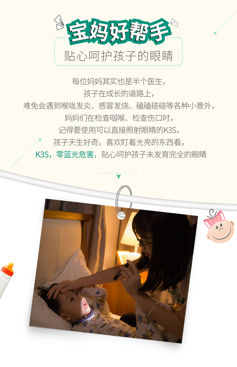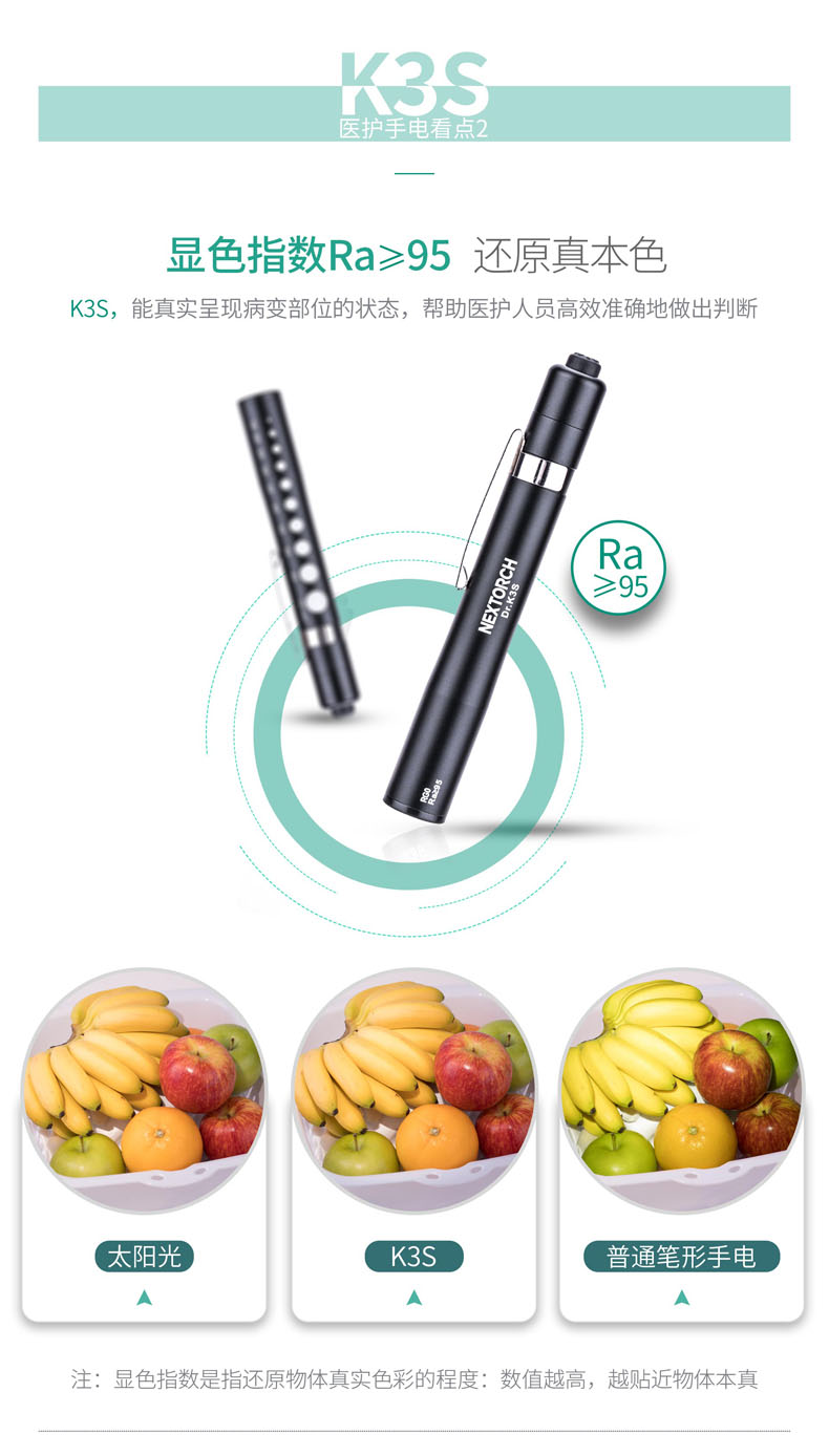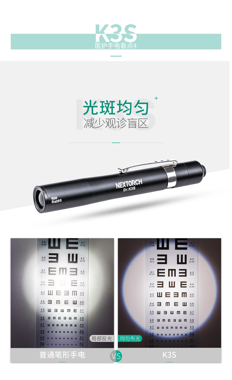 大多数医护人员都深知一支手电在医疗工作中的重要性,却还是常常选错手电。普通的笔形手电,光学参数无法达到医用标准,会造成观诊效果差,乃至对病人眼睛造成损害等问题。而专业医用手电K3S,具备显色指数(RA)≥95、色温(CCT)约5000K、蓝光危害RG0三大核心指标,可以给你接近太阳光下的观看效果,色彩还原度高达90%以上,观诊更准确,同时零蓝光危害等级,亦可以安心用于儿童的眼睛检查。医用手电,还是要选专业的,笔形外观的K3S,精致轻量,方便你随身悬挂在衣物口袋上,随时取用,轻松应对耳鼻咽喉检查、剥刺、拆线、眼科泪道冲洗、耳道清洗等工作,给你更好的观诊体验。