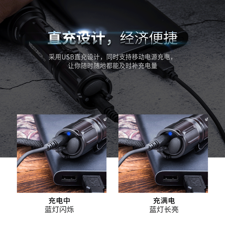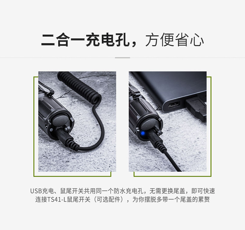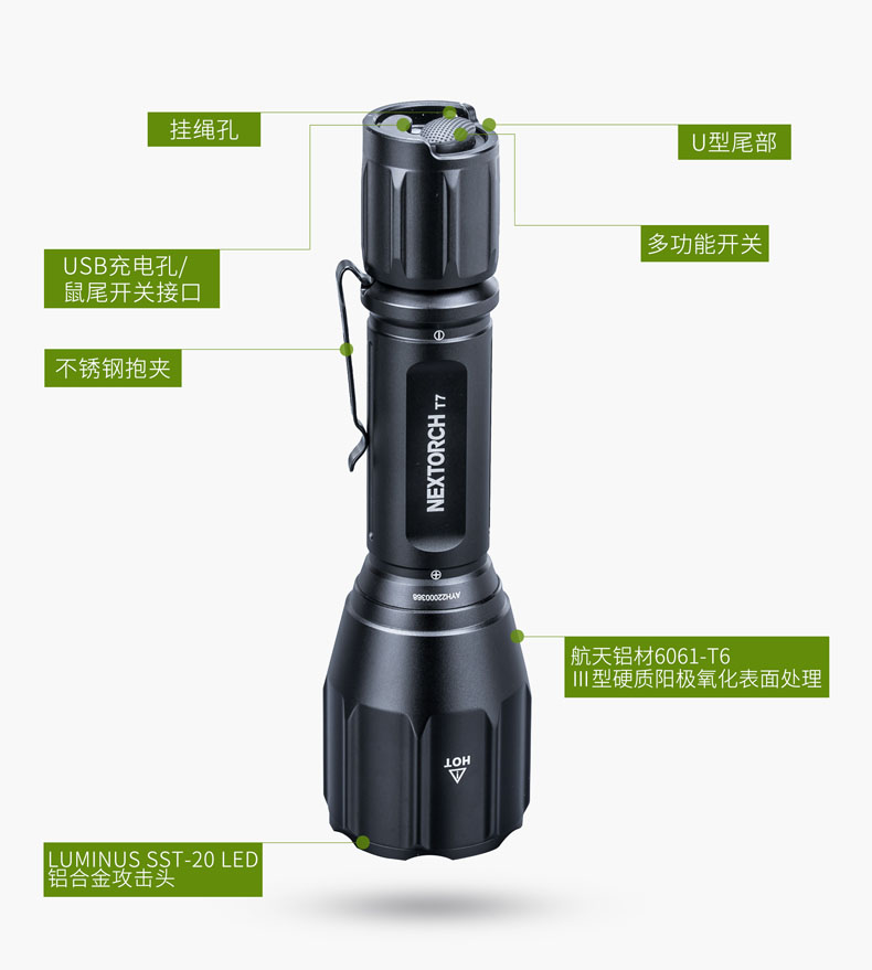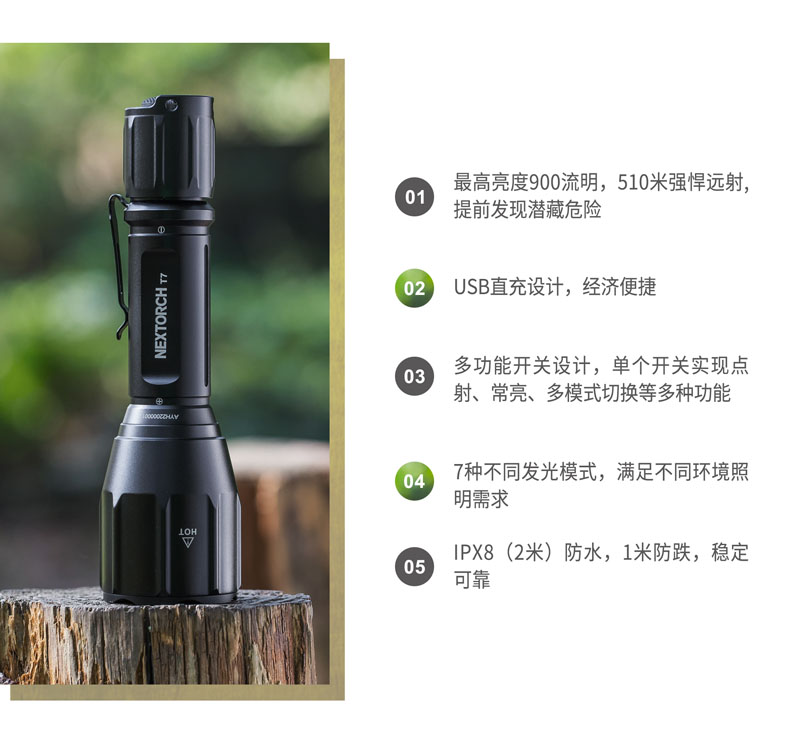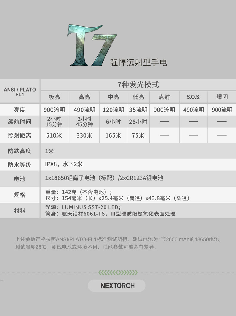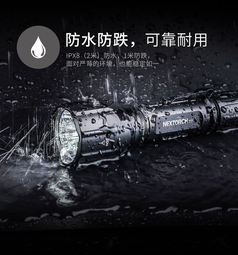 纳丽德T7,具有900流明高亮、510米远射的强悍性能,真正做到目光未至,光明先行。兼容大容量18650充电锂离子电池(标配)和耐低温CR123A锂电池,同时支持USB直充,且USB充电、鼠尾开关共用同一个防水充电孔,无需更换尾盖即可快速连接鼠尾开关,为你摆脱多带一个尾盖的累赘,真正做到既经济又便捷。一体化筒身结构,IPX-8(水下2米)防水,1米防跌,可靠耐用。多功能战术开关,单个开关即可实现点射、常亮、模式切换等多种功能,设有4档亮度、双击爆闪、隐藏S.O.S.模式及战术点射模式,以适应不同环境下的用光需求。