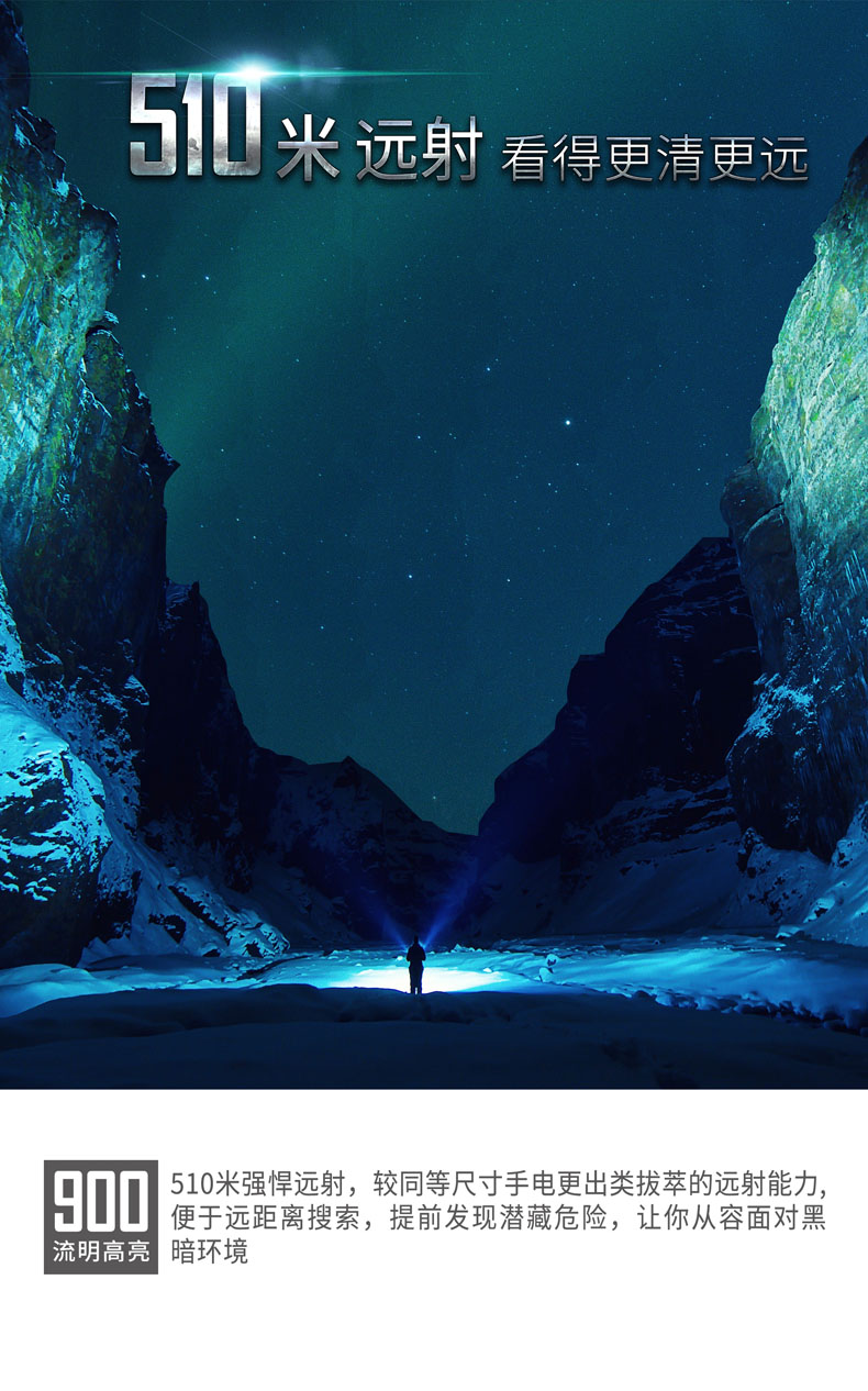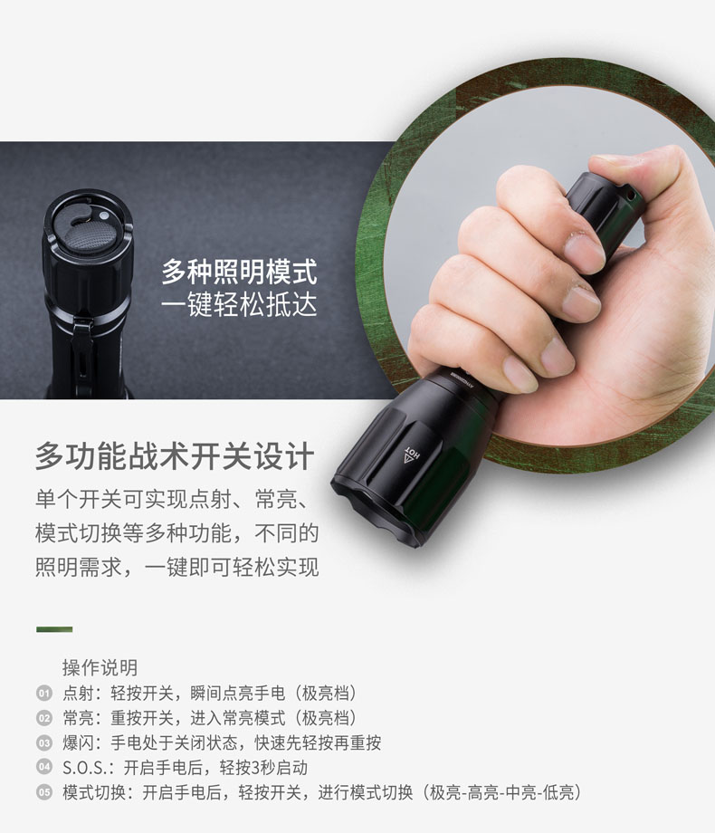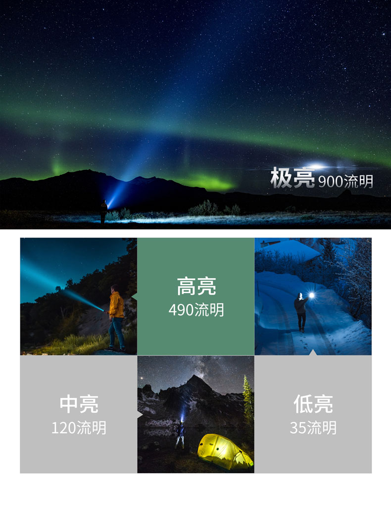 • • 亮度:900流明/490流明/120流明/35流明/点射/S.O.S./爆闪
