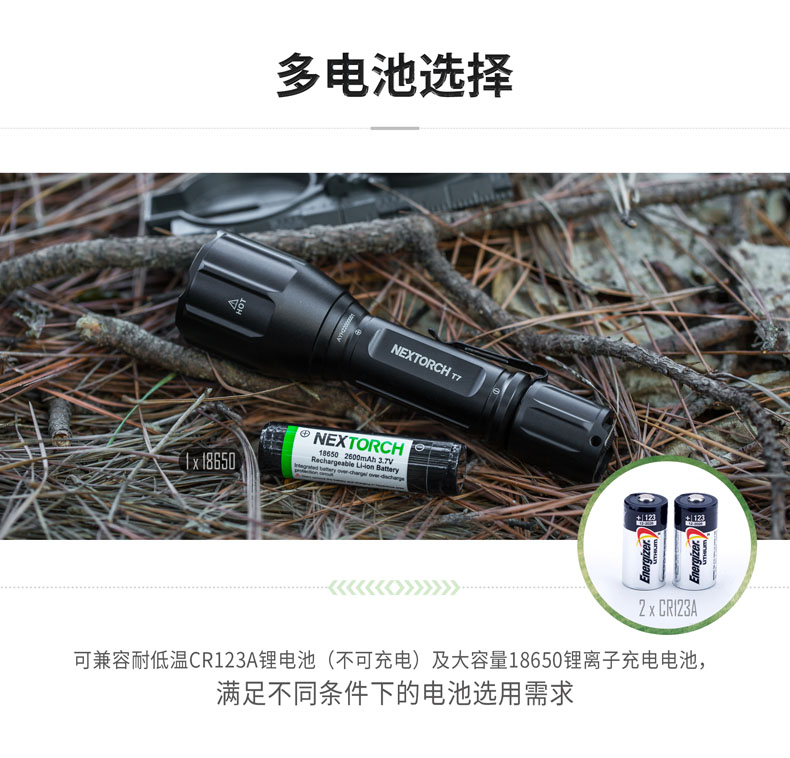 • • 电池:1 x 18650锂电池(标配)/2 x CR123A锂电池