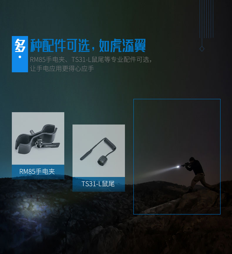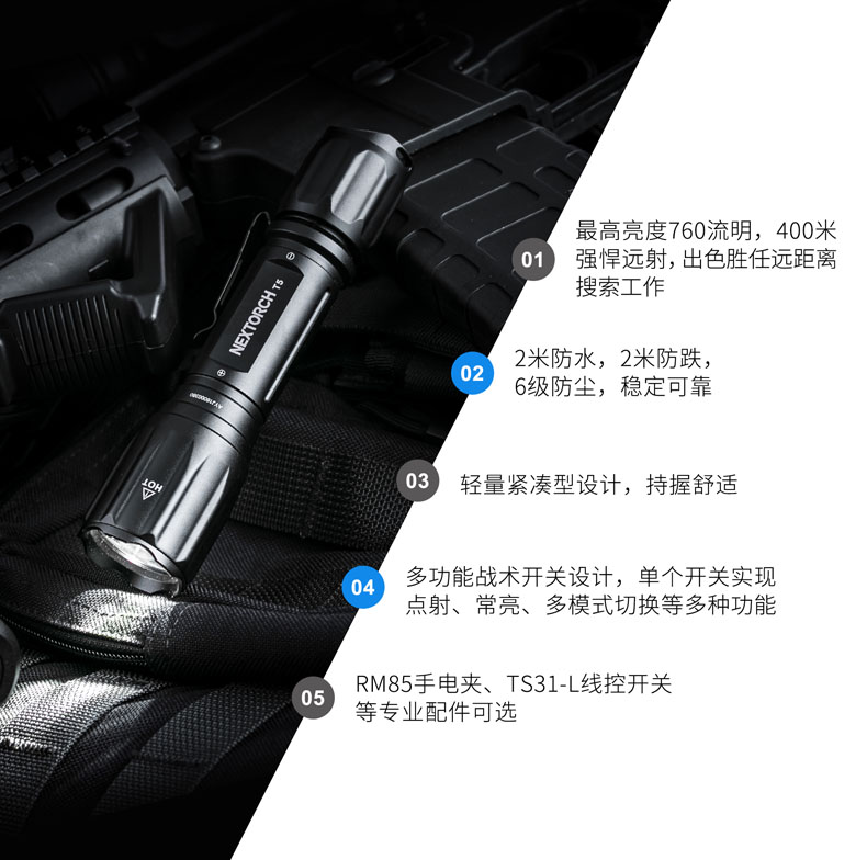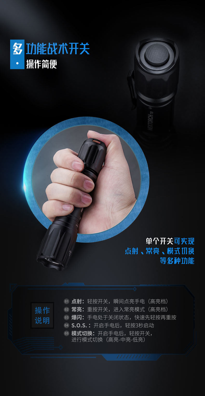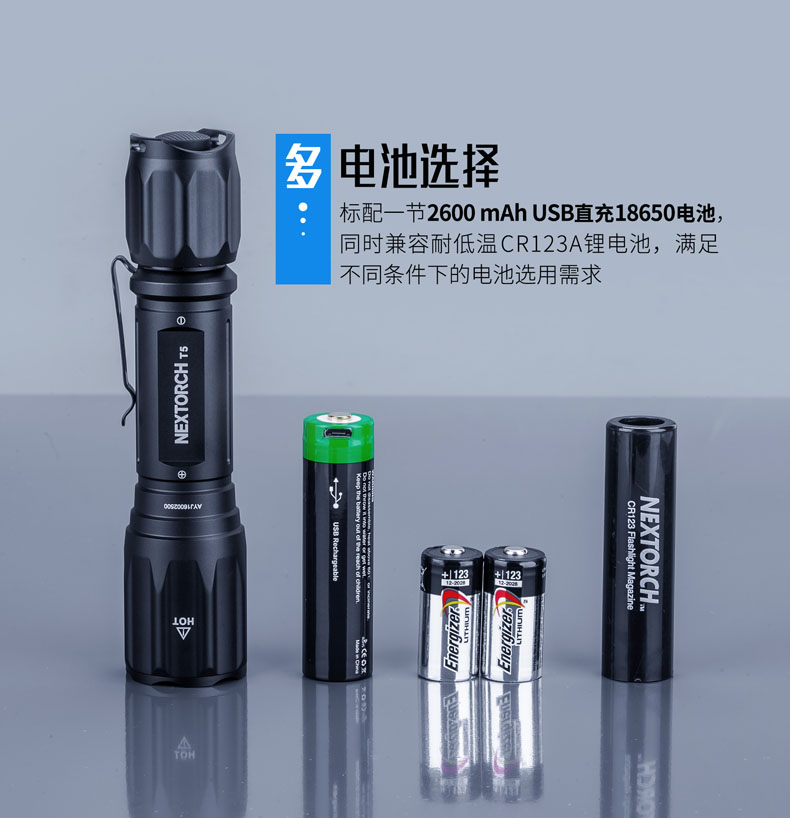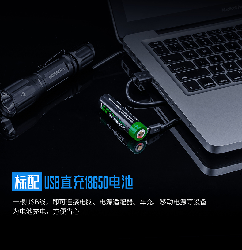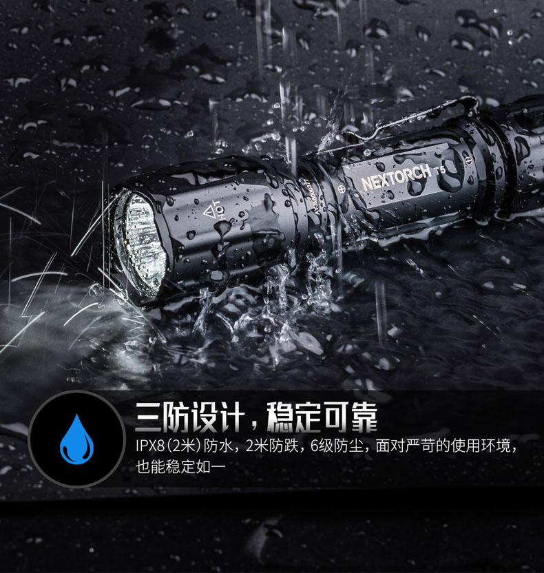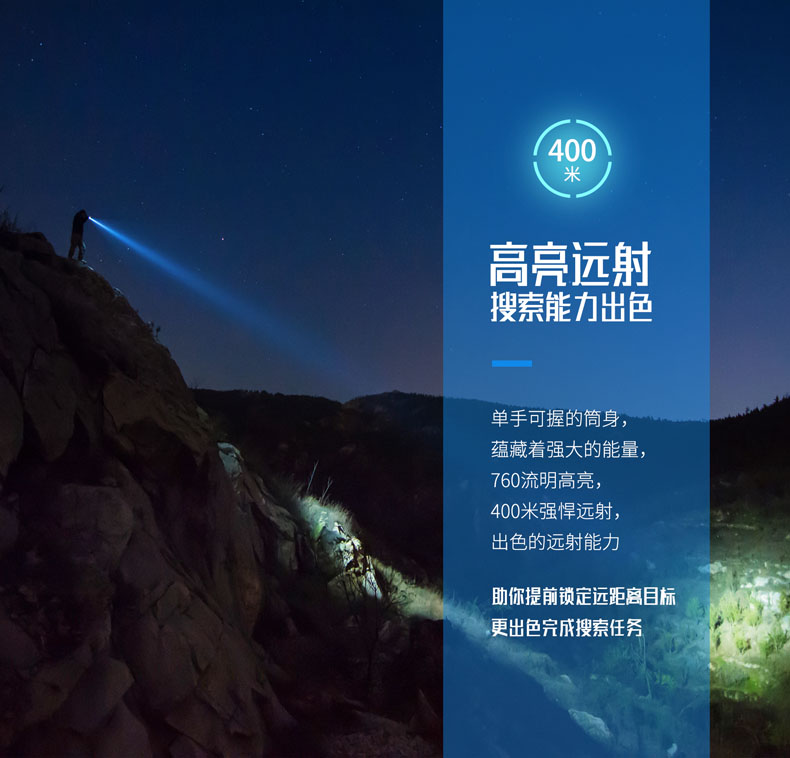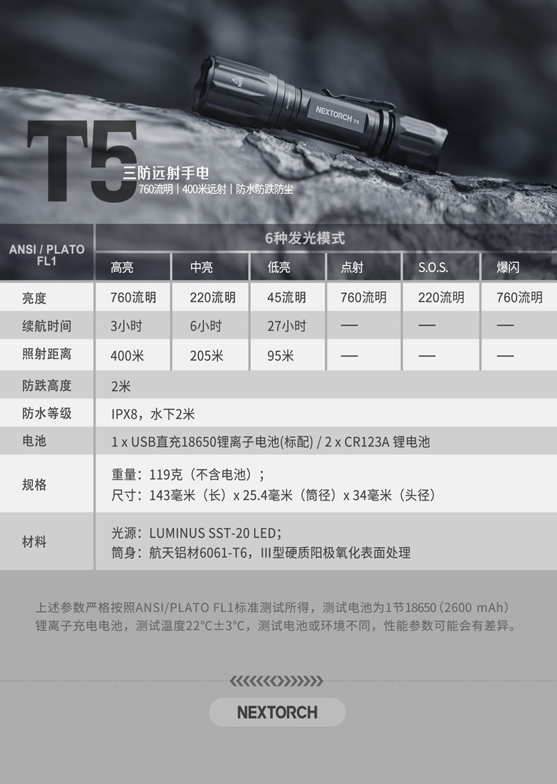 纳丽德T5,延续纳家一贯传承的精工品质,2米防水、2米防跌、6级防尘,如此稳定可靠,才能保证在你需要的每个关键时刻,为你点亮。760流明高亮、400米远射,出色的光效性能,让黑暗无所遁形。同时,为了让手电的使用更便捷,标配了一节USB直充18650电池,通过一根USB线,即可连接电脑、移动电源等设备为电池充电,方便省心。