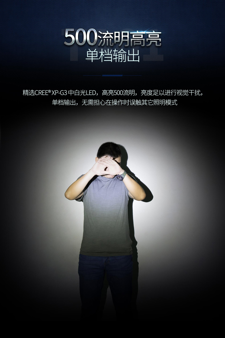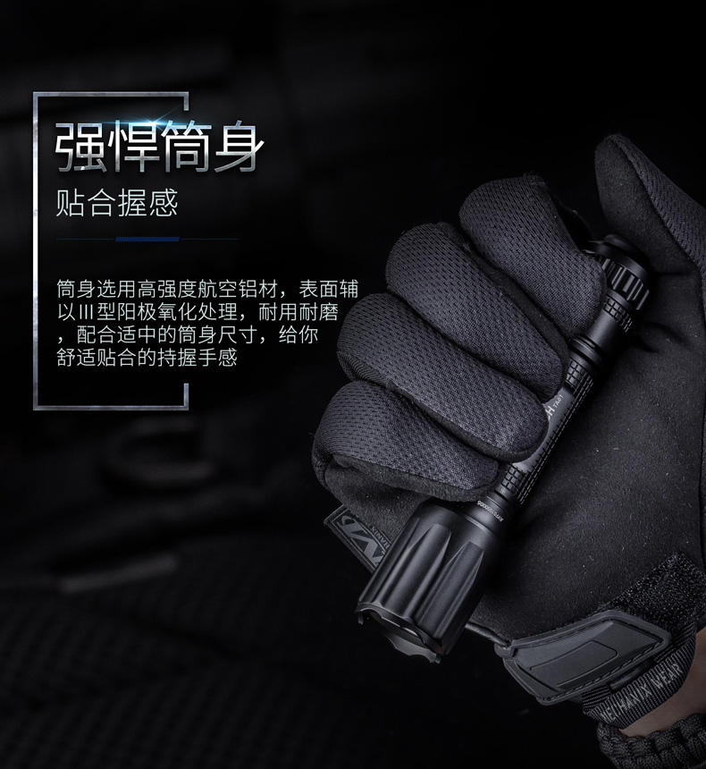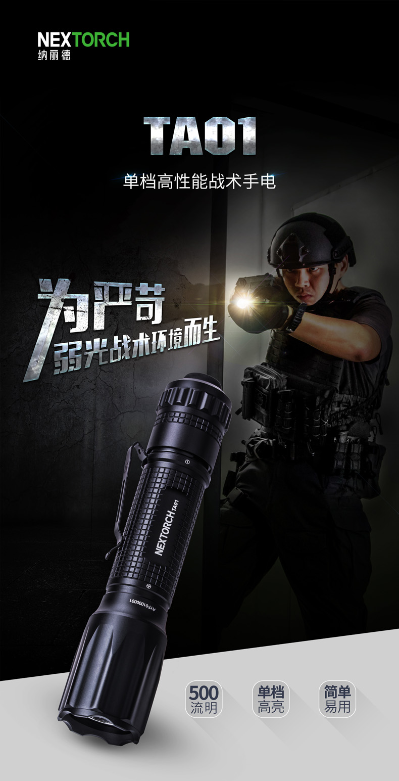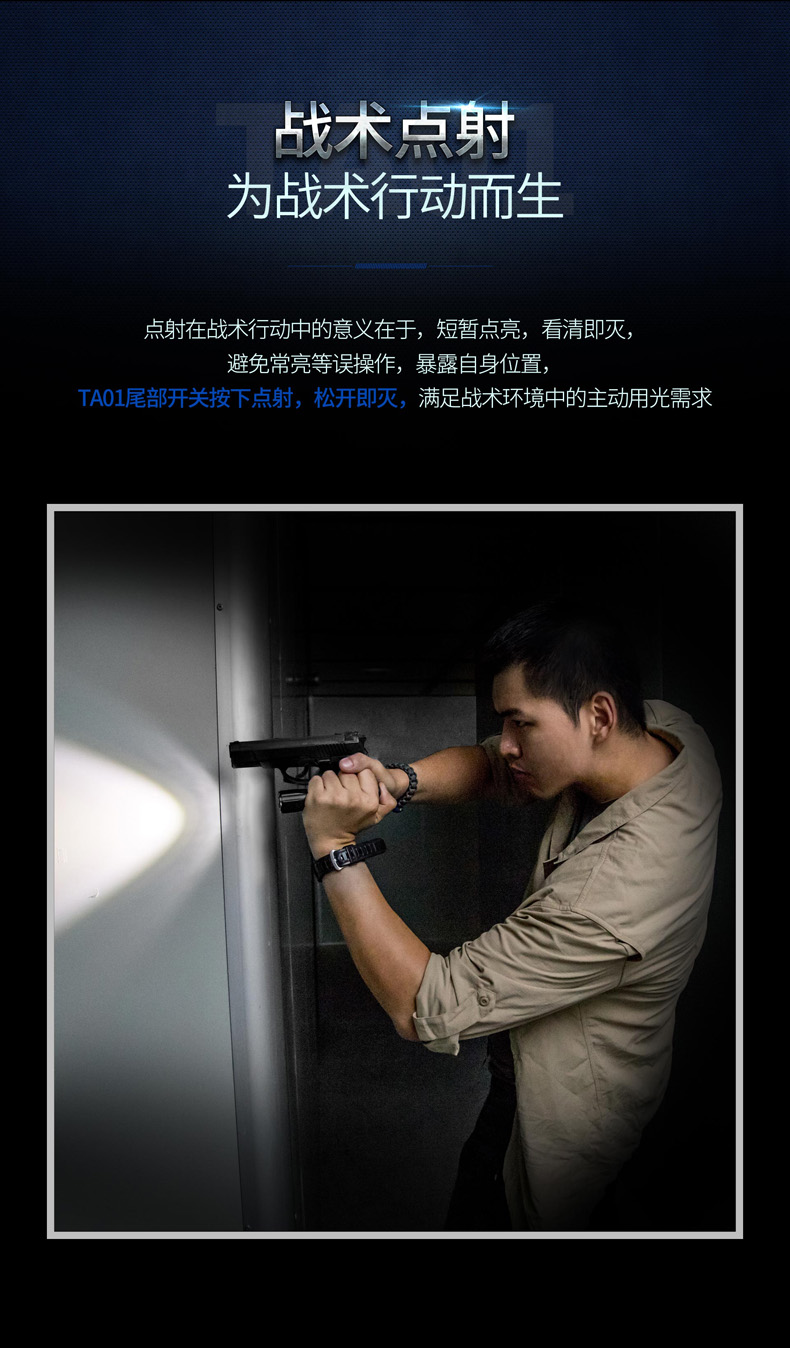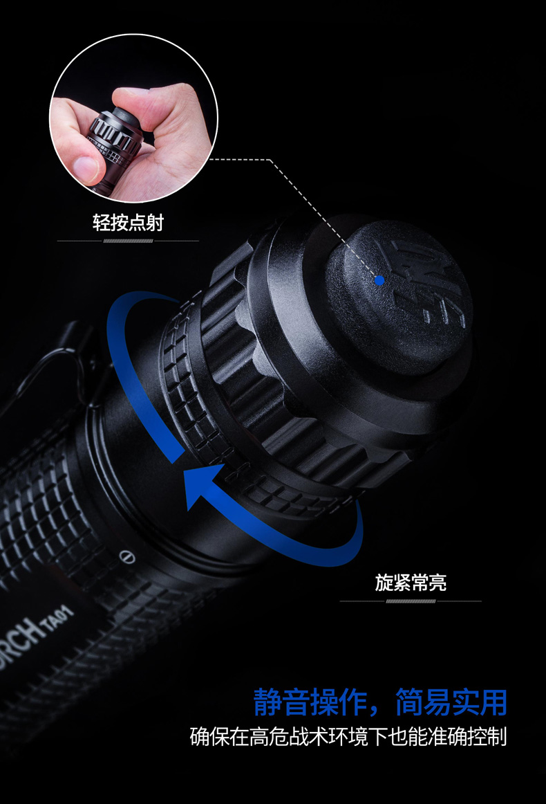 在黑暗、复杂、陌生,且存在威胁的弱光战术环境下,作为执法人员的你需要一款操作简单,性能可靠的战术手电,以帮助你更好地完成搜索、识别、控制或武力使用等任务。TA01便是一款为应对弱光战术环境而生的战术手电。撇除繁杂而不必要的功能和操作,回归基本而纯粹的战术需求:500流明单档高亮,轻按点射、旋紧常亮,简单易用。