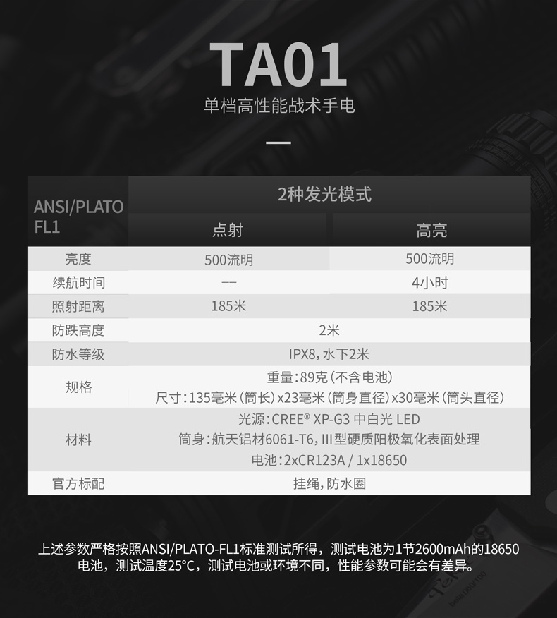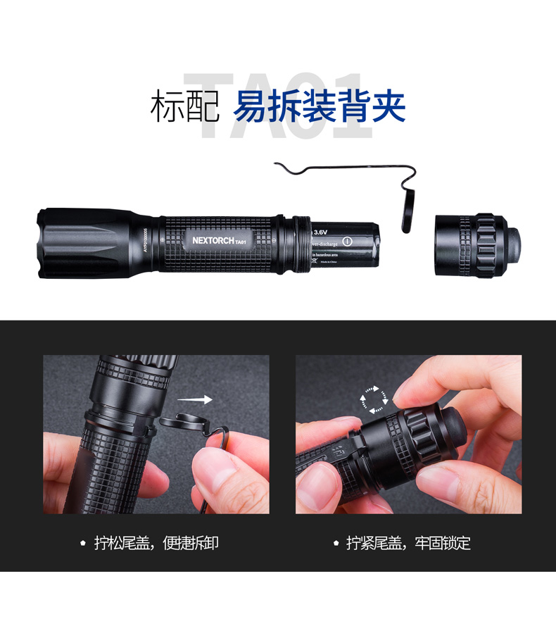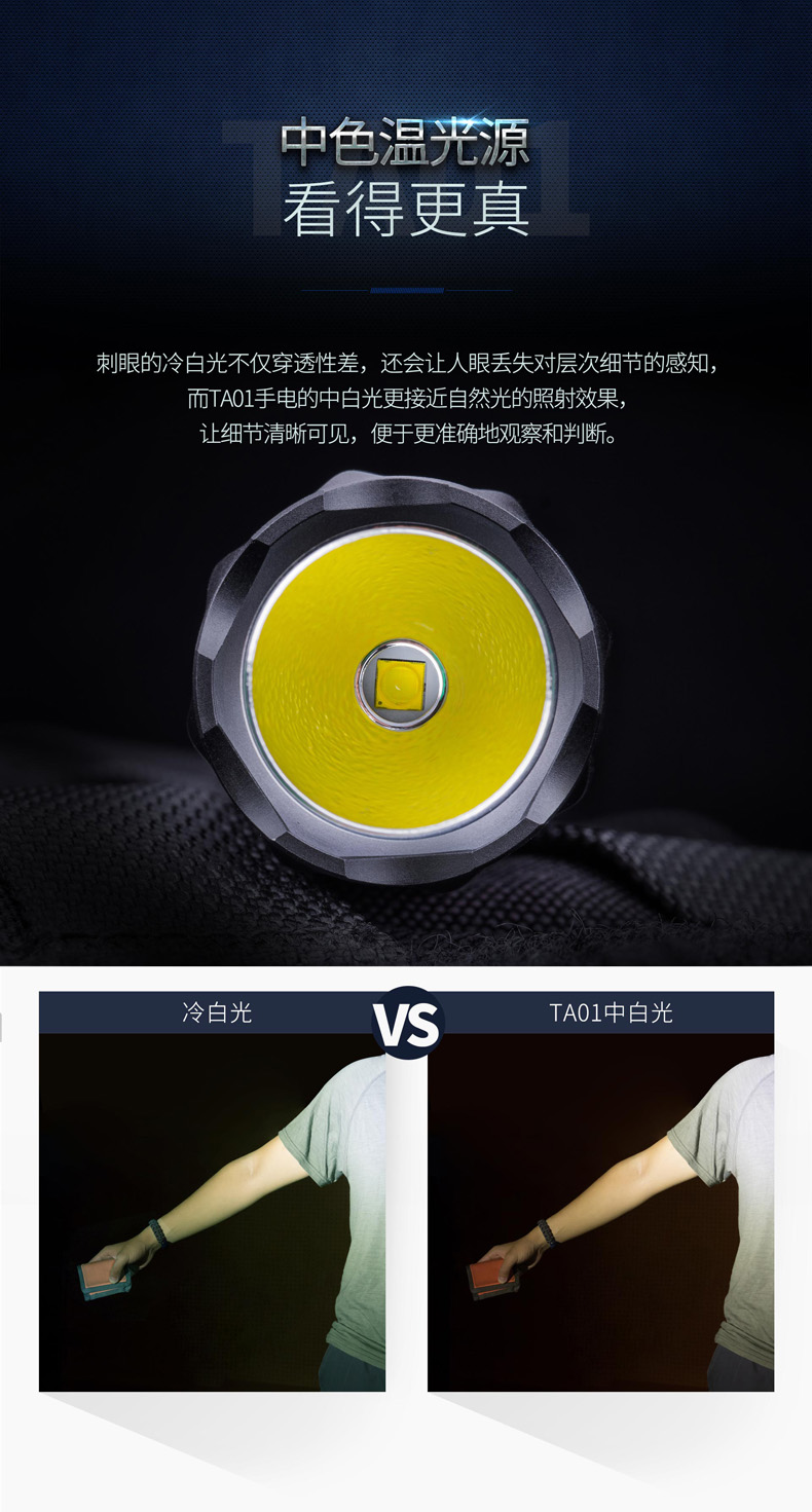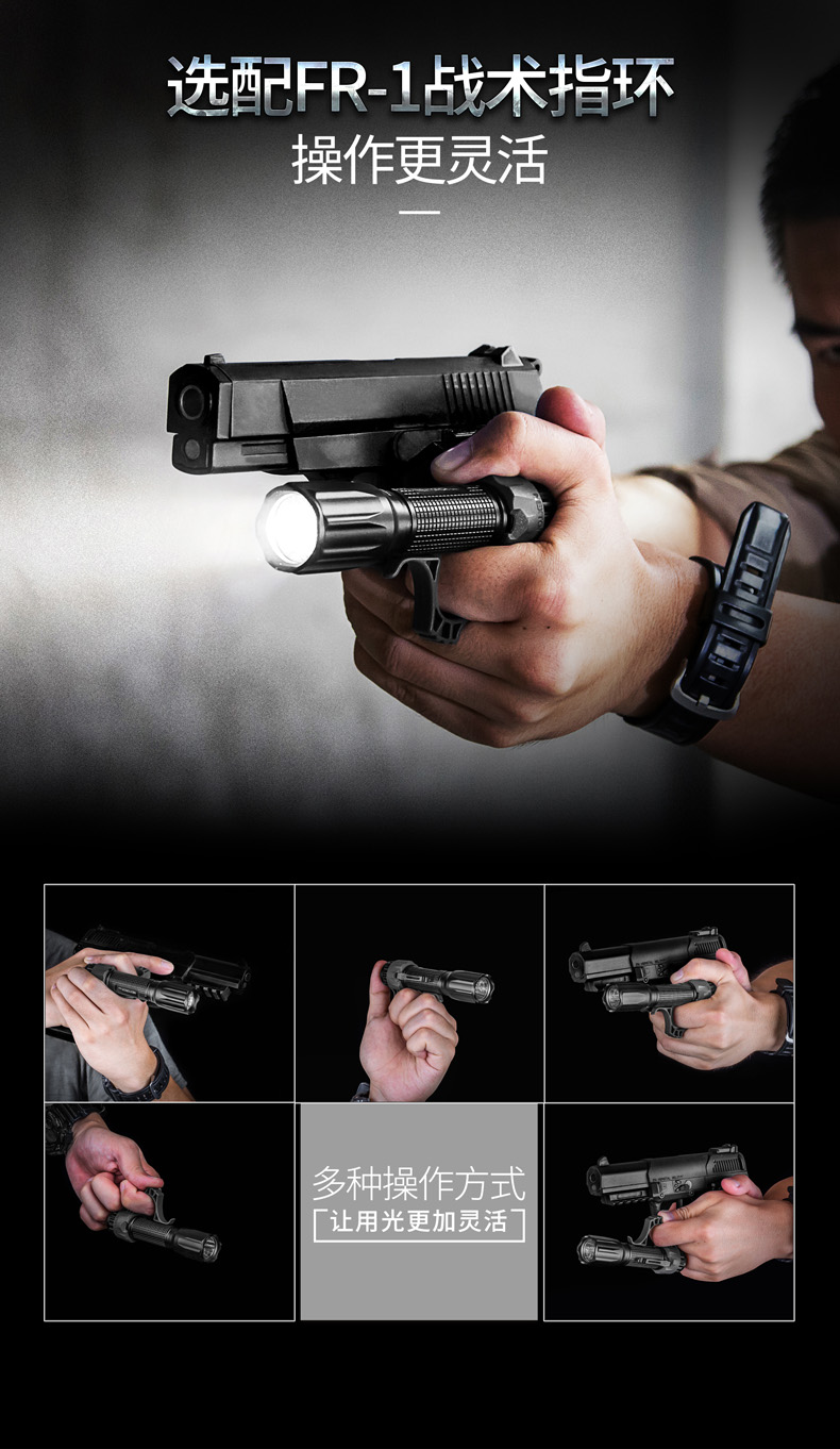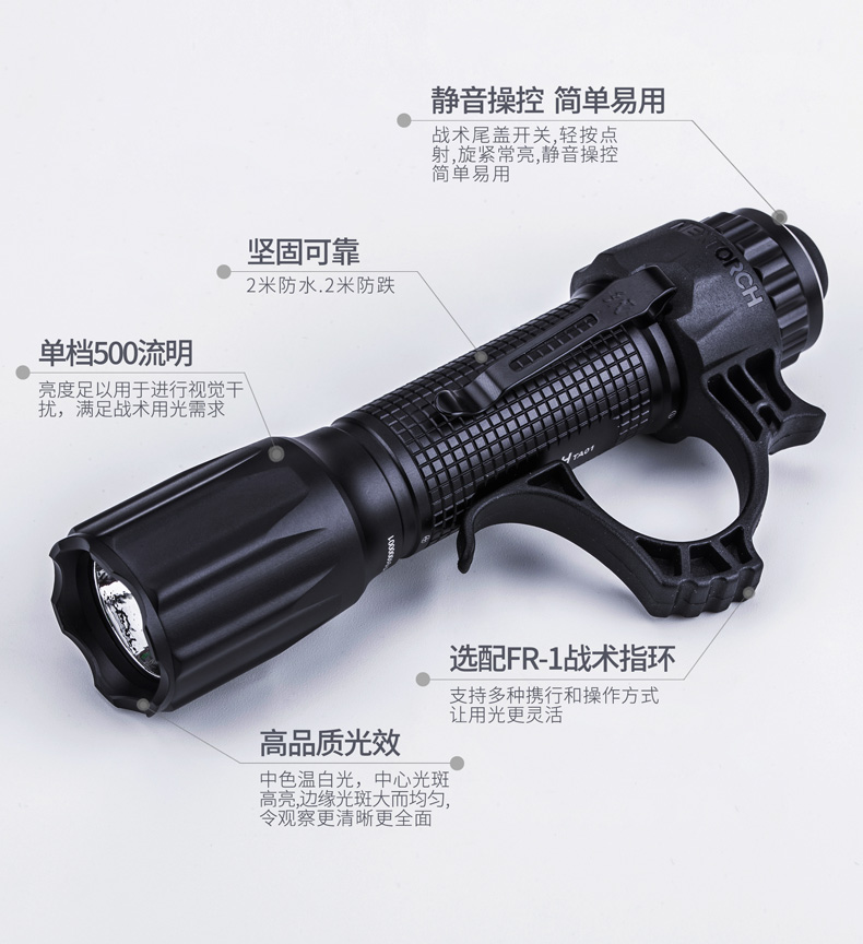 在黑暗、复杂、陌生,且存在威胁的弱光战术环境下,作为执法人员的你需要一款操作简单,性能可靠的战术手电,以帮助你更好地完成搜索、识别、控制或武力使用等任务。TA01便是一款为应对弱光战术环境而生的战术手电。撇除繁杂而不必要的功能和操作,回归基本而纯粹的战术需求:500流明单档高亮,轻按点射、旋紧常亮,简单易用。