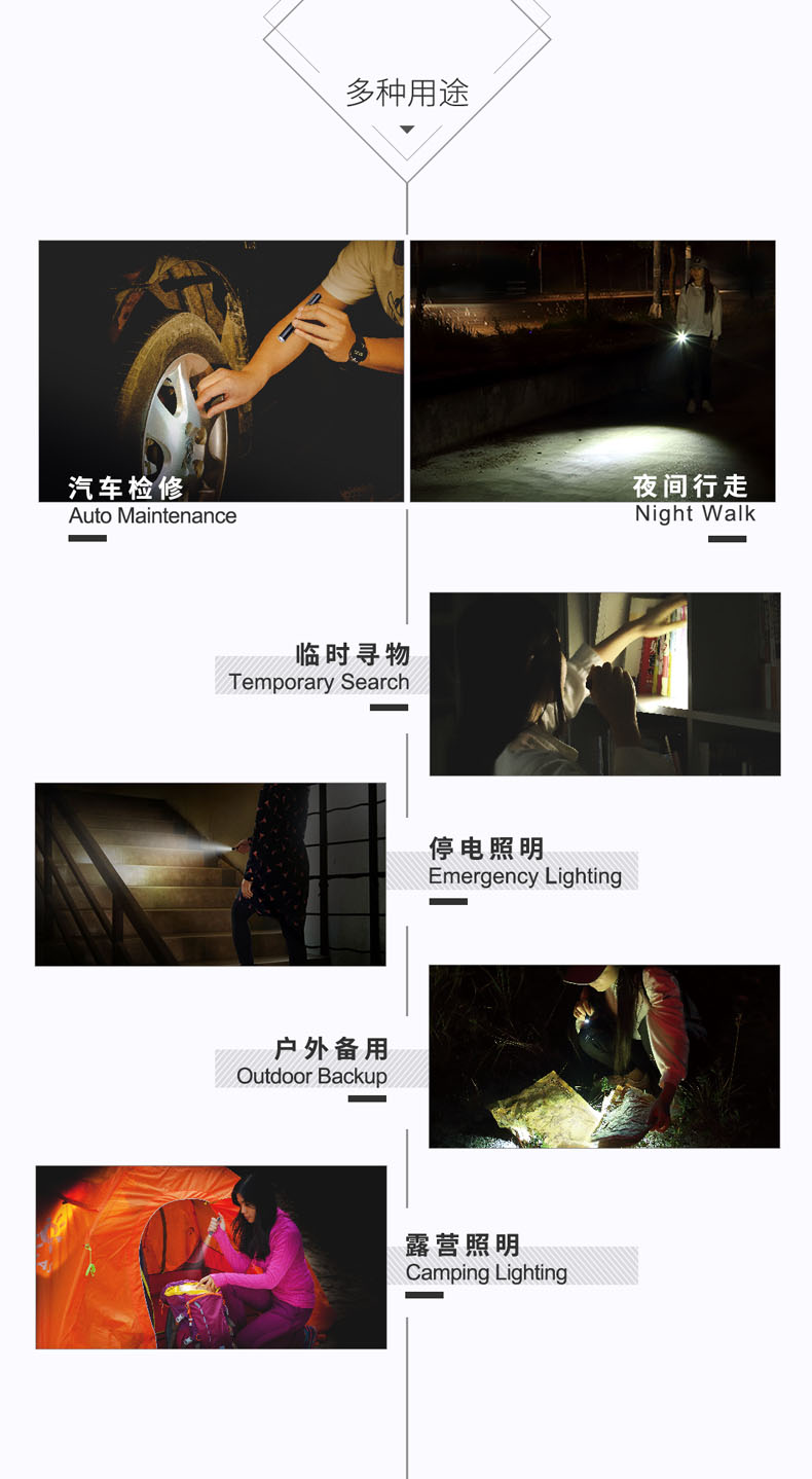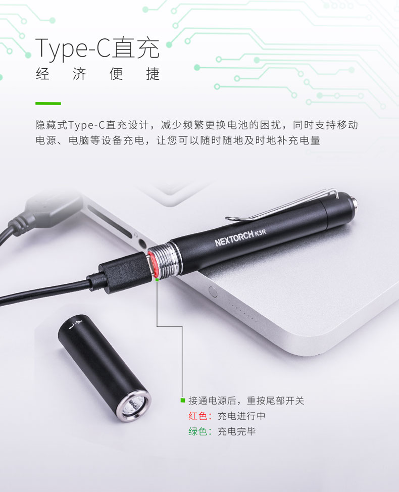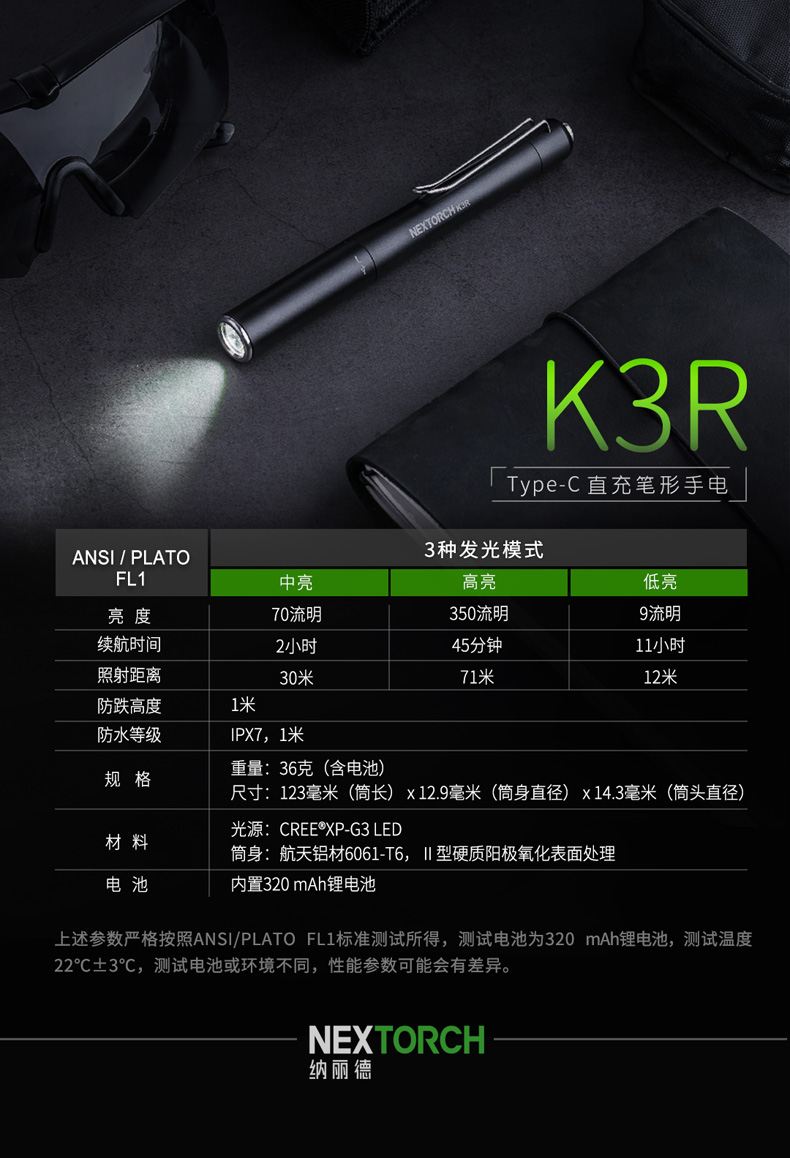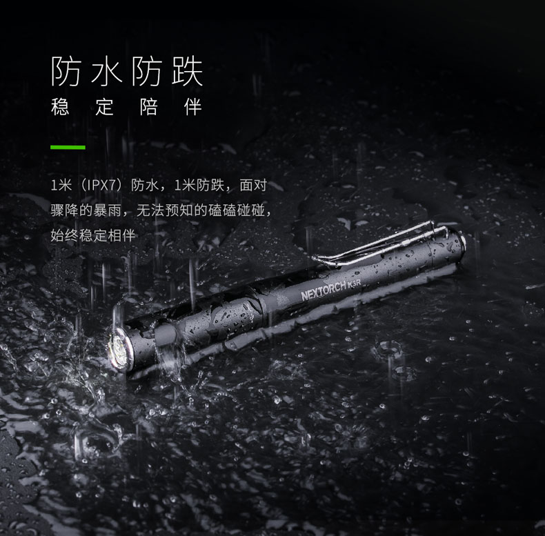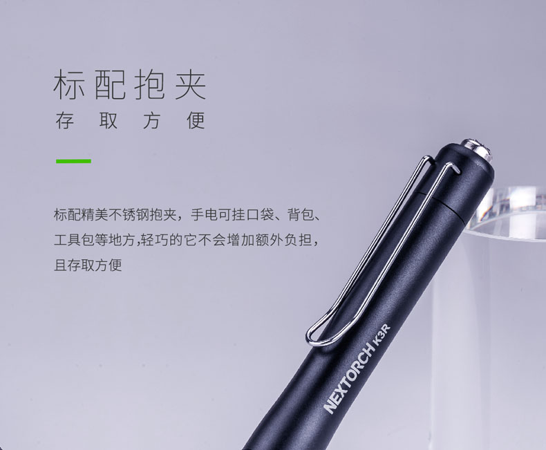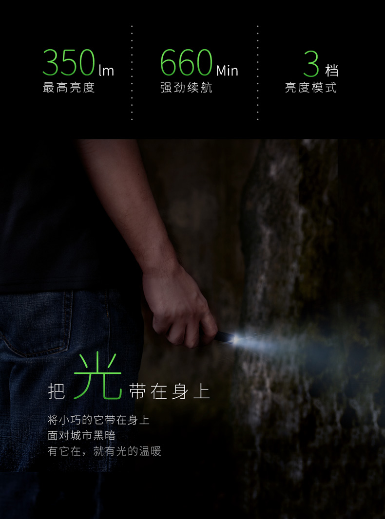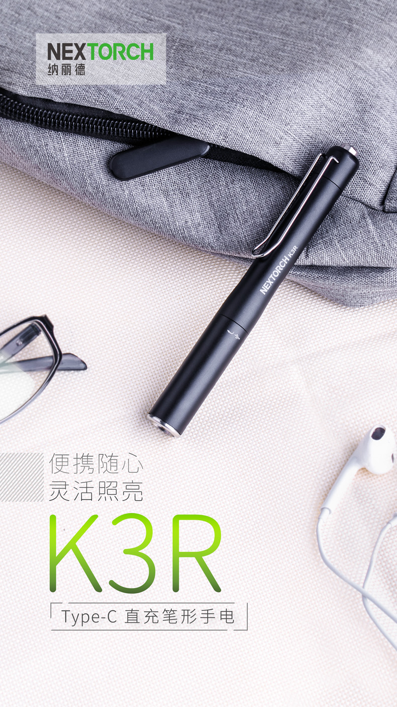K3R主打生活日用,350流明高亮输出,660分钟强劲续航,中-高-低3档亮度模式,足以满足日常生活的各种照明需求,简约实用,又别具时尚感。萃取钢笔设计理念,简约时尚;与钢笔相仿的大小,放入口袋也无碍,无论是室内使用,或是外出行走,皆可随心,给您及时的守护。