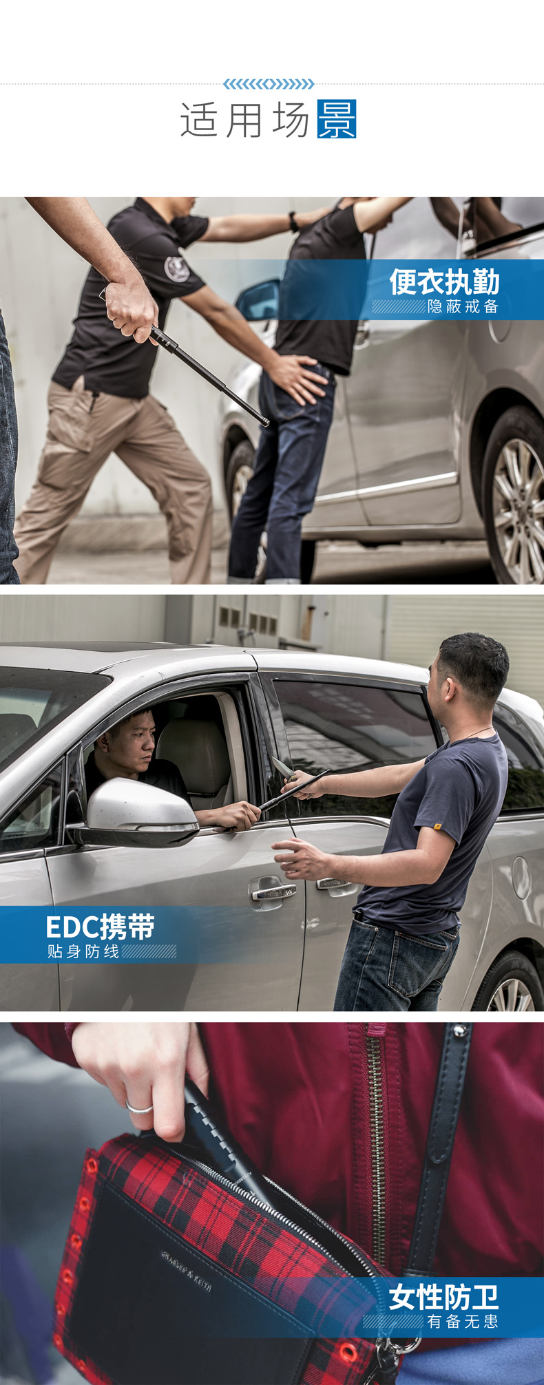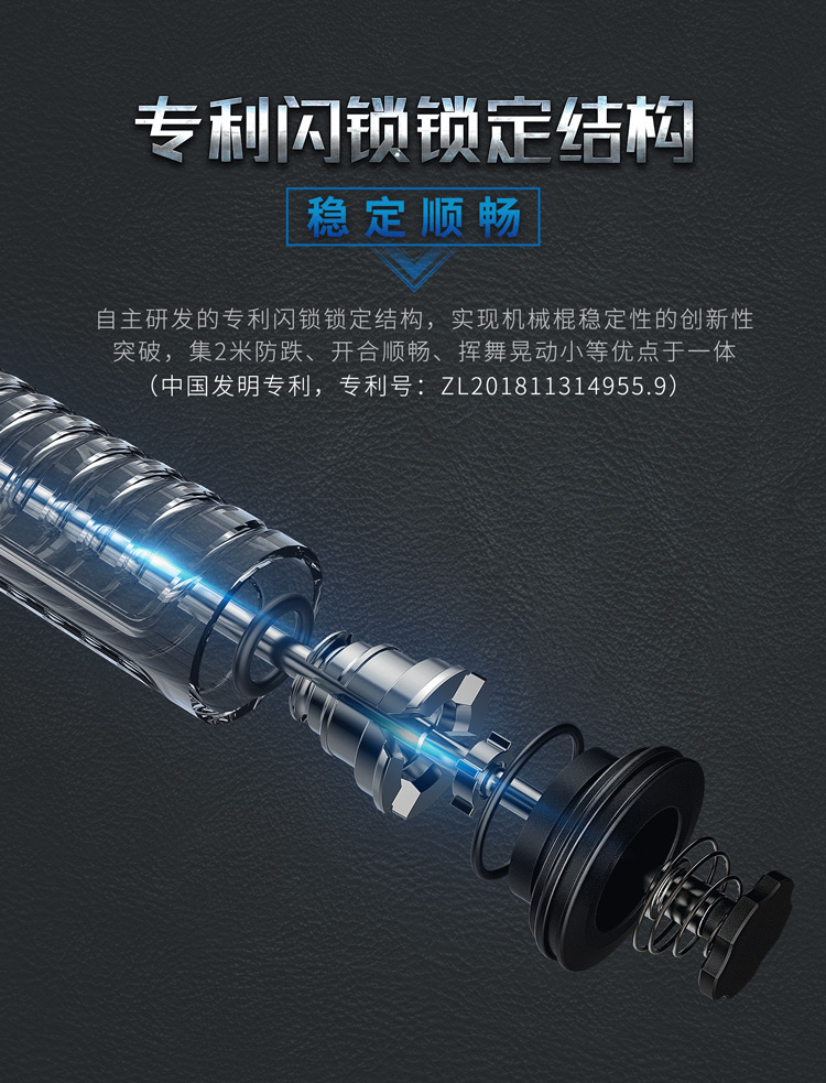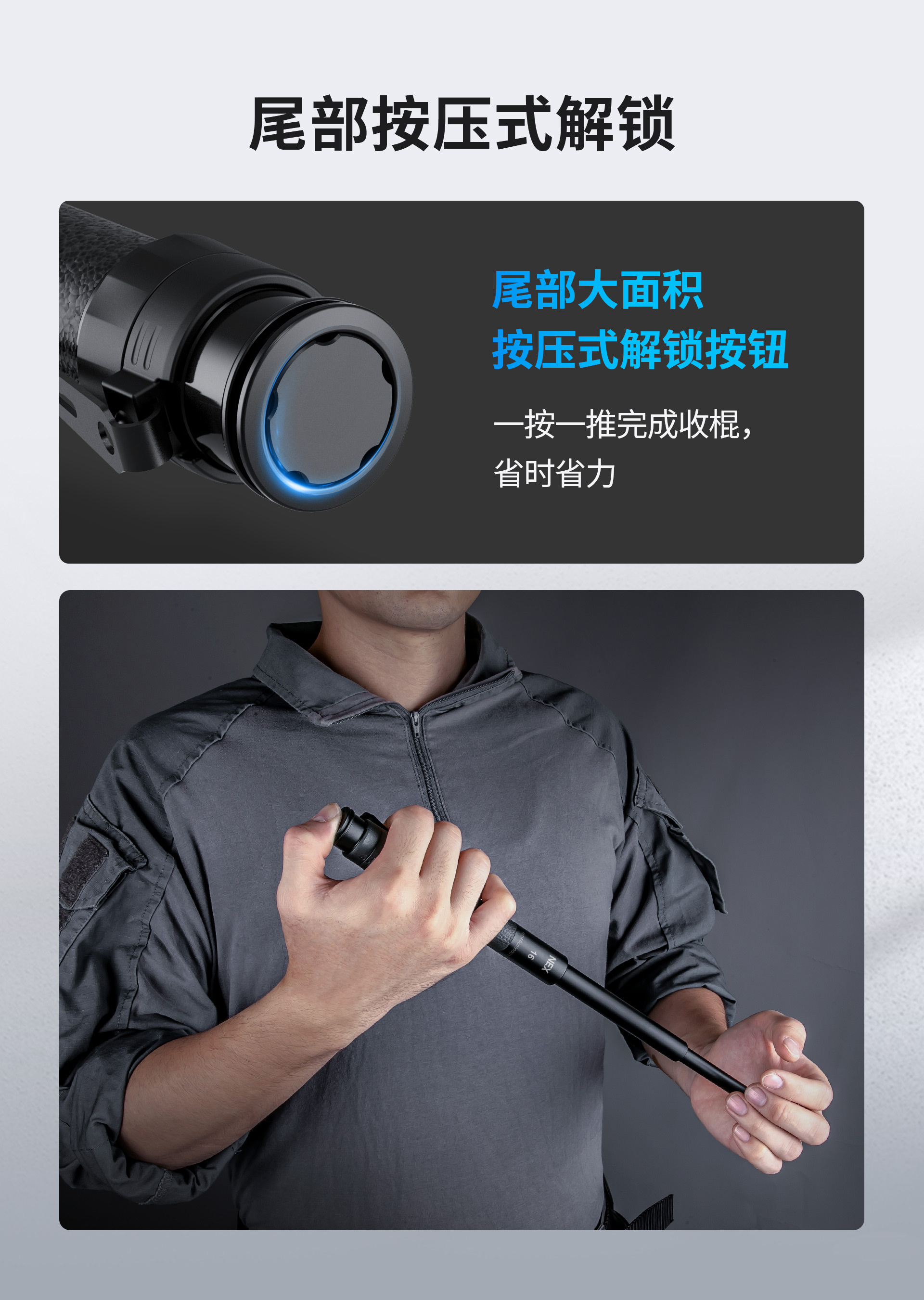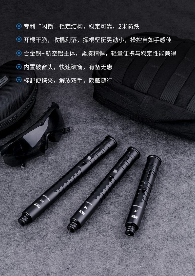 NEX 12寸行者隐蔽防卫便携棍,主打轻量便携。便携棍手柄有10处抱夹装载区,标配活动抱夹,支持正反夹持,便于甩棍隐藏于口袋、腰带、背包等地方,让甩棍的隐蔽携行性进一步突破,真正做到随身携行,随时出击。自主研发的“闪锁”锁定结构,实现了机械甩棍稳定性的创新性突破,集2米防跌、开合顺畅、挥舞晃动小等优点于一体,让NEX便携棍的锁定一旦到位,就犹如一棍。