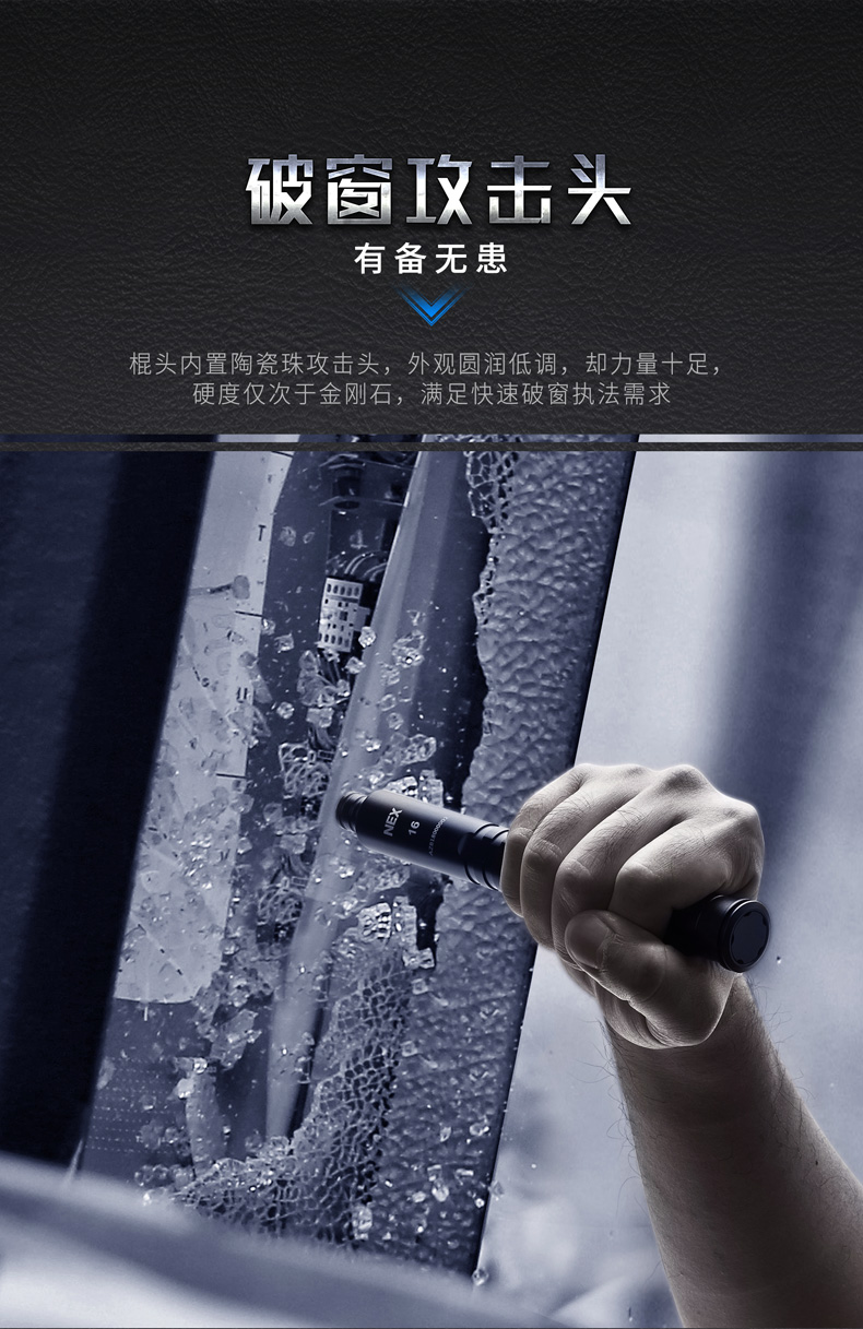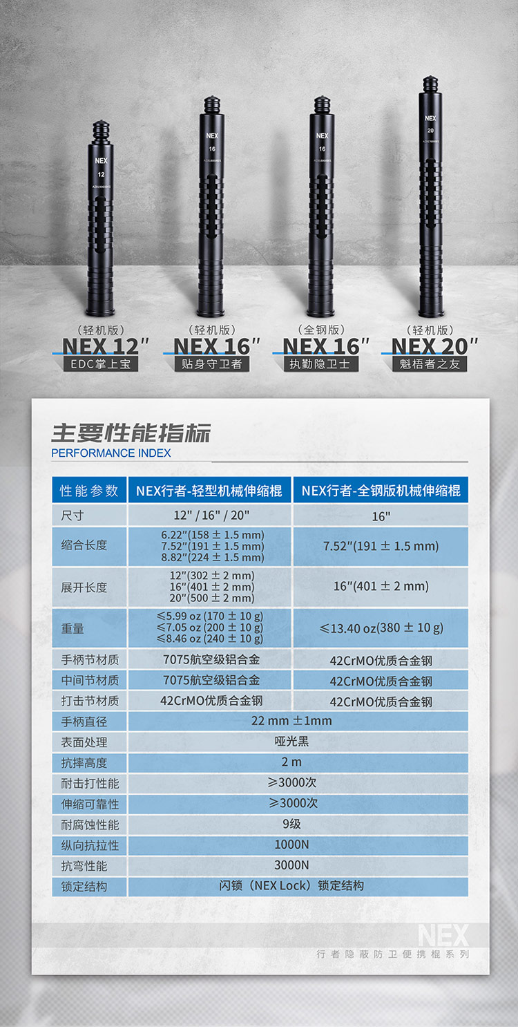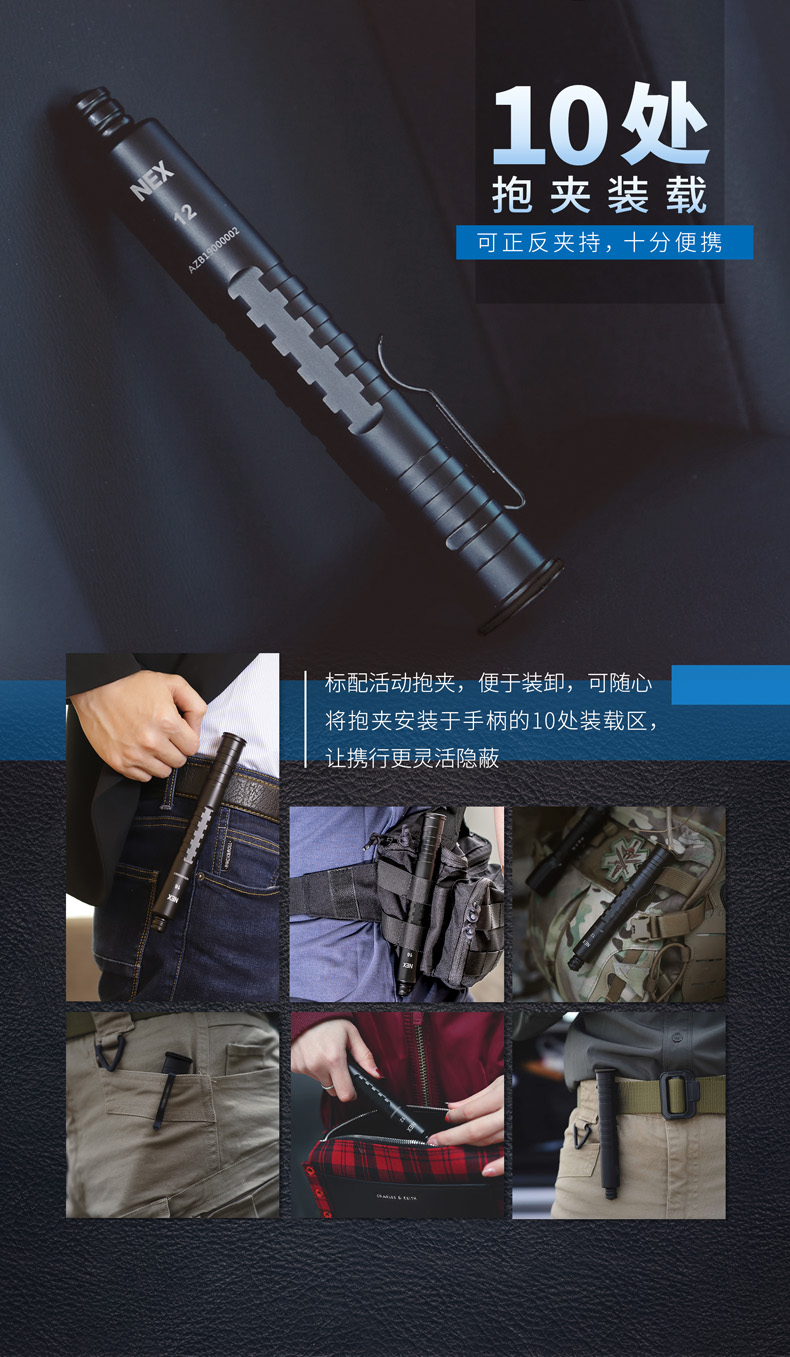NEX 20寸行者隐蔽防卫便携棍,主打轻量便携。便携棍手柄有10处抱夹装载区,标配活动抱夹,支持正反夹持,便于甩棍隐藏于口袋、腰带、背包等地方,让甩棍的隐蔽携行性进一步突破,真正做到随身携行,随时出击。自主研发的“闪锁”锁定结构,实现了机械甩棍稳定性的创新性突破,集2米防跌、开合顺畅、挥舞晃动小等优点于一体,让NEX便携棍的锁定一旦到位,就犹如一棍。