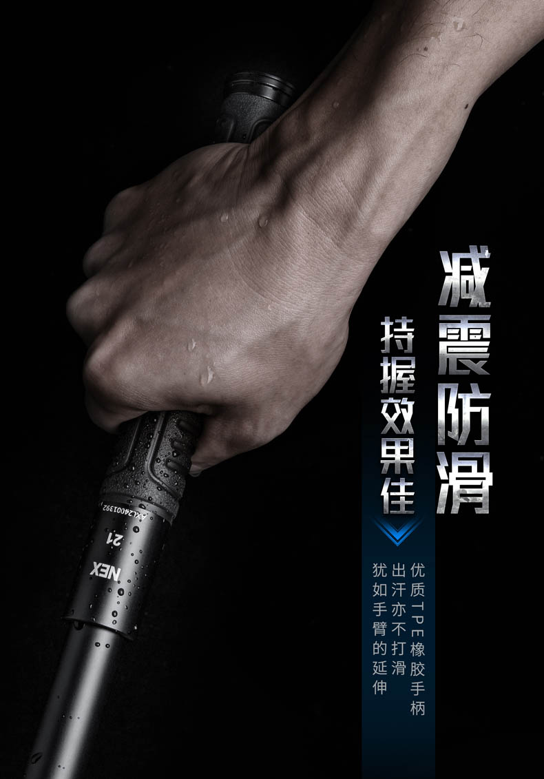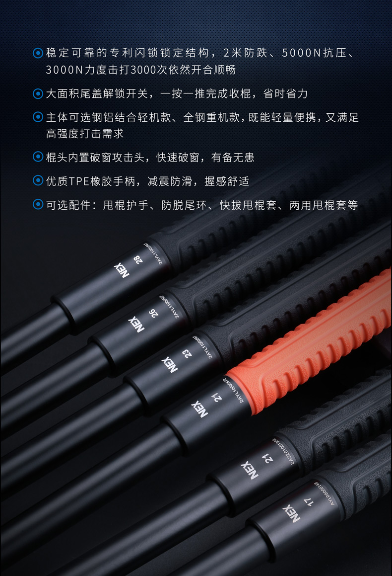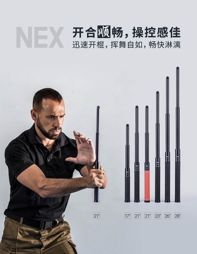 NEX快客勤务棍系列,沿用便携棍自主研发的“闪锁”锁定结构,实现了机械甩棍稳定性的创新性突破,集2米防跌、开合顺畅、挥舞晃动小等优点于一体,让NEX勤务棍的锁定一旦到位,就犹如一棍,是市面上少有的结构简单同时兼顾稳定性的锁定结构。棍头内置陶瓷珠攻击头,其硬度仅次于金刚石,可轻松击破钢化玻璃,可应用于徒手防卫、破窗营救、战术突入等危急环境,为你赢得宝贵的战术时机。17英寸(轻机)、21英寸(轻机/重机)、21英寸(红柄教官版)、23英寸(轻机/重机)、26英寸(重机)、28英寸(重机)8种型号可选,一举满足你的不同使用喜好,不管是外出执勤、个人防卫还是战术控制,皆能胜任,让你的安全多一道忠实可靠的屏障。