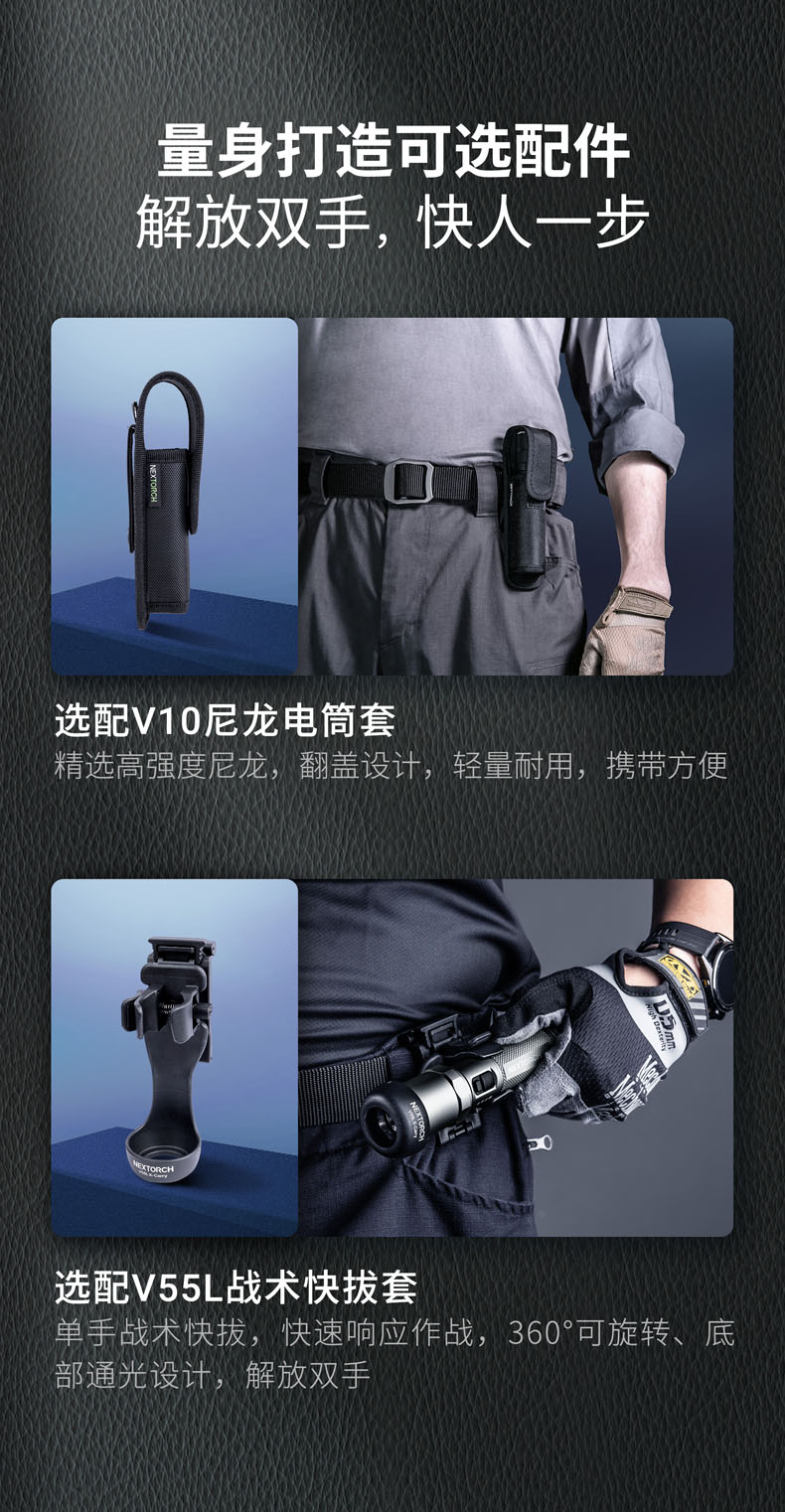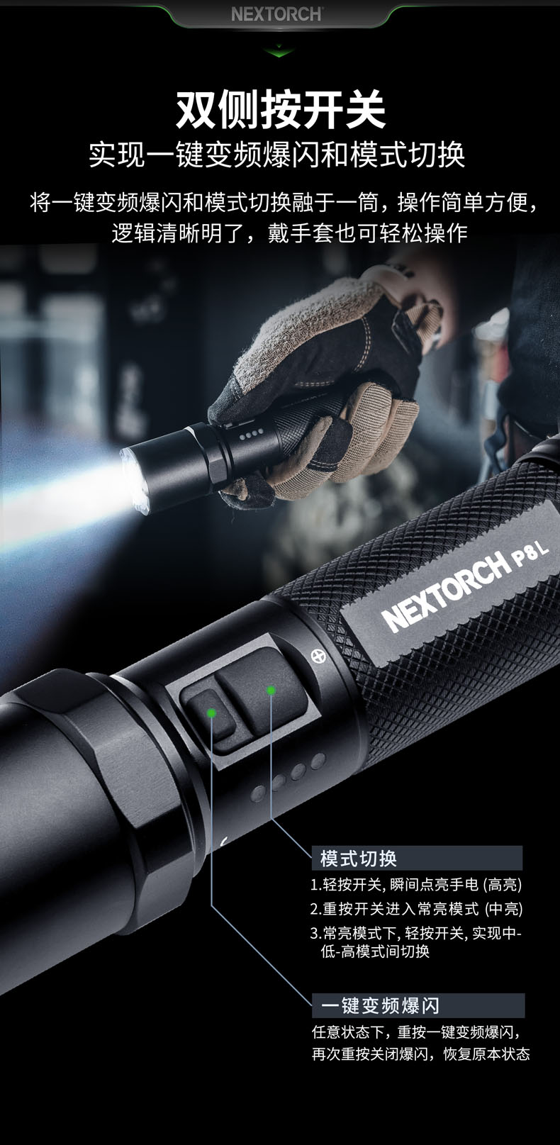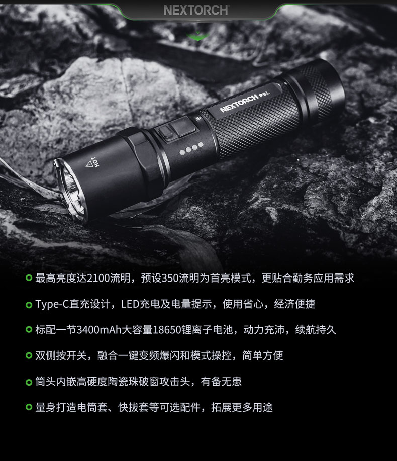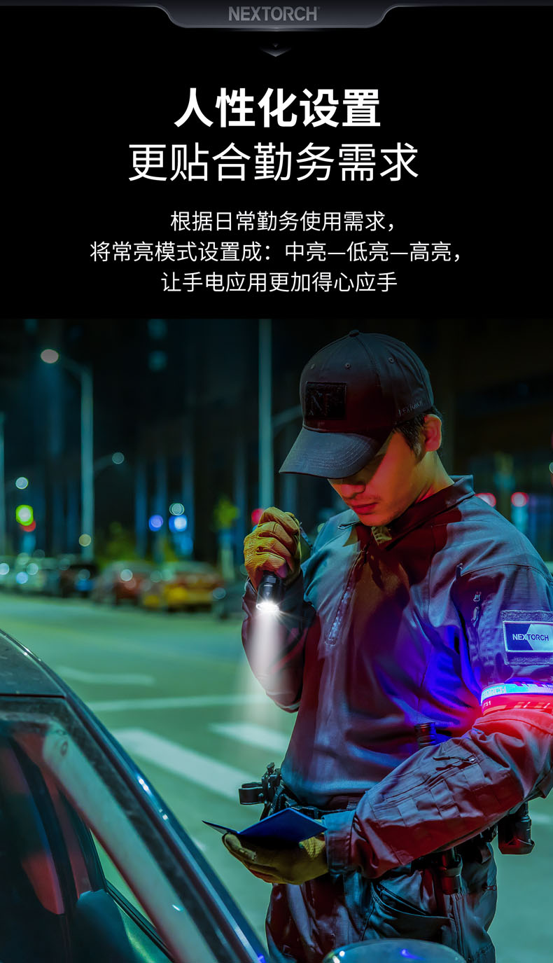 勤务行动是动态和复杂的,执法人员常常需要从日常执勤、警戒巡逻、设卡检查等勤务状态,切换到侦查搜索、对峙抓捕等战术行动。此时,勤务执法人员需要的是一支具备战术光效、耐用可靠、多档亮度、多种功能、可充电等特点的勤务手电,足以满足他们动态和复杂的勤务行动。纳丽德P8L,2100流明一键爆闪勤务手电,就是其中的佼佼者,专为勤务执法人员而来。