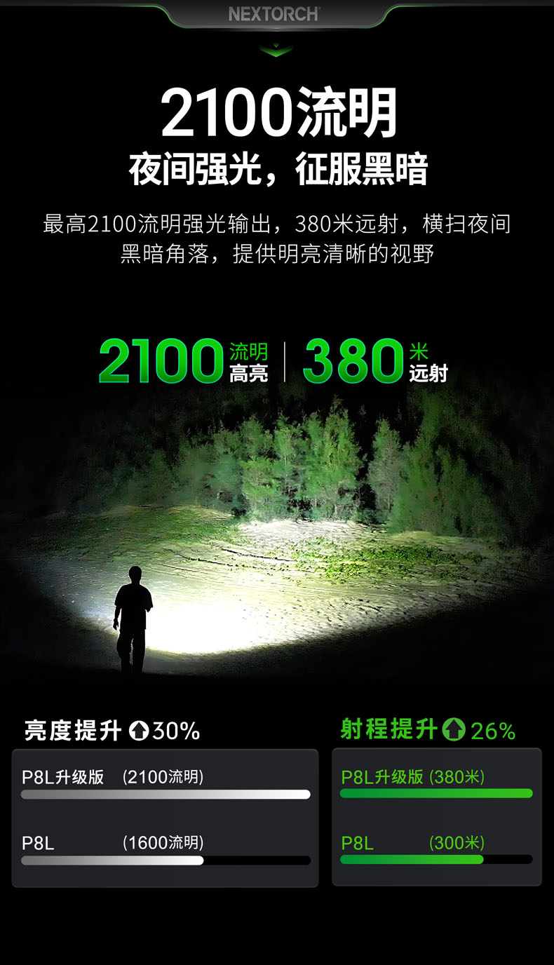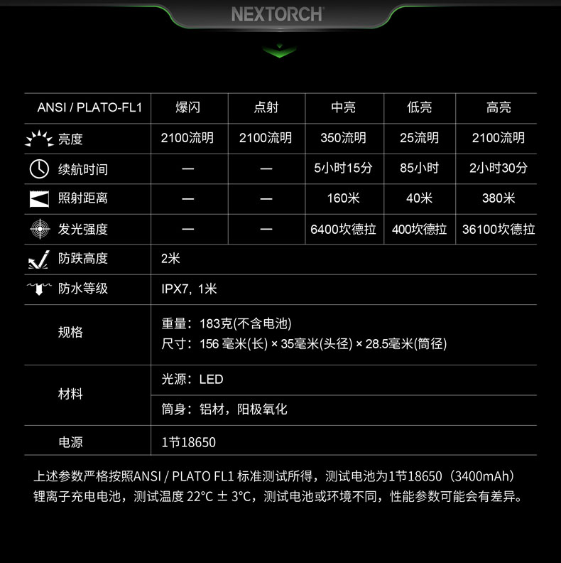 • • 亮度:350流明/25流明/2100流明/一键爆闪