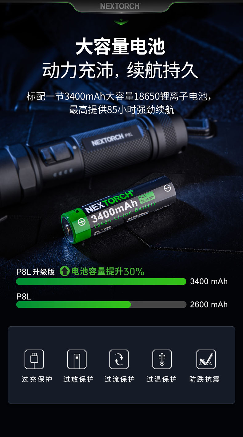 • • 电池:1 x 18650电池(3400mAh)