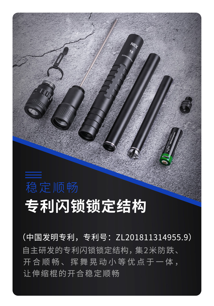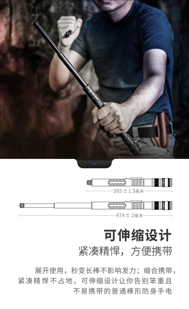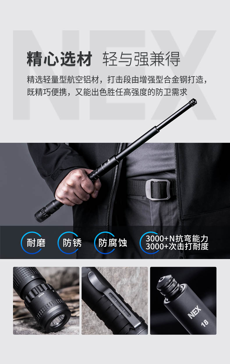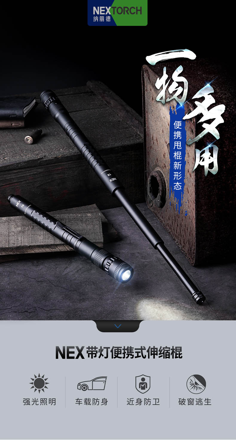 颠覆传统的NEX带灯便携式伸缩棍,便携棍与手电筒的强强联合,集强光照明/车载防身/贴身防卫/破窗逃生于一身, 让照明与防身功能同样出色,真正做到一物多用,满足你所需,是你一直在寻找的理想EDC装备。