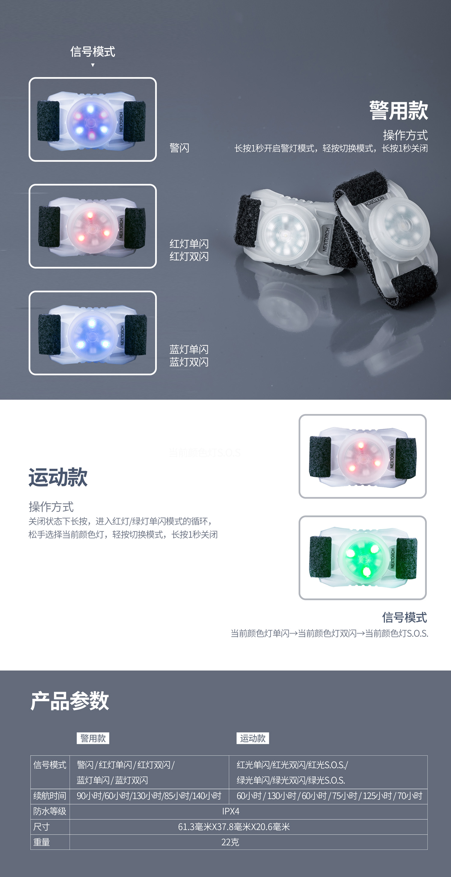 纳丽德信号标识灯,多光色、多信号模式设计,警用款带红蓝警闪功能,运动款使用红绿光源。夜间1000米以上的可视距离;标配魔术贴可装配在头盔、服装、MOLLE带等多种平台;使用可更换的纽扣电池,方便获取;IPX4防水等级,无惧风雨考验,稳定点亮;仅重22克,轻量便携。