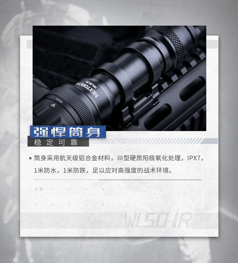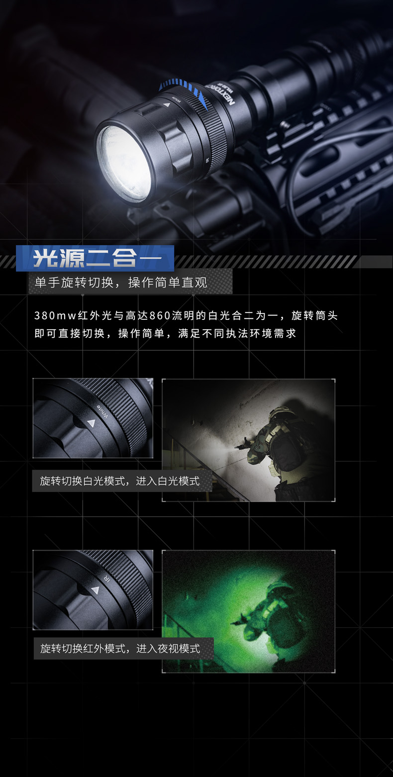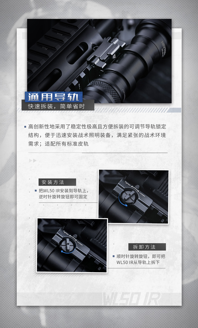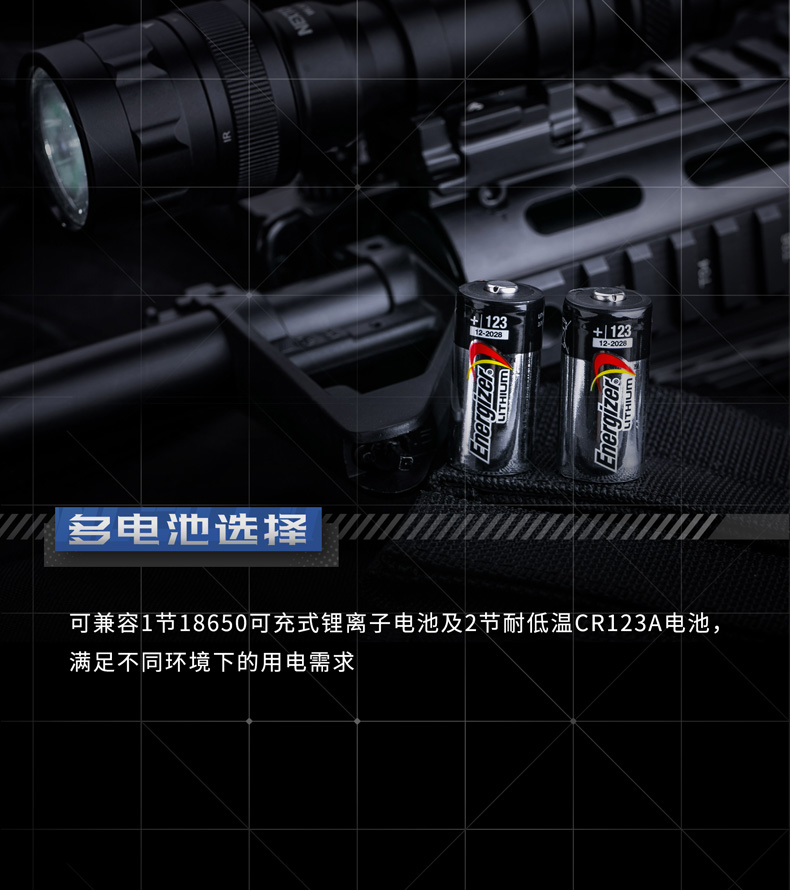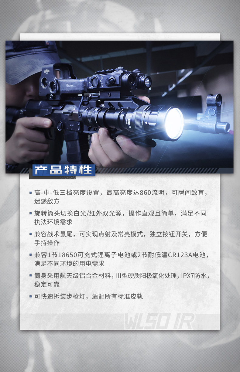 快速拆装步枪灯,适配所有标准皮轨;高—中—低三档亮度设置,满足不同环境照明需求;白光/红外双光源,可旋转筒头切换光源;兼容战术鼠尾开关,可实现战术点射及常亮模式,独立按钮开关,方便手持操作;兼容可充式18650锂离子电池及耐高低温CR123A锂电池,满足不同环境电源供应需求。