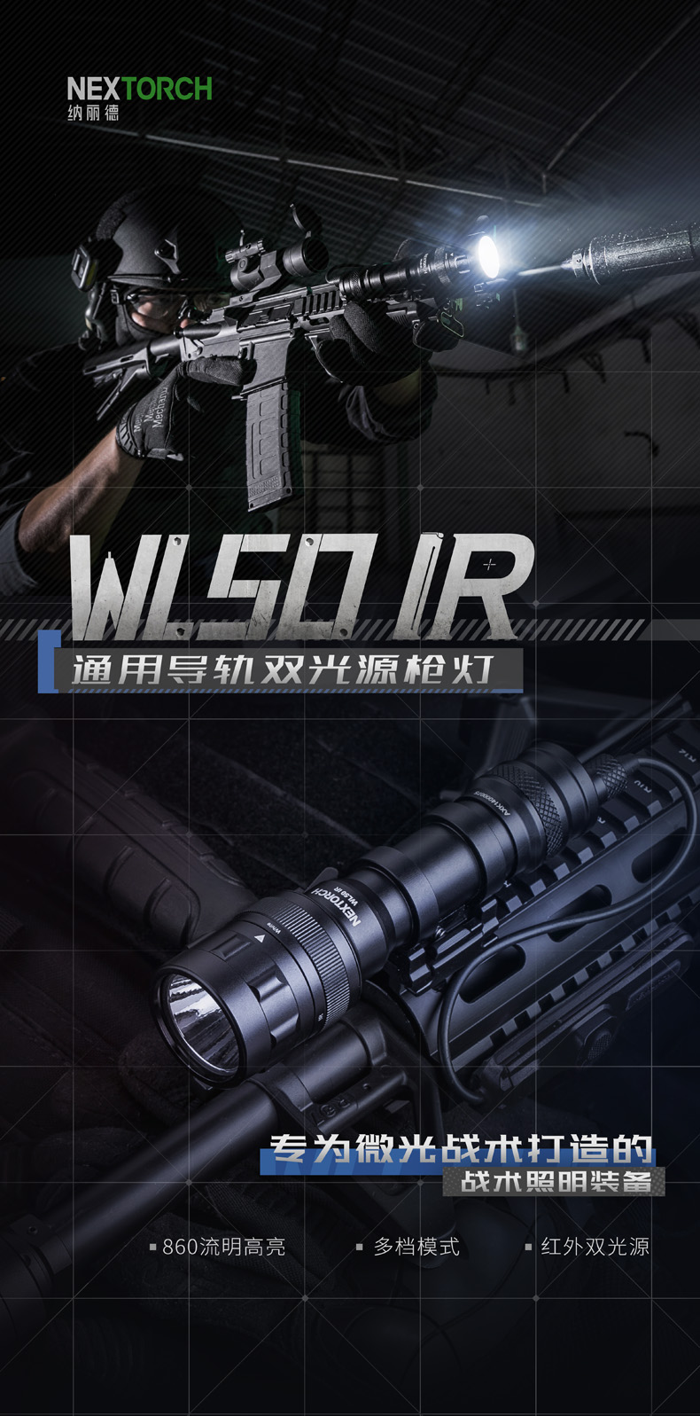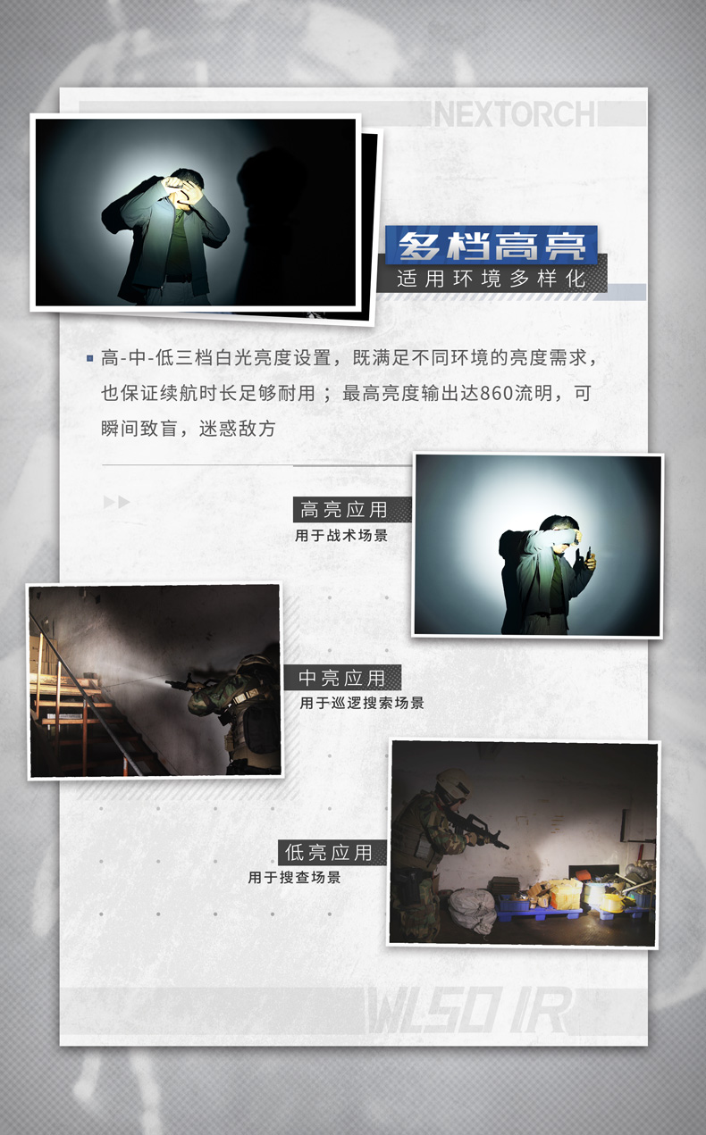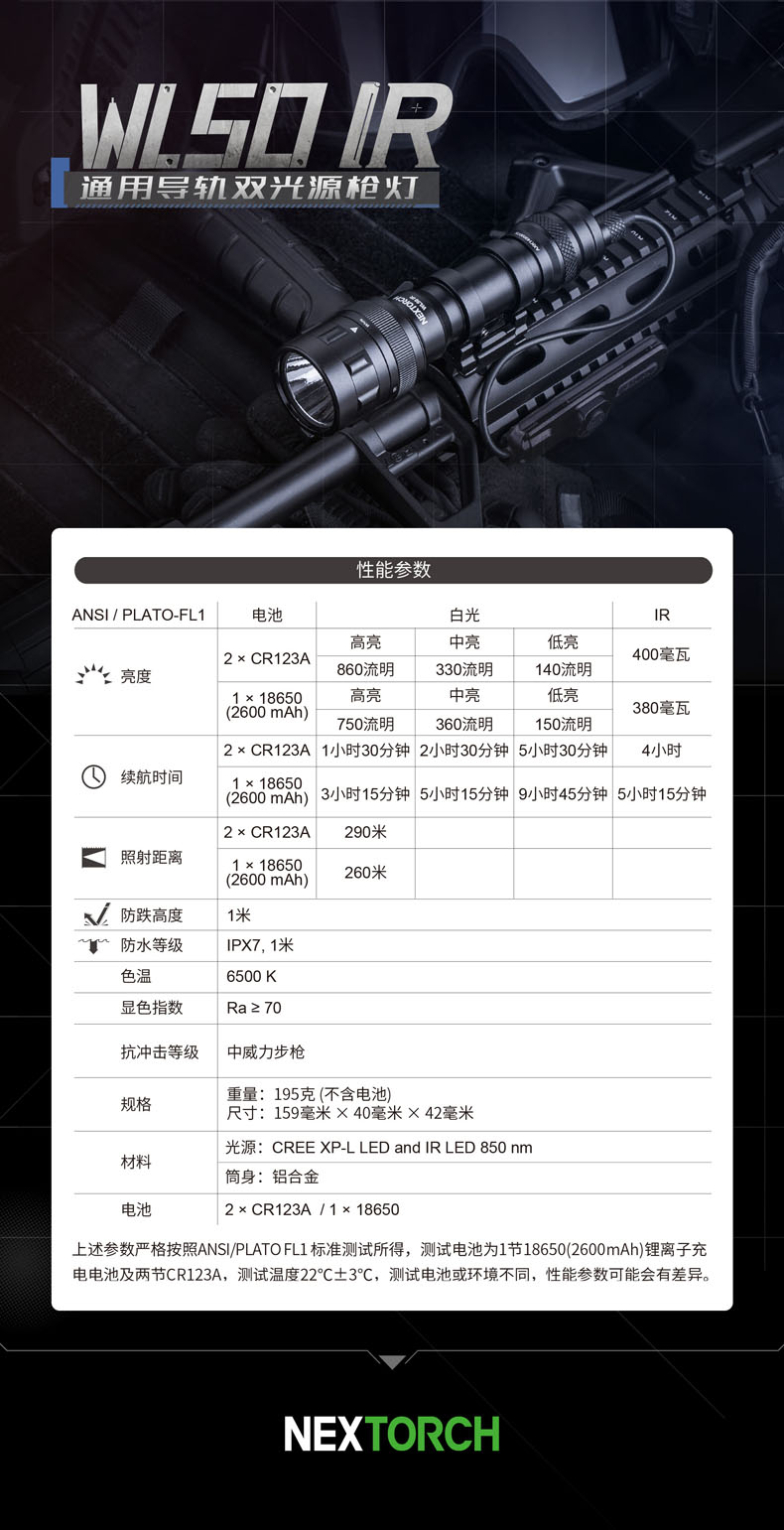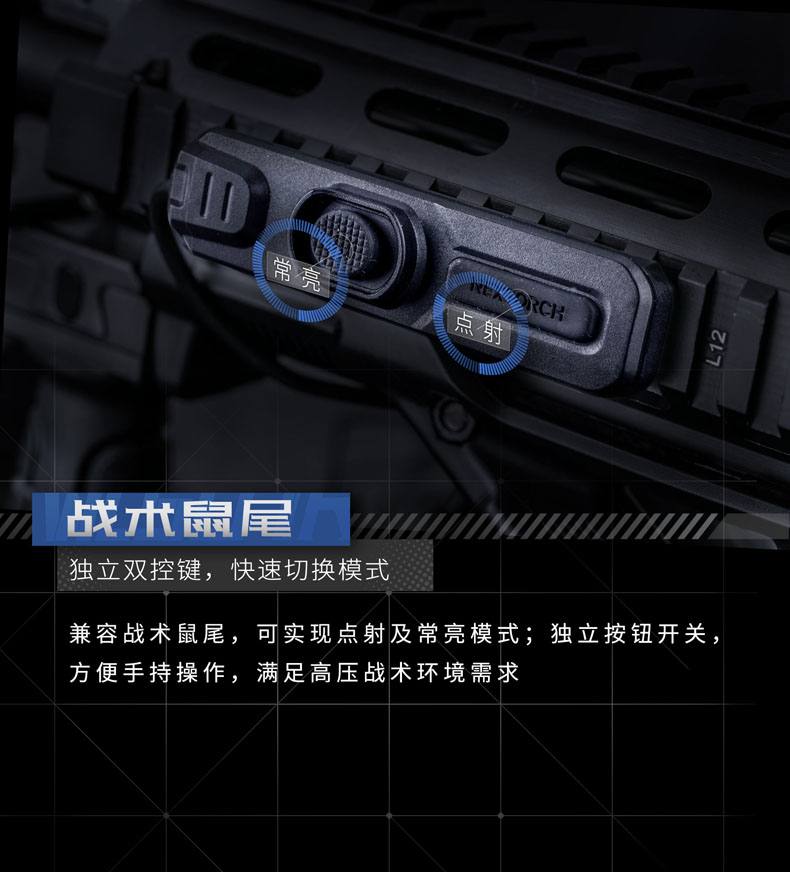 快速拆装步枪灯,适配所有标准皮轨;高—中—低三档亮度设置,满足不同环境照明需求;白光/红外双光源,可旋转筒头切换光源;兼容战术鼠尾开关,可实现战术点射及常亮模式,独立按钮开关,方便手持操作;兼容可充式18650锂离子电池及耐高低温CR123A锂电池,满足不同环境电源供应需求。