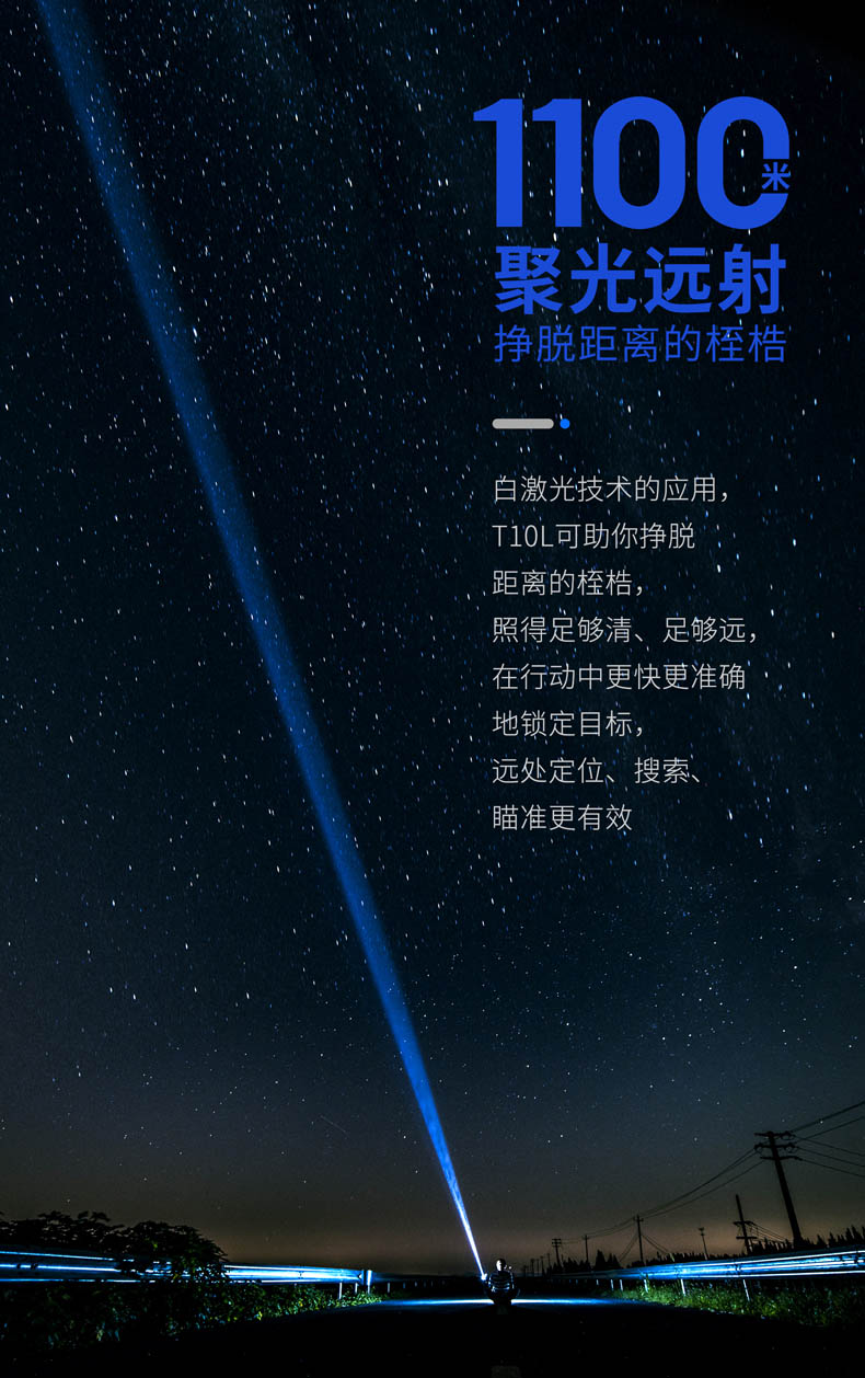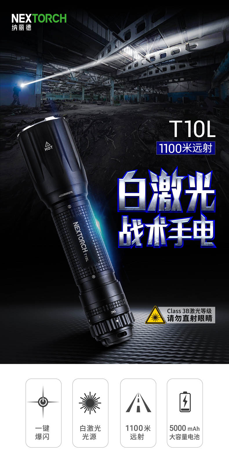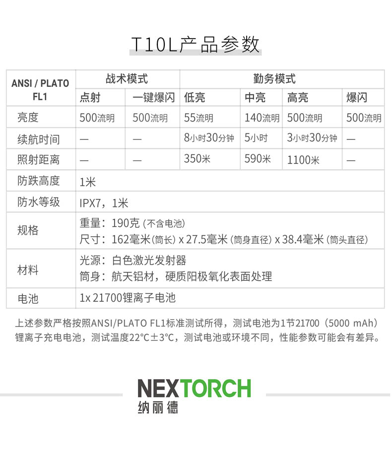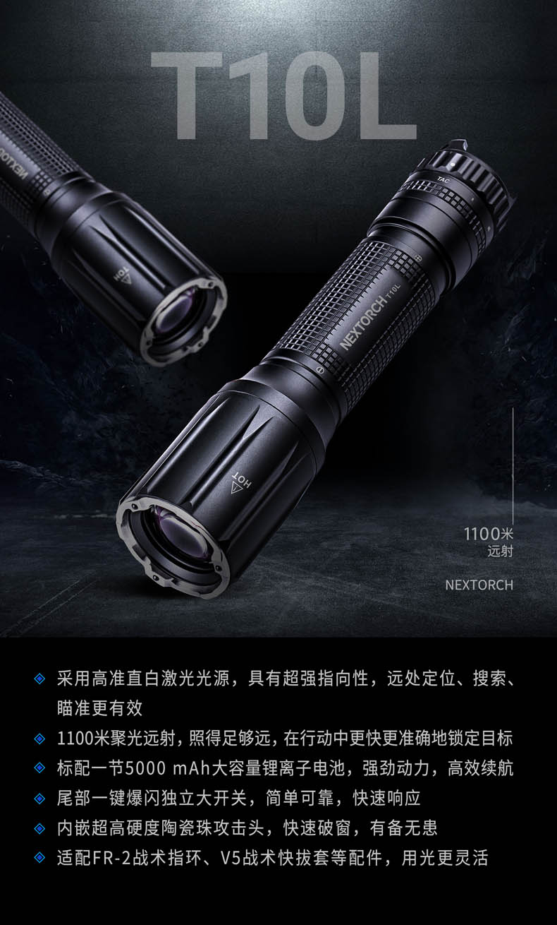 为了将白激光光源的战术价值发挥得更加淋漓尽致,纳丽德融合纳家经典战术手电TA30 MAX与白激光技术,带来一款既有战术手电简单清晰操作逻辑、一键爆闪瞬时响应,又有白激光光源高亮度、高准直特性的白激光战术手电T10L,各自优点的出色结合,为一线勤务工作奠定难以比拟的战术优势。白激光光源爆发巨大能量实现其他LED手电望尘莫及的千米射程,精悍紧凑、单手可控的体积颠覆传统探照灯硕大笨重的形象,超强指向性照明实现强有力的光线压制,远处追踪、定位、搜索、瞄准更有效。