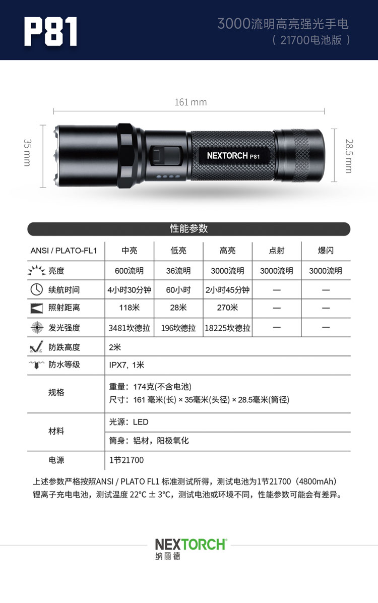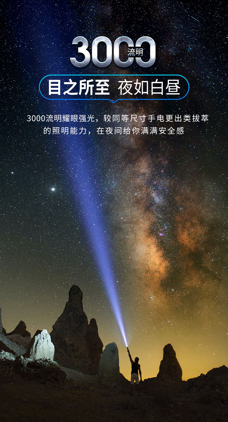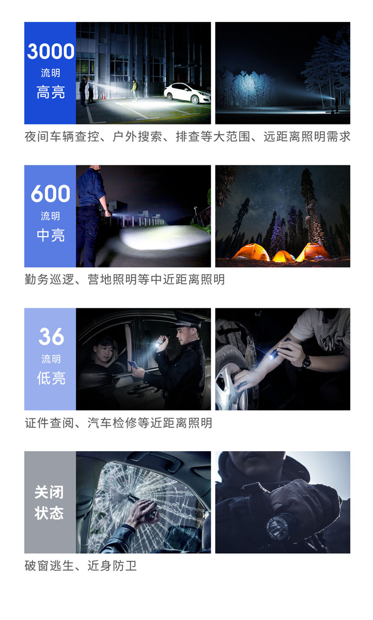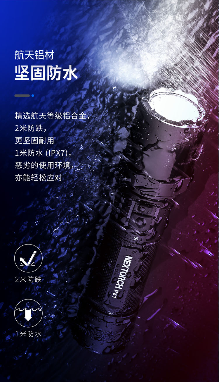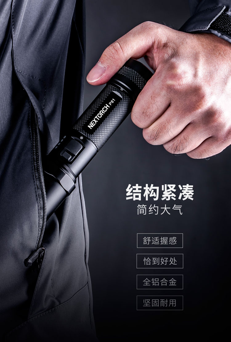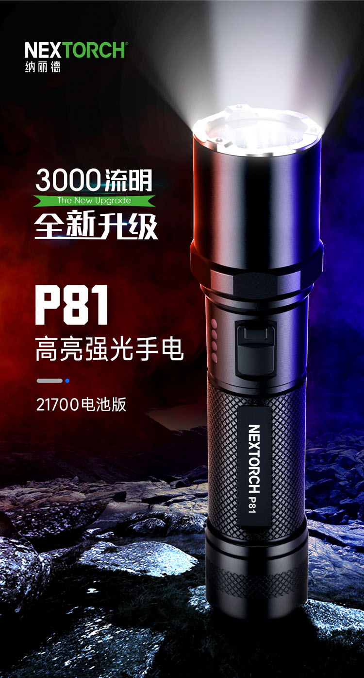 勤务执法人员需要从警戒巡逻、设卡检查等勤务状态,切换到侦查搜索、对峙抓捕等战术行动,一支专业可靠的勤务手电让他们如虎添翼;逃离城市的喧嚣去野外露营探险,面对大自然伸手不见五指的漆黑夜晚,一支明亮的手电给你的户外之旅增趣添亮和安全保护;出于对黑暗天生的恐惧,我们下意识地去寻找光明所在,将一支多功能的手电带在身边,让光明与安全随行。纳丽德P81,3000流明高亮小太阳,仅它便可解决勤务战术、户外探险、生活日用等场景的照明需求,是你身边的全能搭档。