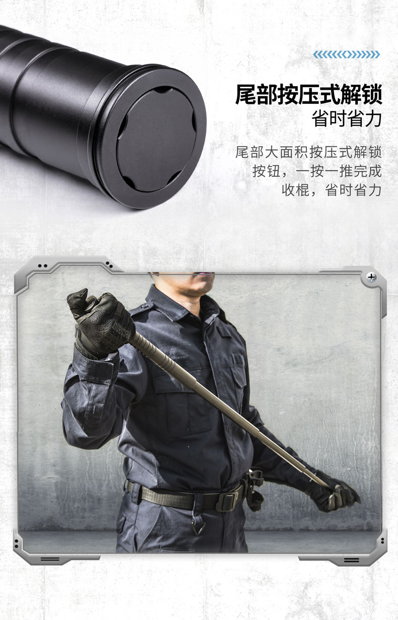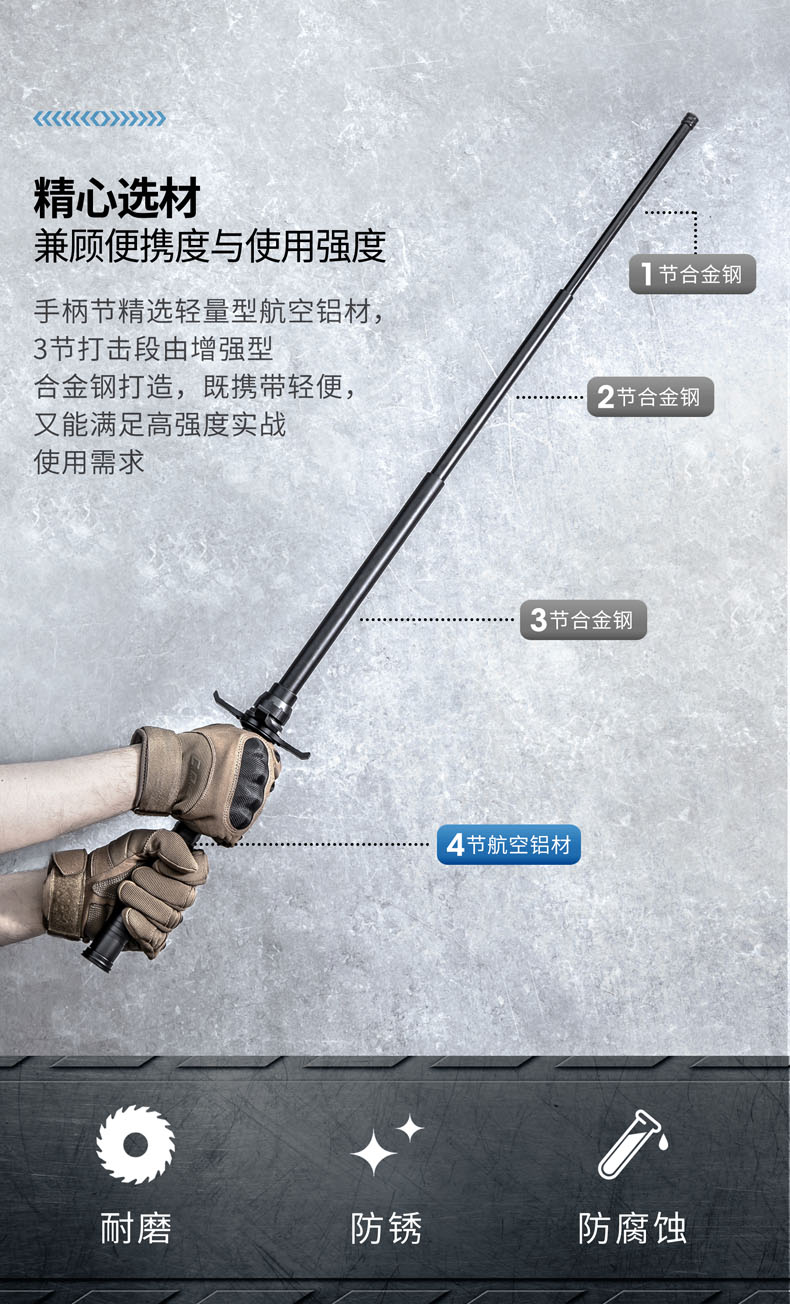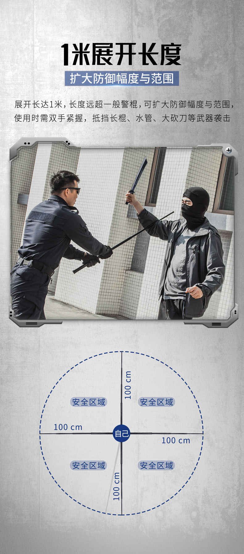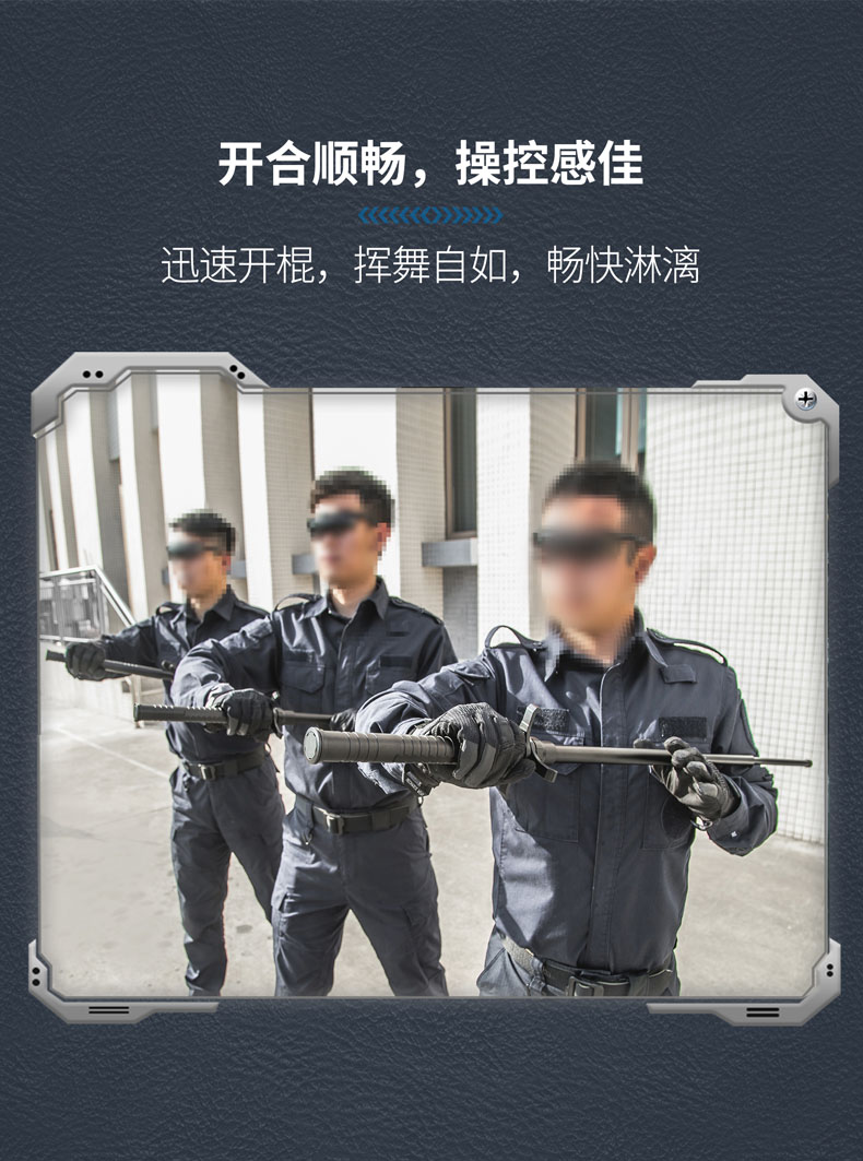 NEX版“大宝剑”,39″四节伸缩防暴棍,采用机械棍便携的伸缩设计,同时拥有“大宝剑”的超强震慑力,颠覆你对机械棍的已有认知,是目前市面上武力等级最高的机械棍。长达1米的展开长度,是主流21寸机械棍1.5倍,展现超强震慑力,带来更长的攻击距离和防御范围;NEX机械棍王牌“闪锁”结构加持,实现一如既往的稳定可靠、开合顺畅、抗打耐操;区别于传统防暴棍,其可伸缩设计更便于携带……NEX版“大宝剑”,39″四节伸缩防暴棍,专为警察与执法部门而来。NEX 39″四节伸缩防暴棍,与一般机械棍的差别不仅在于长度和重量的增加,而是截然不同的两种状态,其攻击距离长,威慑性强,适合处置刀斧砍杀、武疯子、群体性事件之类案件,是执勤时的有力帮手。