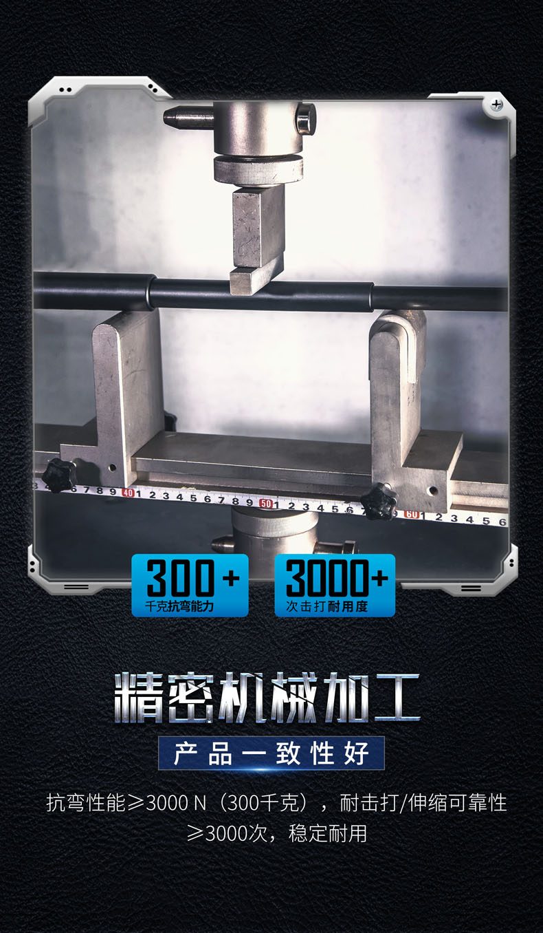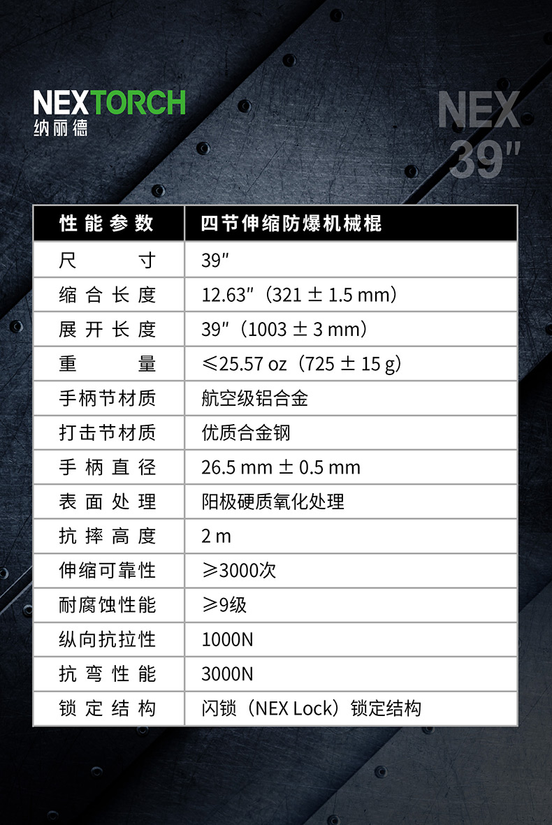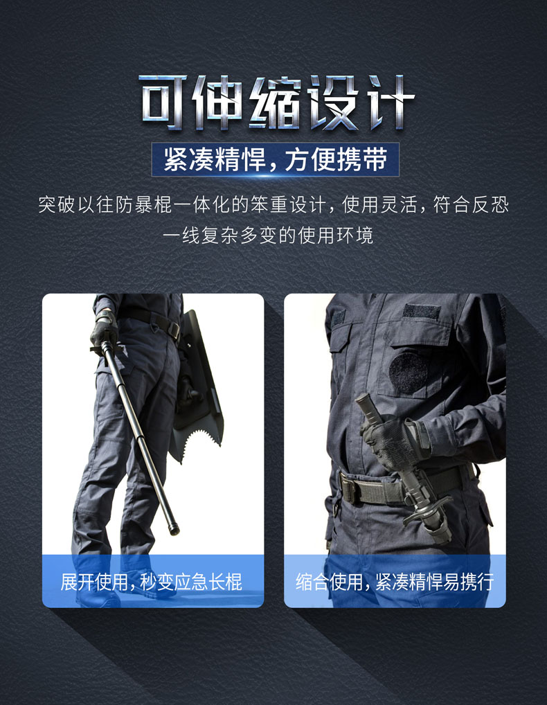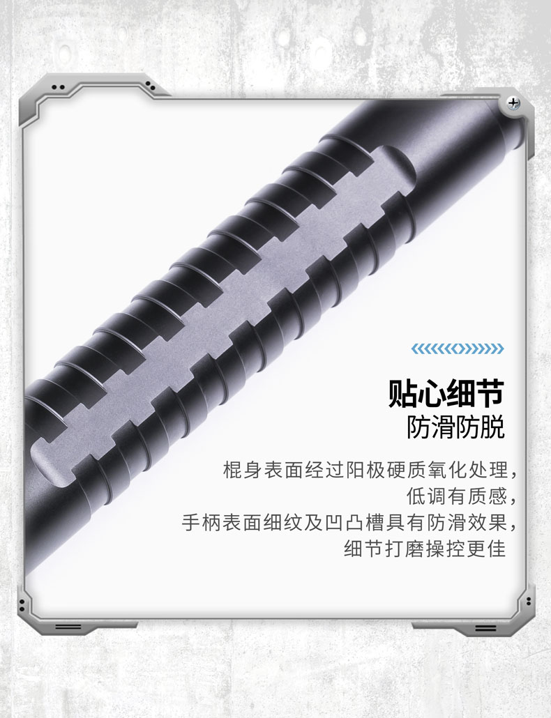 NEX版“大宝剑”,39″四节伸缩防暴棍,采用机械棍便携的伸缩设计,同时拥有“大宝剑”的超强震慑力,颠覆你对机械棍的已有认知,是目前市面上武力等级最高的机械棍。长达1米的展开长度,是主流21寸机械棍1.5倍,展现超强震慑力,带来更长的攻击距离和防御范围;NEX机械棍王牌“闪锁”结构加持,实现一如既往的稳定可靠、开合顺畅、抗打耐操;区别于传统防暴棍,其可伸缩设计更便于携带……NEX版“大宝剑”,39″四节伸缩防暴棍,专为警察与执法部门而来。NEX 39″四节伸缩防暴棍,与一般机械棍的差别不仅在于长度和重量的增加,而是截然不同的两种状态,其攻击距离长,威慑性强,适合处置刀斧砍杀、武疯子、群体性事件之类案件,是执勤时的有力帮手。