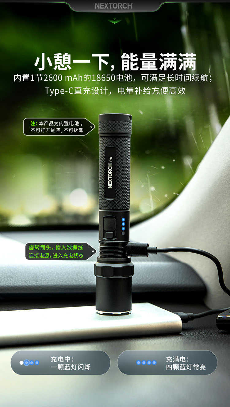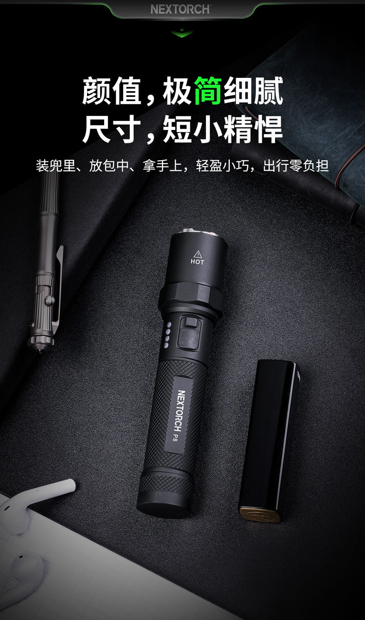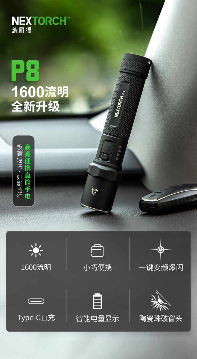 纳丽德P8高亮便携直充小手电,1600流明高亮、与签字笔相仿的娇小身躯、Type-C直充获电、带破窗攻击头设计……把轻盈小巧的P8放进随身必备品,旅途携行零负担,让你镇定从容地面对旅途中、生活里突如其来的黑暗时刻。