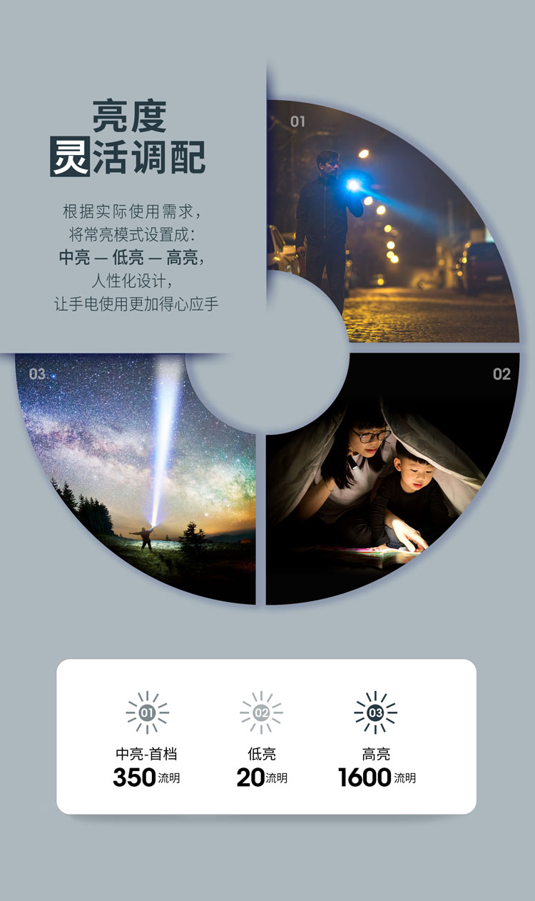 • • 亮度:爆闪/350流明/20流明/1600流明