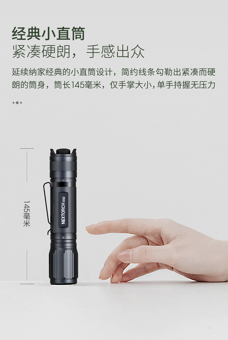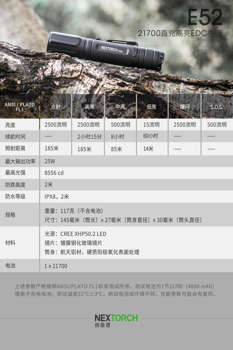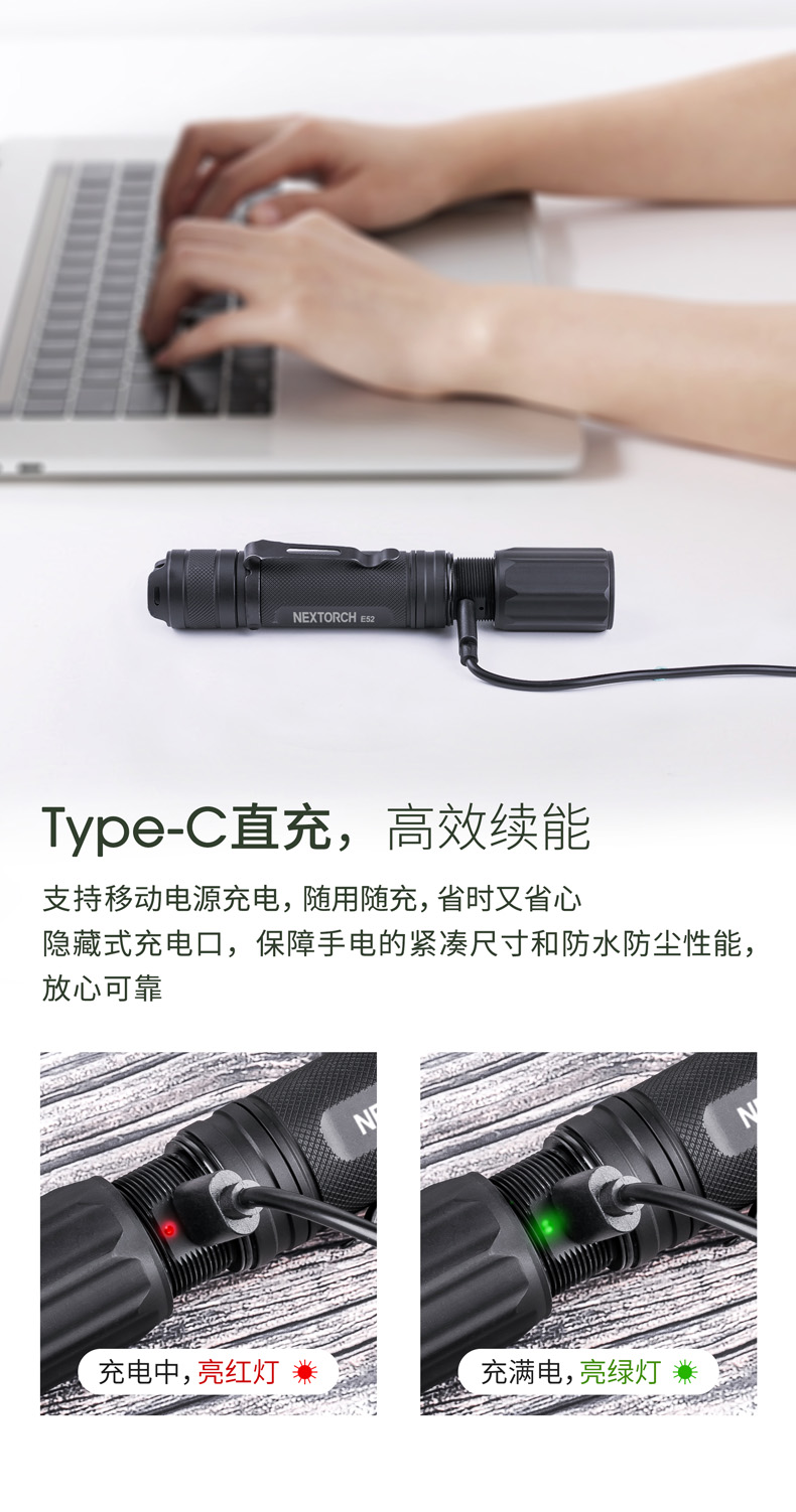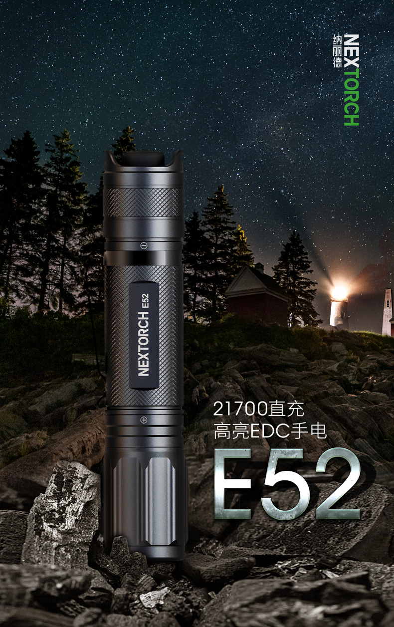 E52是一款高性能Type-C直充EDC小直筒,最高亮度达2500流明,在黑暗环境中亦能带来亮如白昼的使用体验。使用一节可充电的21700锂离子电池供电,动力强劲,续航持久。带Type-C直充设计,高效充电,经济便捷。预设高-中-低-隐藏式爆闪-S.O.S.五种模式,满足更多照明需求。尾部正向开关,一键实现轻触点射、模式切换及双击爆闪,单手即可操作。直型紧凑外观,仅手掌大小,搭配精美不锈钢抱夹、手绳,便携随行。