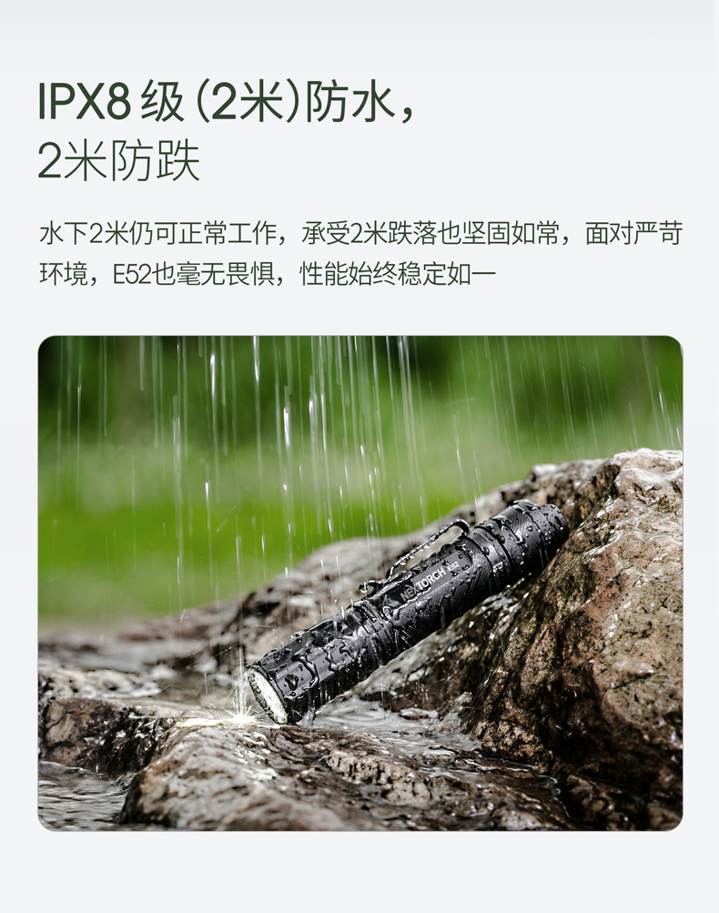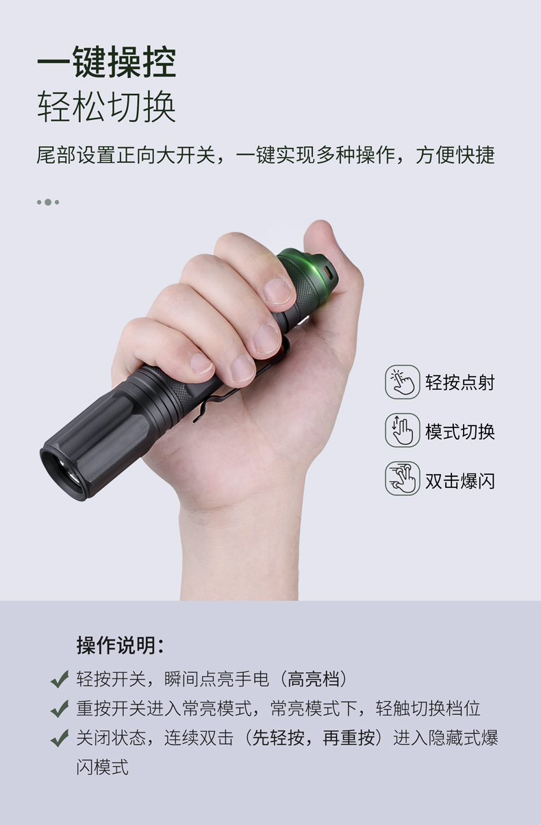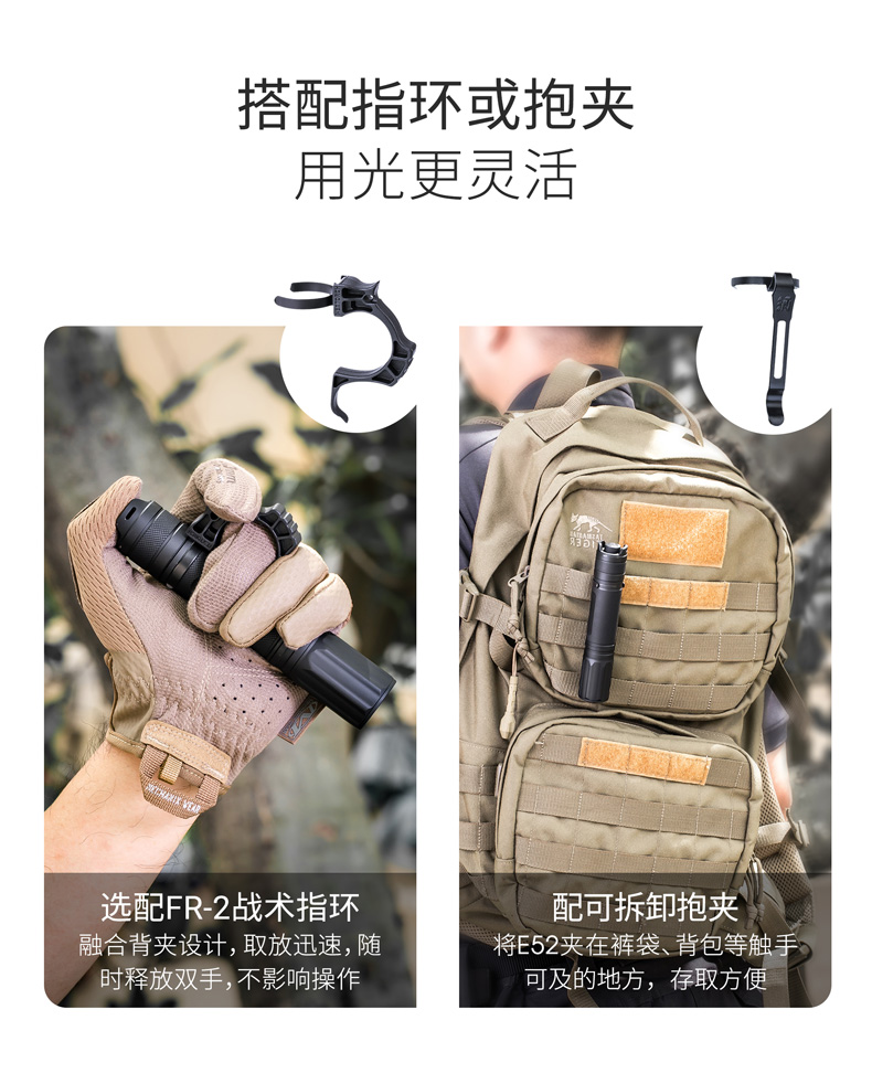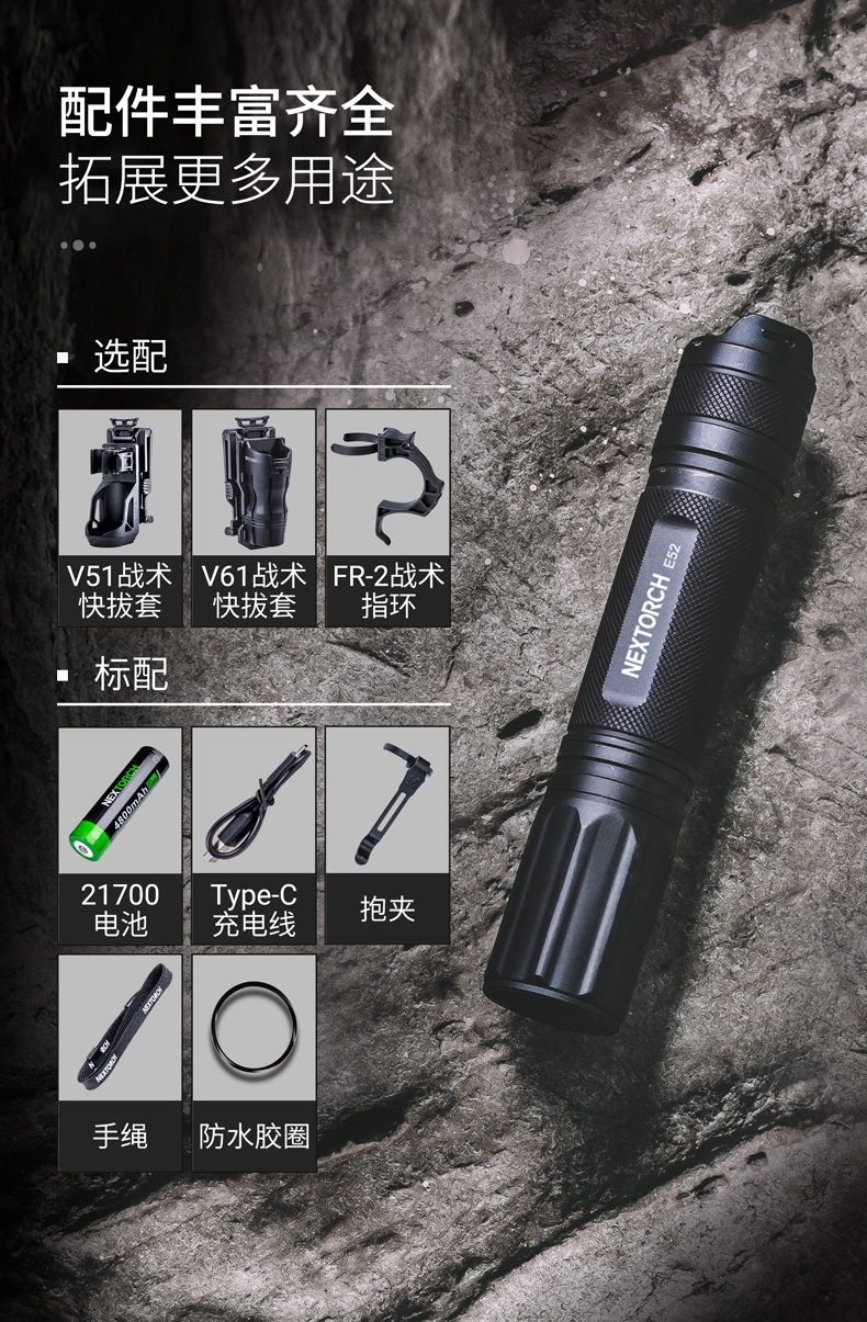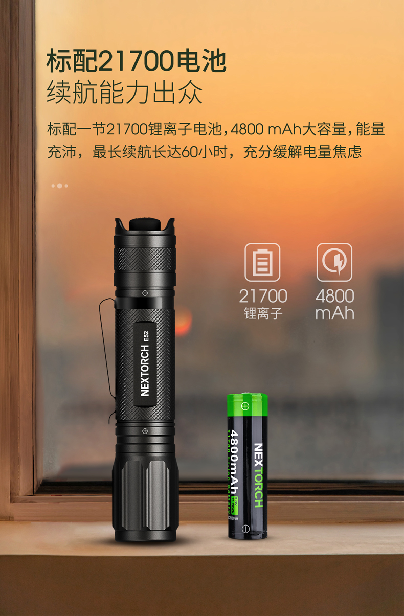E52是一款高性能Type-C直充EDC小直筒,最高亮度达2500流明,在黑暗环境中亦能带来亮如白昼的使用体验。使用一节可充电的21700锂离子电池供电,动力强劲,续航持久。带Type-C直充设计,高效充电,经济便捷。预设高-中-低-隐藏式爆闪-S.O.S.五种模式,满足更多照明需求。尾部正向开关,一键实现轻触点射、模式切换及双击爆闪,单手即可操作。直型紧凑外观,仅手掌大小,搭配精美不锈钢抱夹、手绳,便携随行。