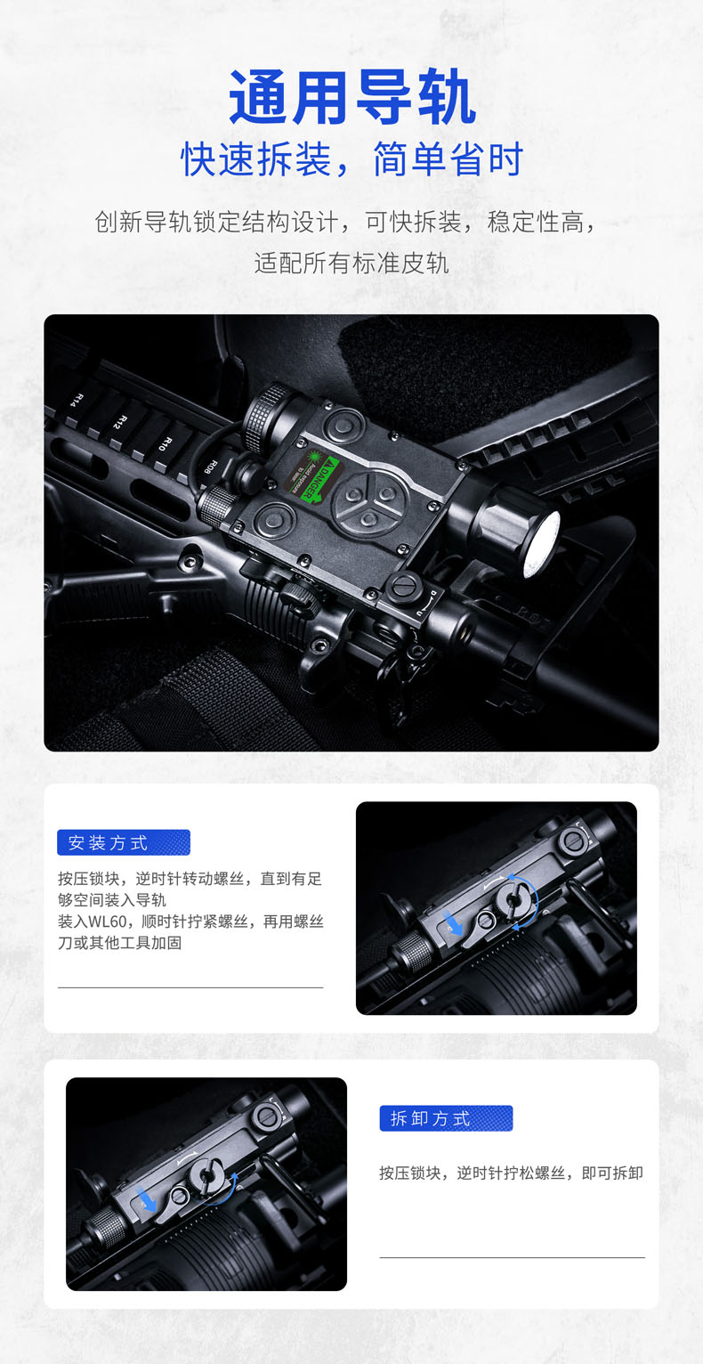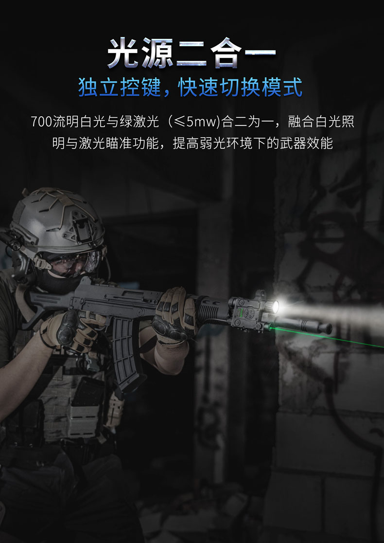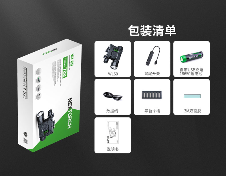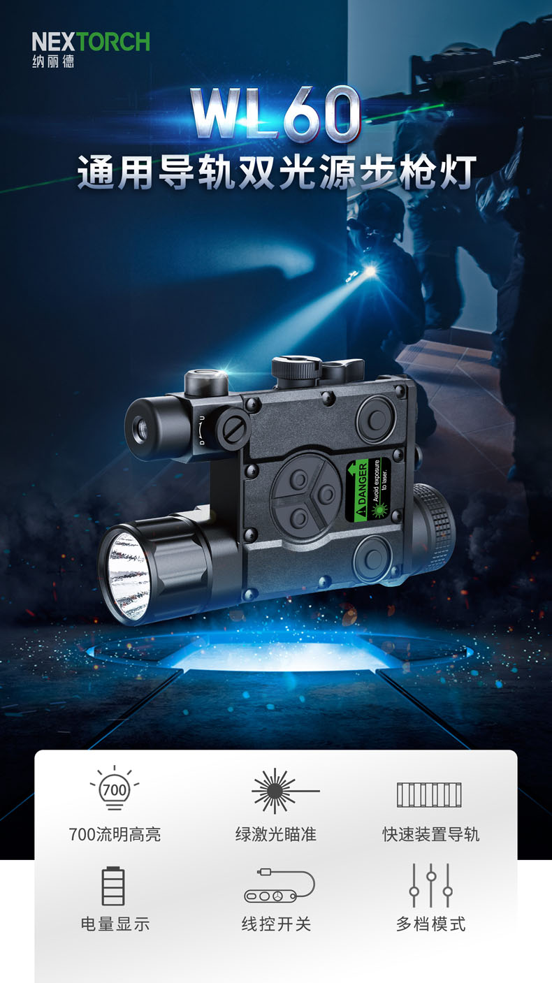 WL60是一款白光照明+绿激光瞄准二合一的步枪灯,白光高达700流明;独立开关设计,操作简单直观,高压环境下也可准确点亮;高-低双档位+战术爆闪设置,适用多样化环境;兼容线控开关,操作逻辑与灯体一致,快速切换模式;采用创新性可调节导轨锁定结构,适配所有标准皮轨;兼容1节18650可充电式锂离子电池以及2节耐低温CR123A电池,满足不同环境下的用电需求。