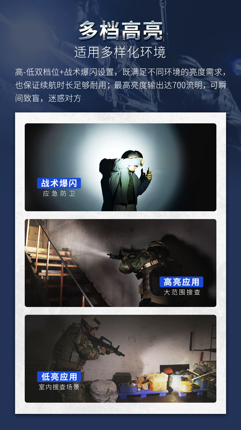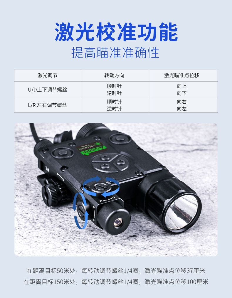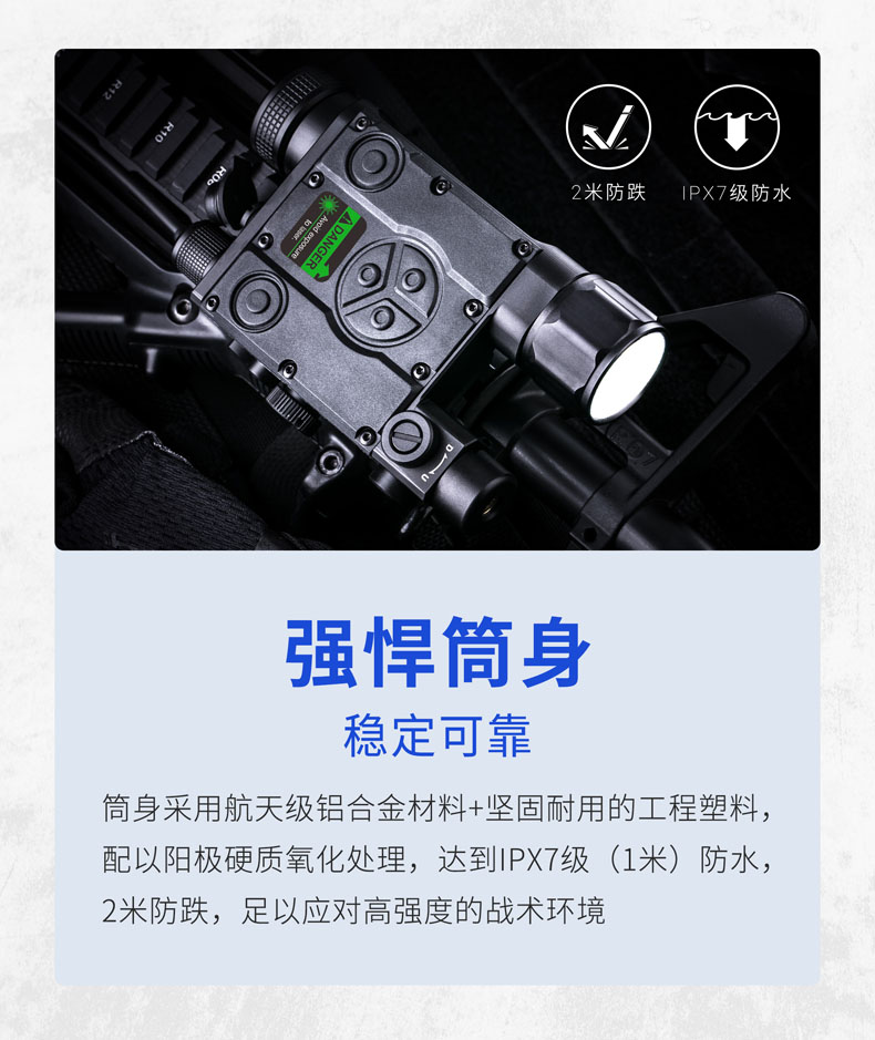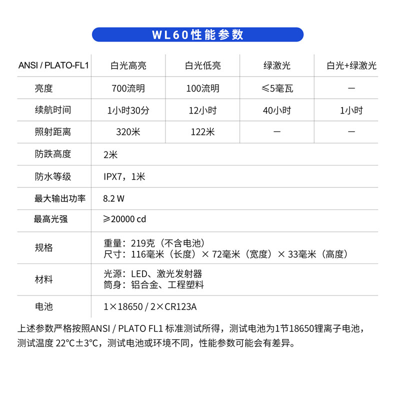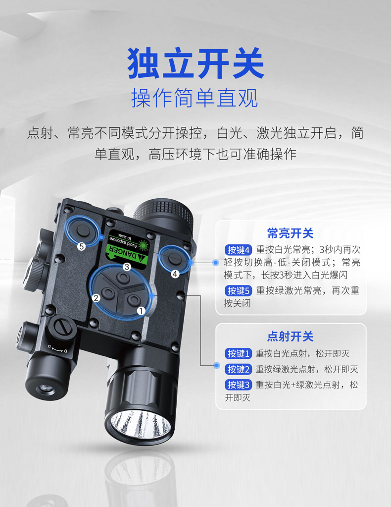 WL60是一款白光照明+绿激光瞄准二合一的步枪灯,白光高达700流明;独立开关设计,操作简单直观,高压环境下也可准确点亮;高-低双档位+战术爆闪设置,适用多样化环境;兼容线控开关,操作逻辑与灯体一致,快速切换模式;采用创新性可调节导轨锁定结构,适配所有标准皮轨;兼容1节18650可充电式锂离子电池以及2节耐低温CR123A电池,满足不同环境下的用电需求。