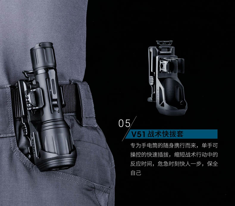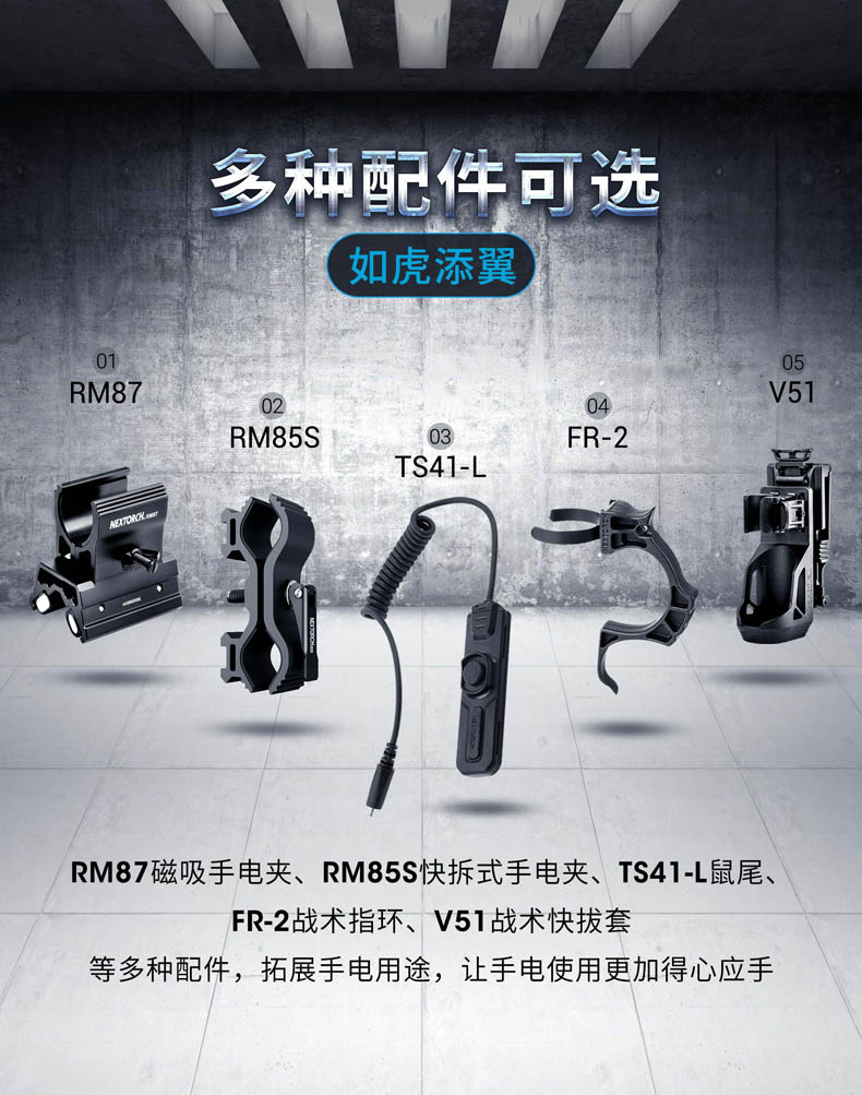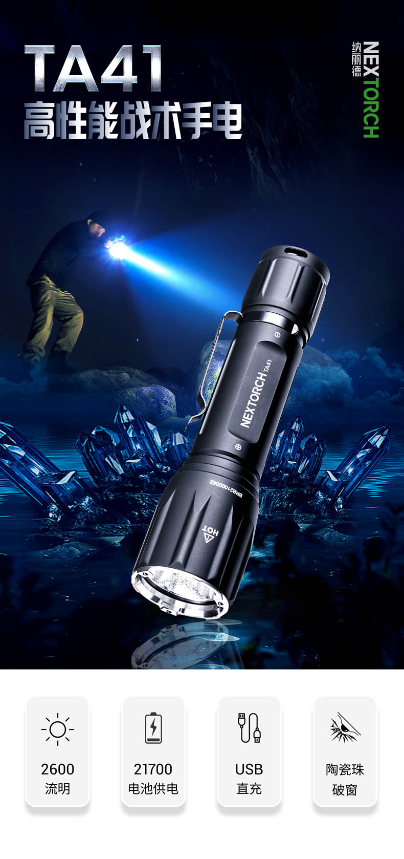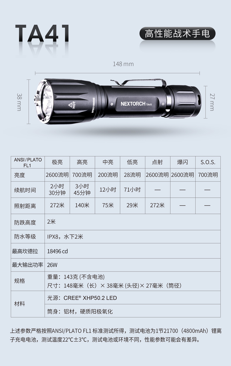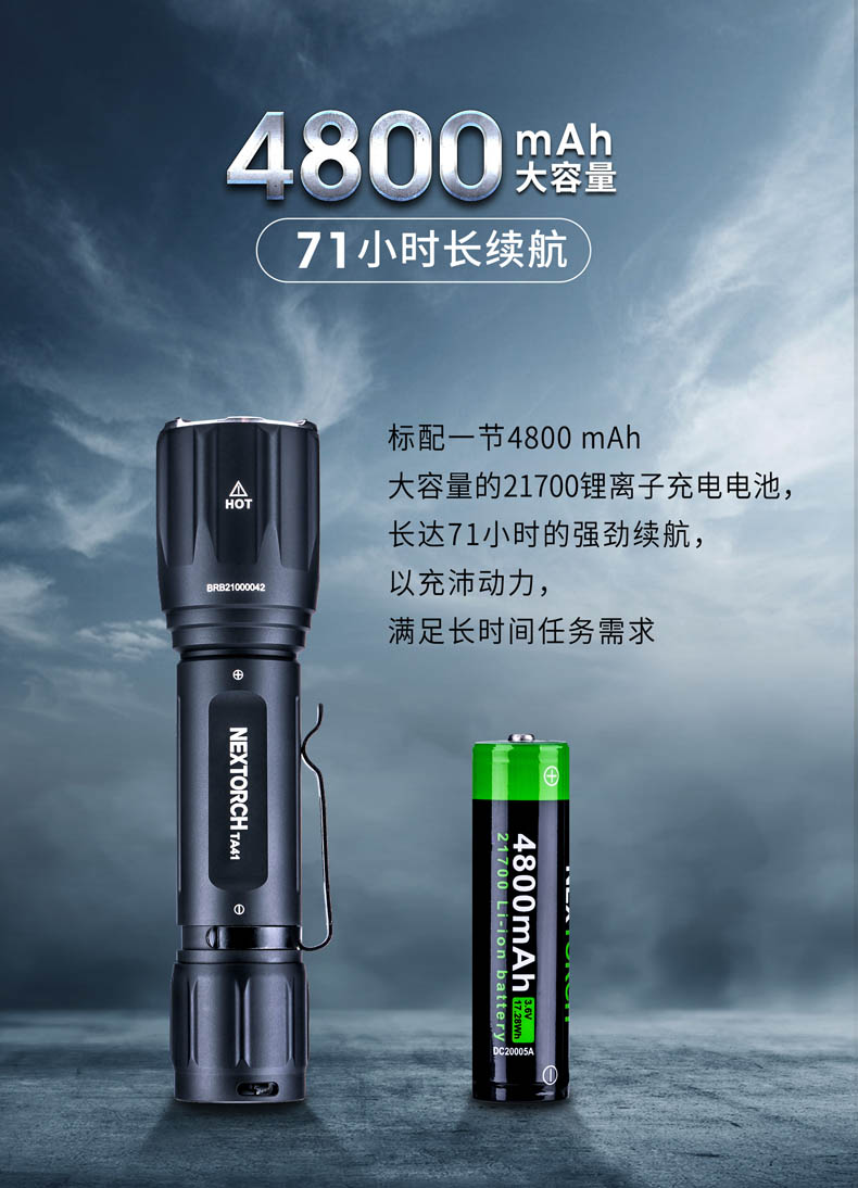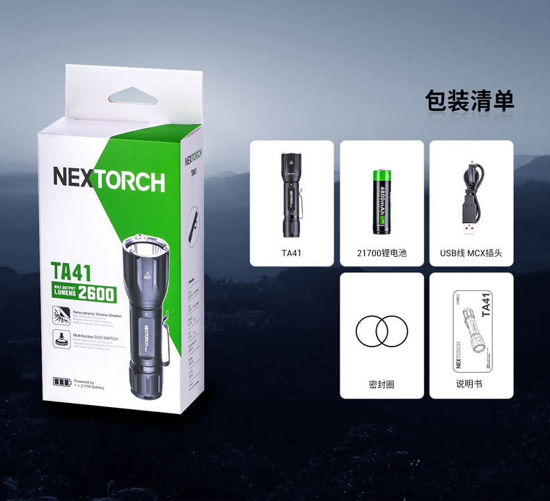 纳丽德TA41高性能战术手电,精选CREE XHP50.2 LED,输出2600流明夺目强光,272米强悍远射;标配一节4800 mAh大容量的21700锂离子充电电池,长达71小时的强劲续航;RM85S手电夹、TS41-L鼠尾、FR-2战术指环、V51战术快拔套等多种配件,拓展手电用途;陶瓷珠攻击头 破窗有效,防卫有道……
