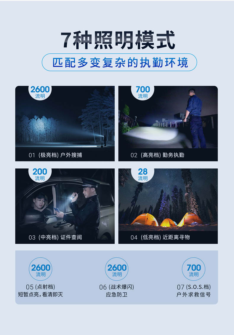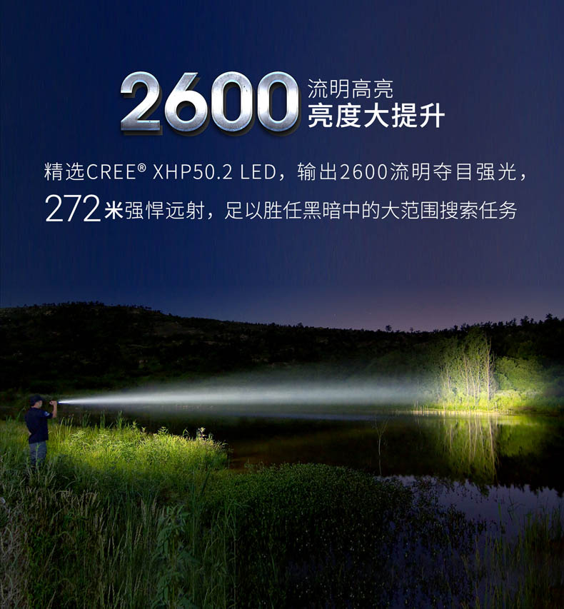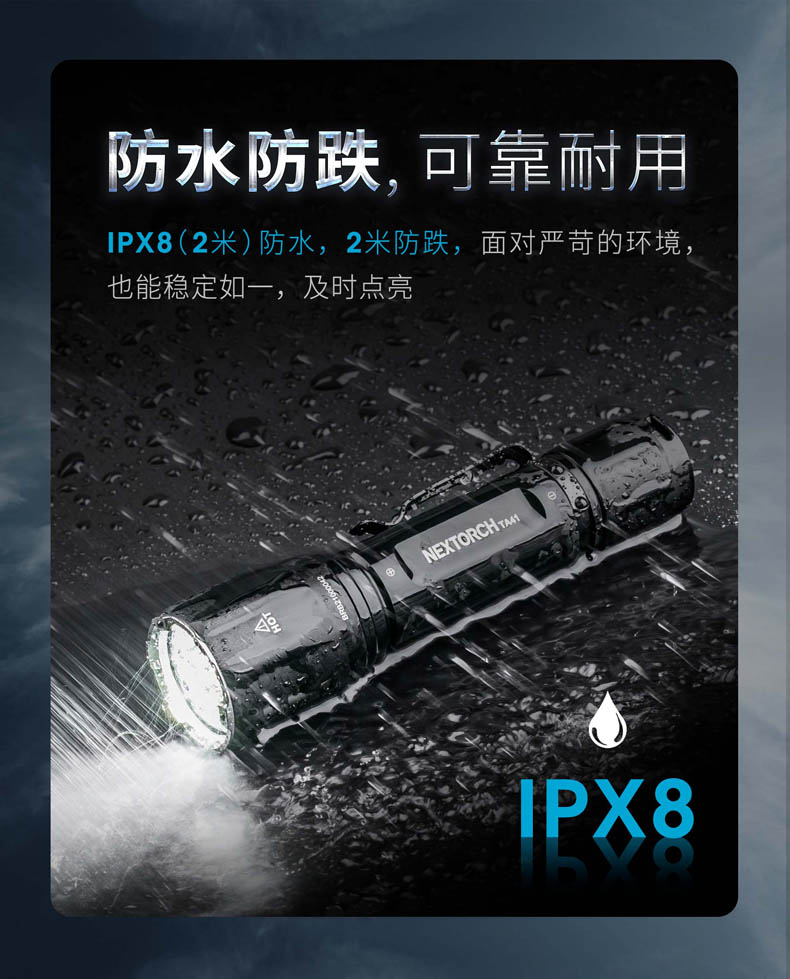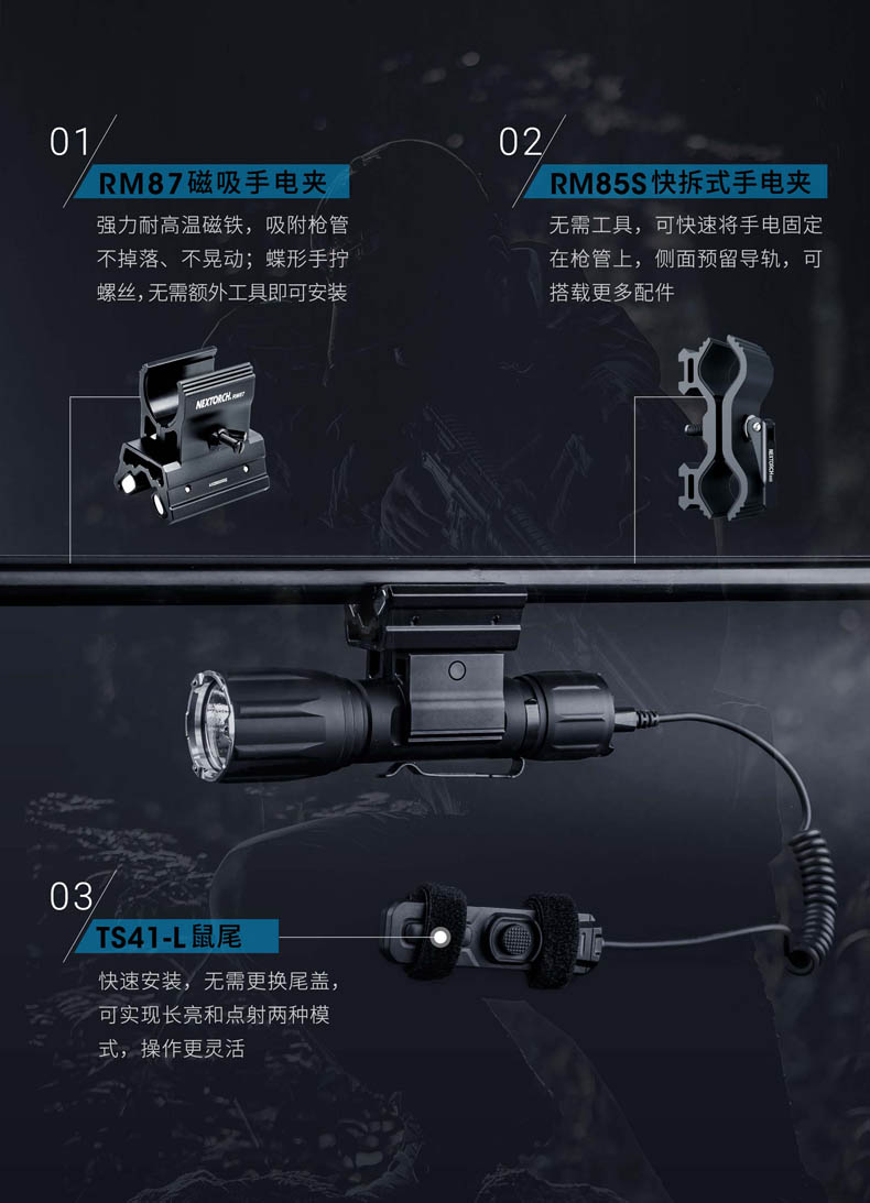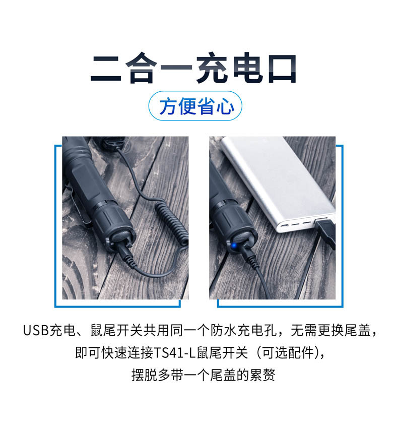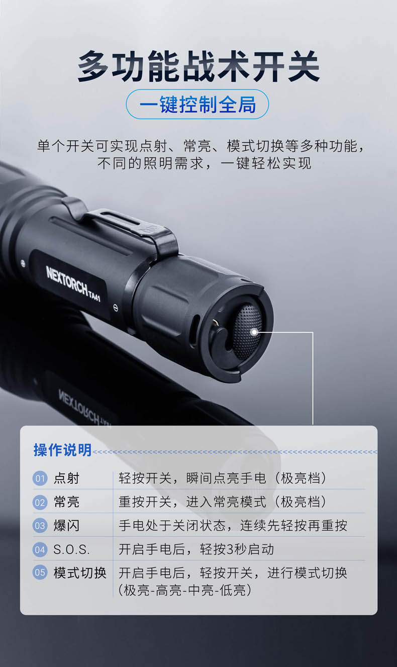 纳丽德TA41高性能战术手电,精选CREE XHP50.2 LED,输出2600流明夺目强光,272米强悍远射;标配一节4800 mAh大容量的21700锂离子充电电池,长达71小时的强劲续航;RM85S手电夹、TS41-L鼠尾、FR-2战术指环、V51战术快拔套等多种配件,拓展手电用途;陶瓷珠攻击头 破窗有效,防卫有道……