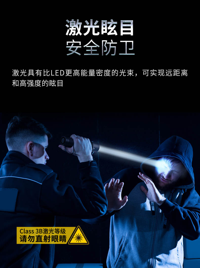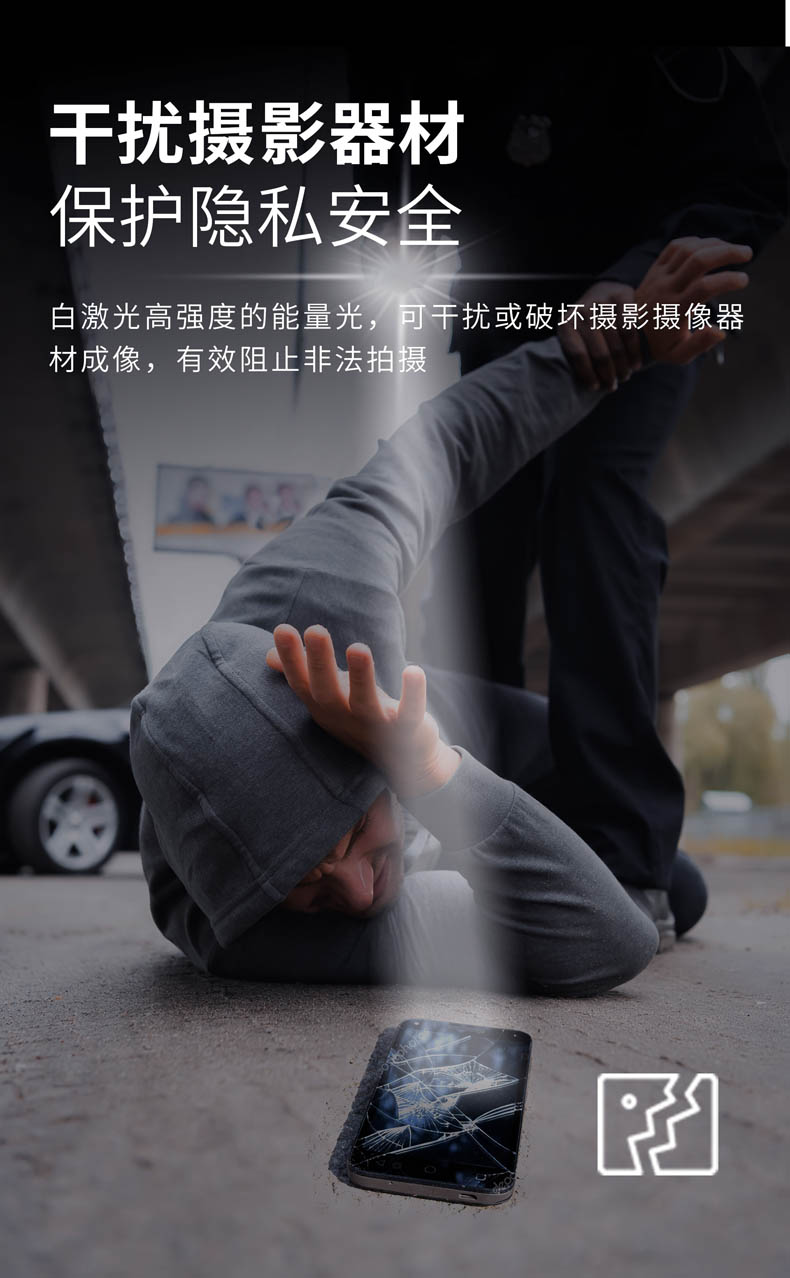 L10/L10 MAX具有超高性价比,沿袭白激光的高亮度和高准直性,聚光远射达到1200米。高密度的光束具有指向性,实现目标精准追踪和远距离、高强度的眩目,也可干扰、甚至破坏摄影器材成像。